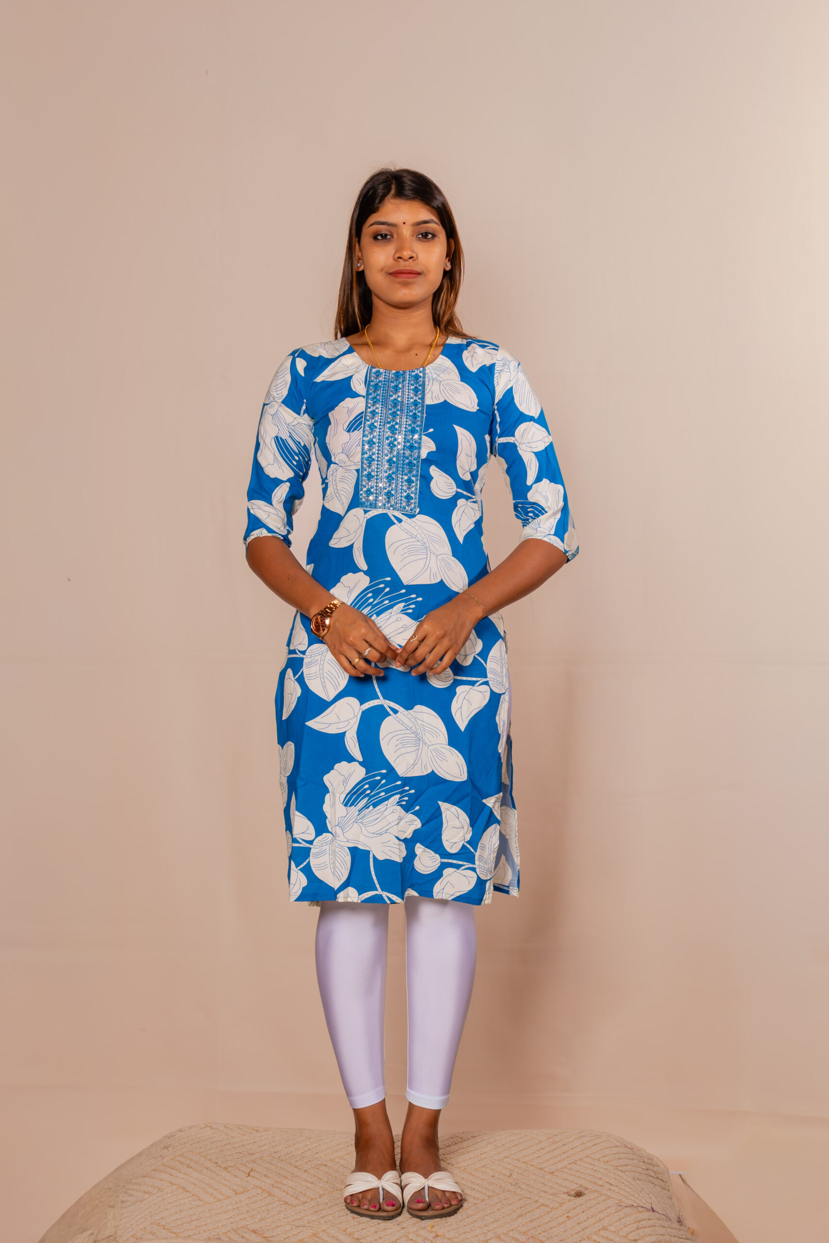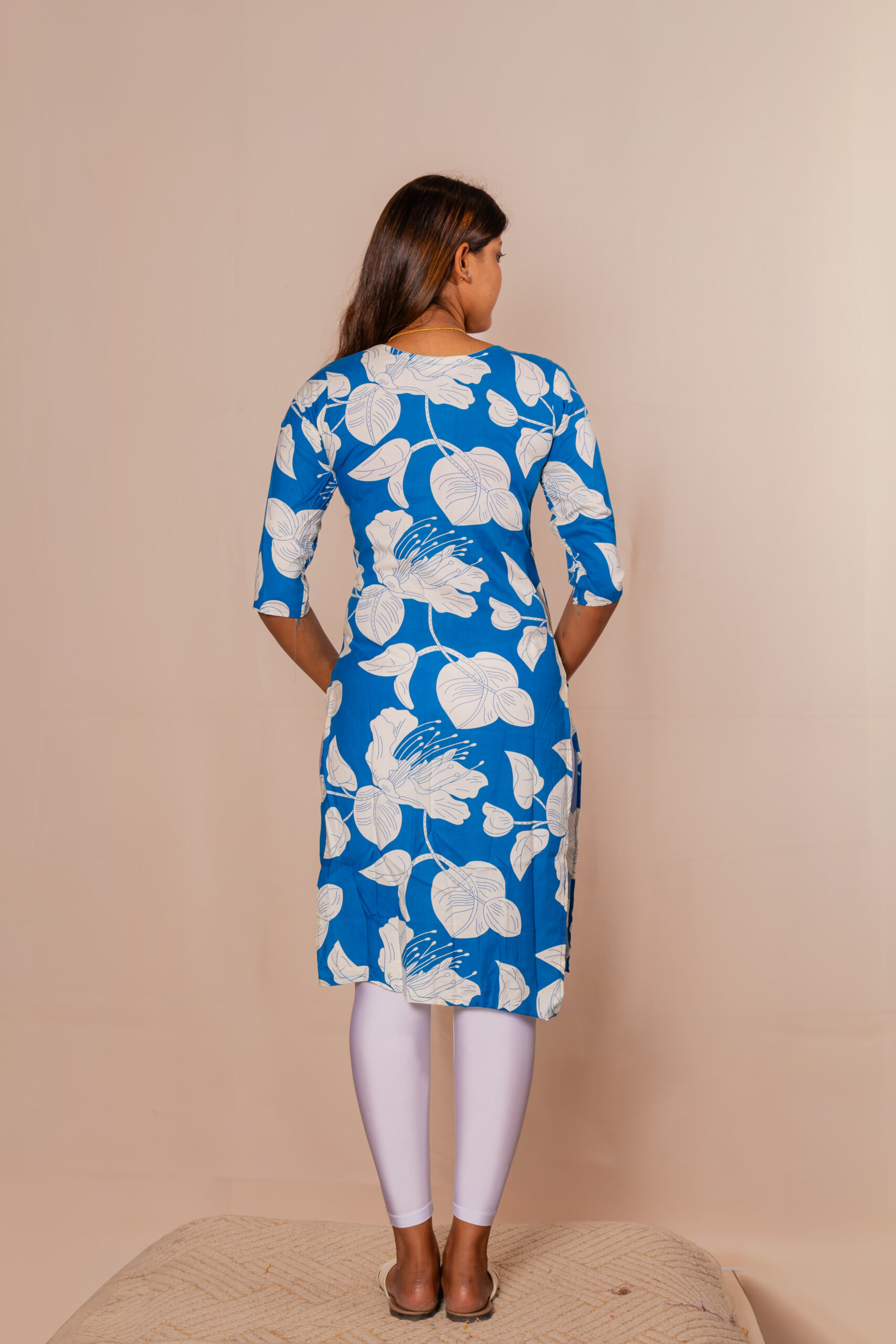 Elevate your everyday style with this vibrant blue printed kurti top, designed to make a bold yet elegant statement. Crafted from soft, breathable fabric, it ensures all-day comfort while keeping you effortlessly chic. The eye-catching white floral patterns add a touch of freshness and charm, perfect for a lively look. Featuring a neatly designed round neckline with a stylish front panel, it enhances your overall appeal. The three-quarter sleeves provide a balanced blend of comfort and sophistication. Pair it with leggings or pants for a complete, graceful outfit.