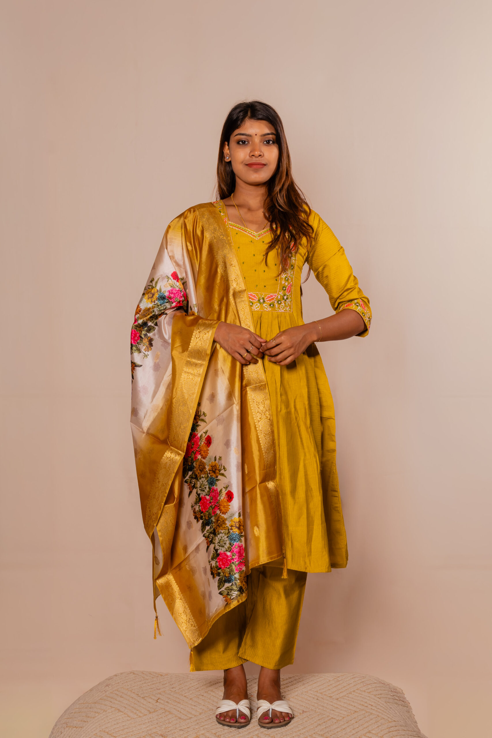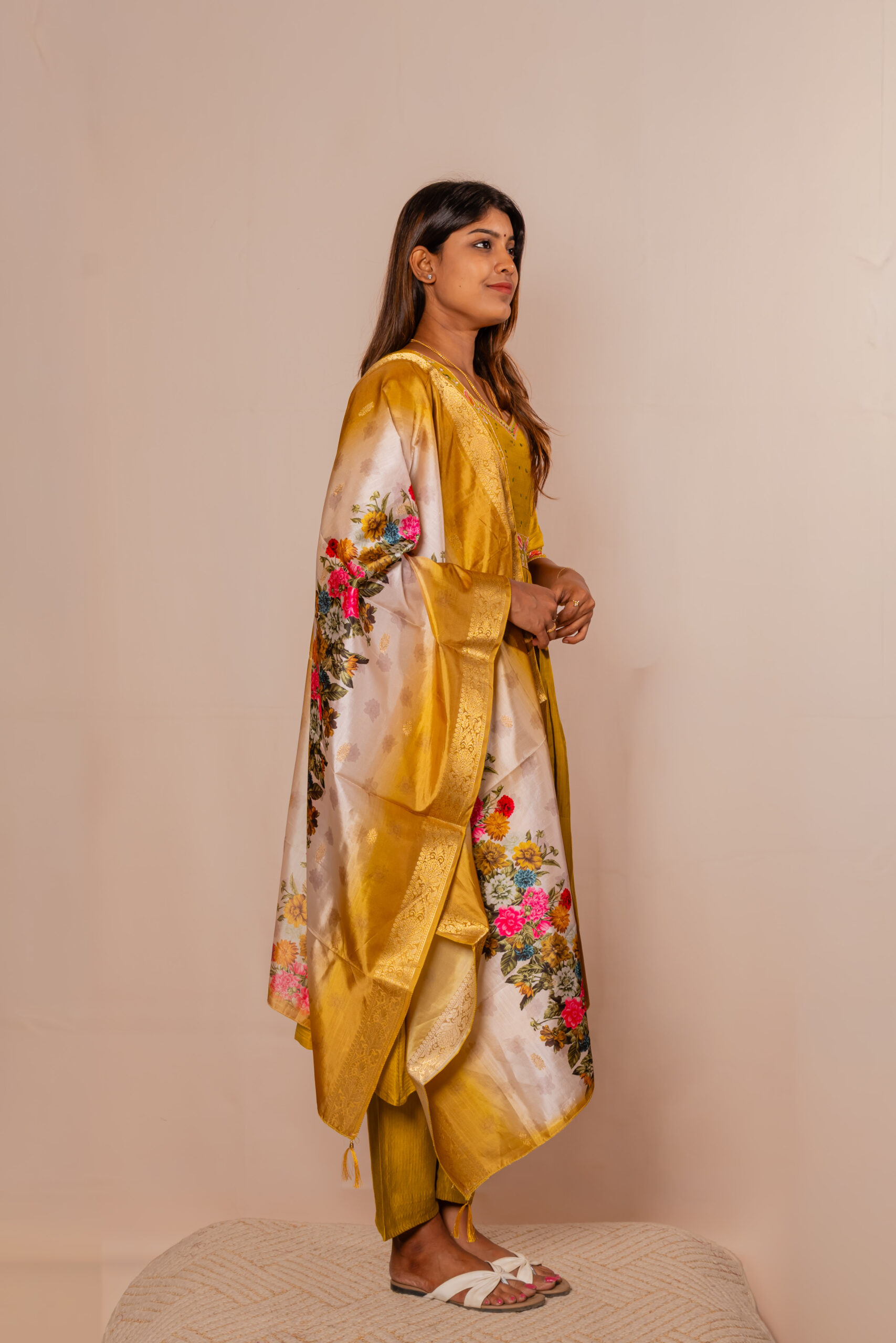 The highlight of the outfit is the beautifully crafted dupatta, adorned with vibrant floral prints and finished with rich zari borders, adding a festive charm to the ensemble.