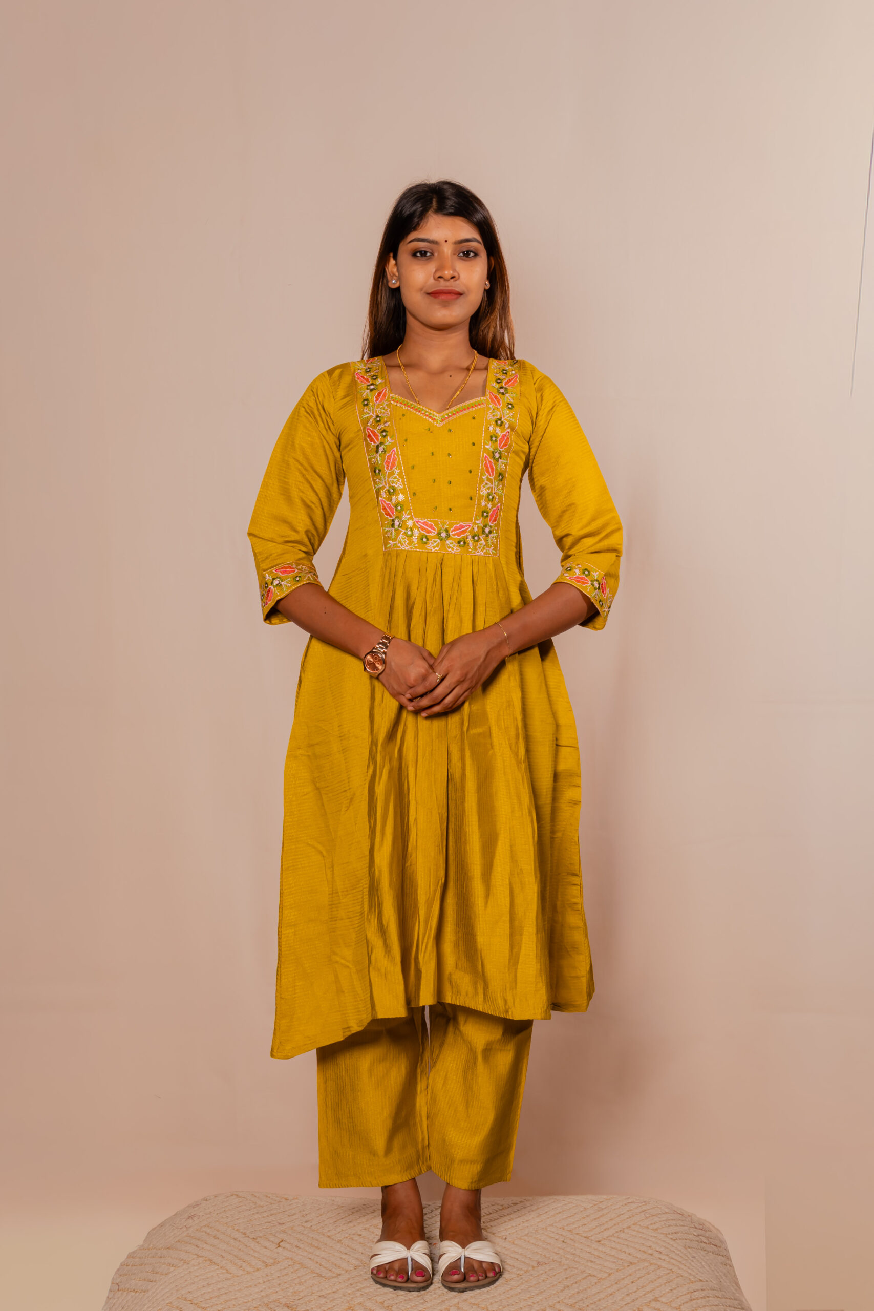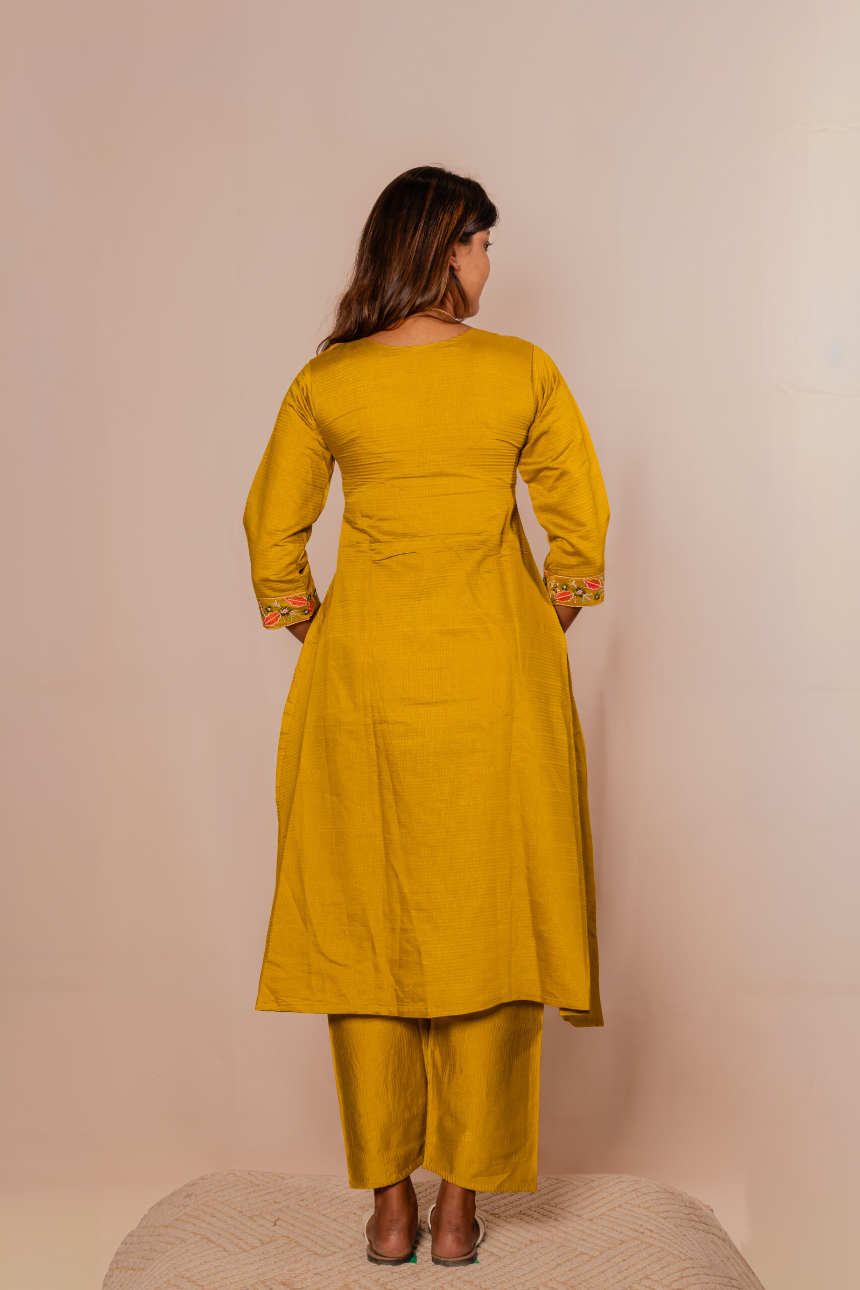 Bring elegance to your wardrobe with this stunning mustard yellow kurti set, designed to blend tradition with modern style. The kurti features subtle detailing on the neckline and sleeves, offering a refined and graceful look. Paired with matching straight-fit pants, this set ensures both comfort and sophistication.
