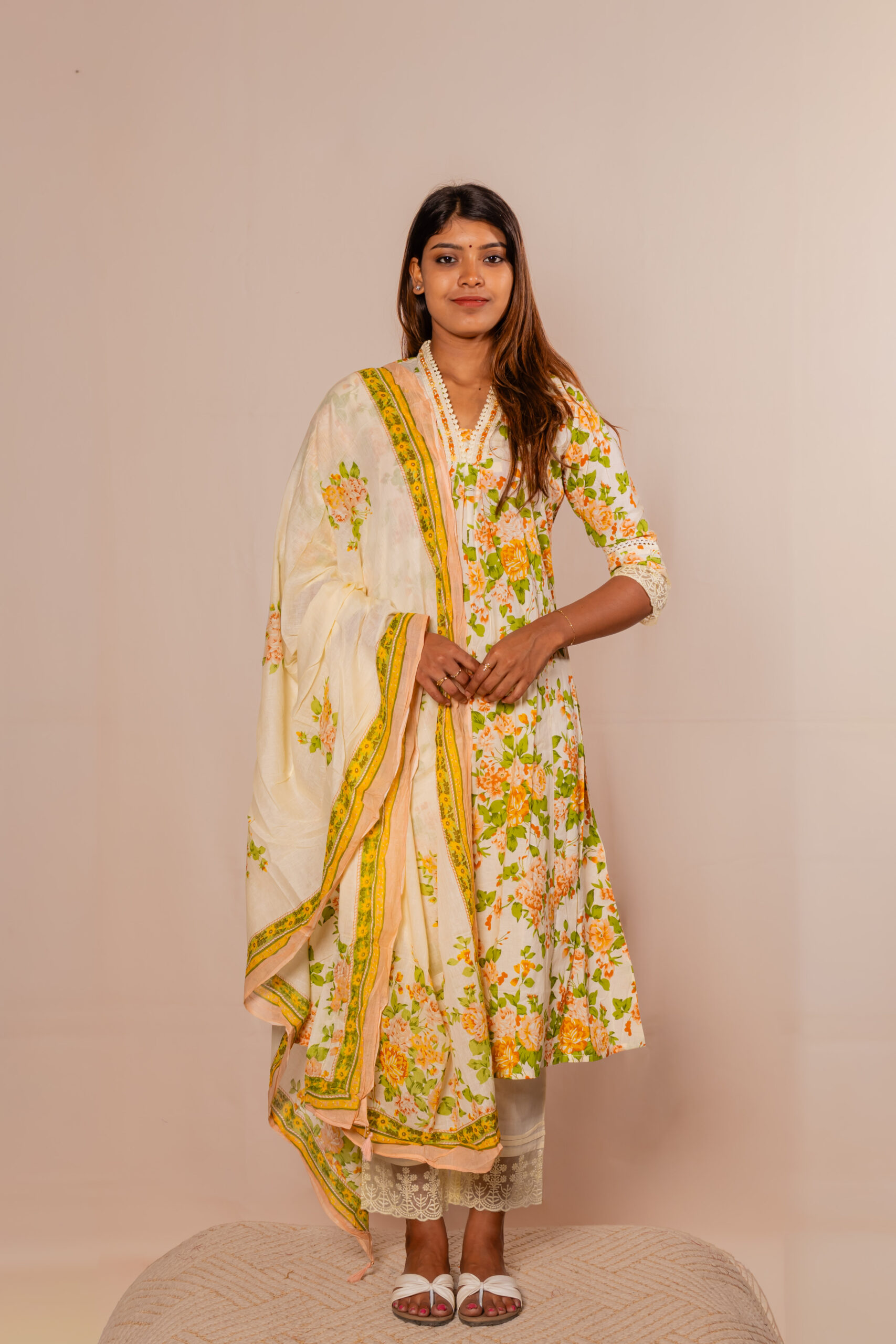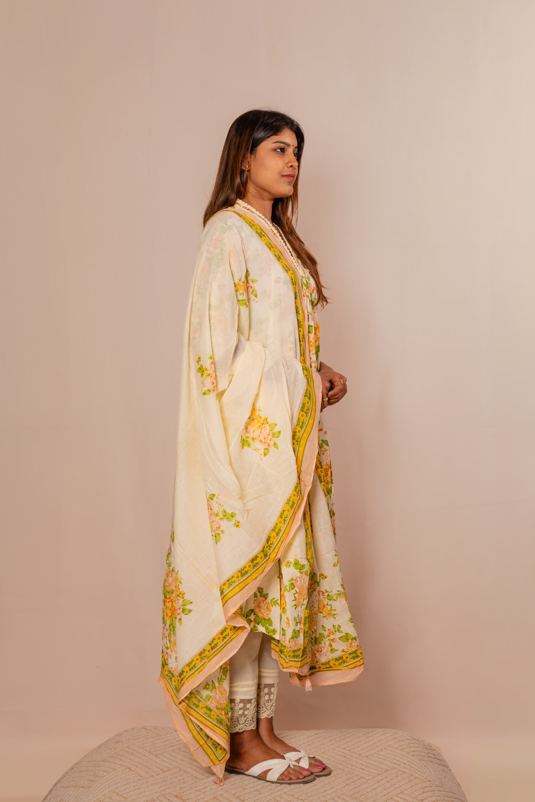 Elegant cream kurti set with yellow floral prints, paired with matching bottoms and a lightweight dupatta. Perfect for casual wear and summer occasions.