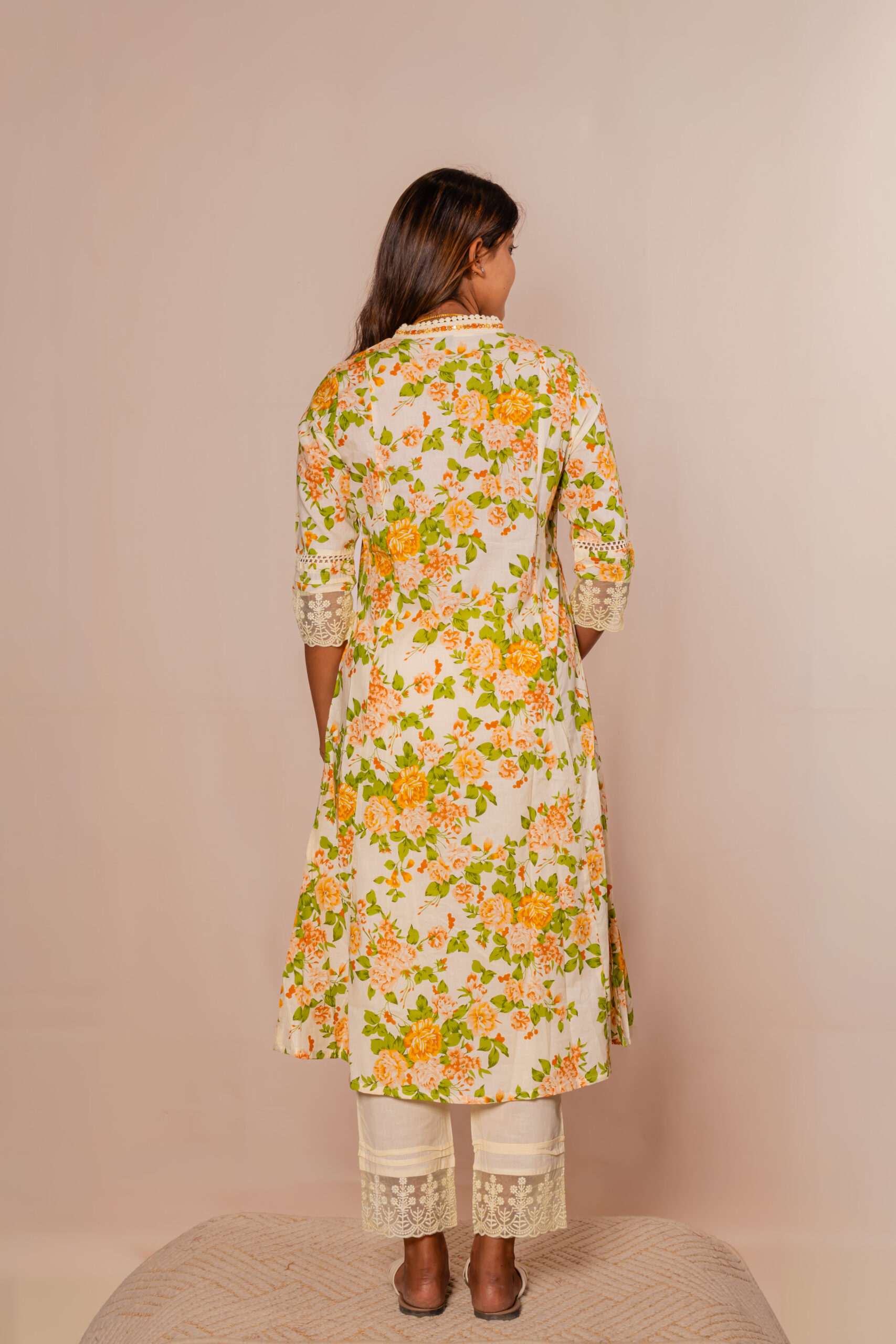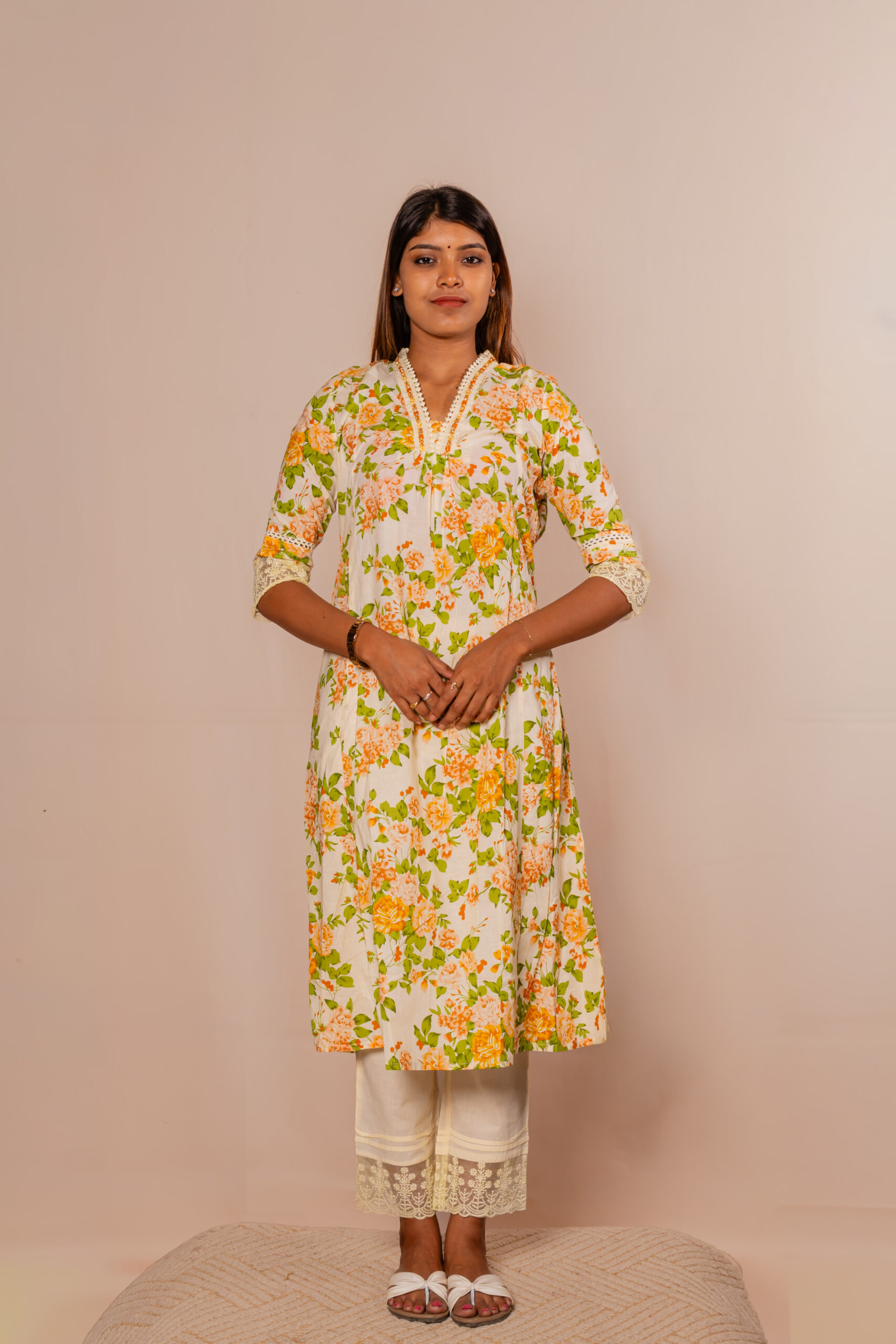 Add a touch of freshness and elegance to your wardrobe with this beautifully designed floral Anarkali kurti set. Featuring a soft cream base adorned with vibrant yellow and green floral prints, this outfit offers a perfect blend of comfort and charm.