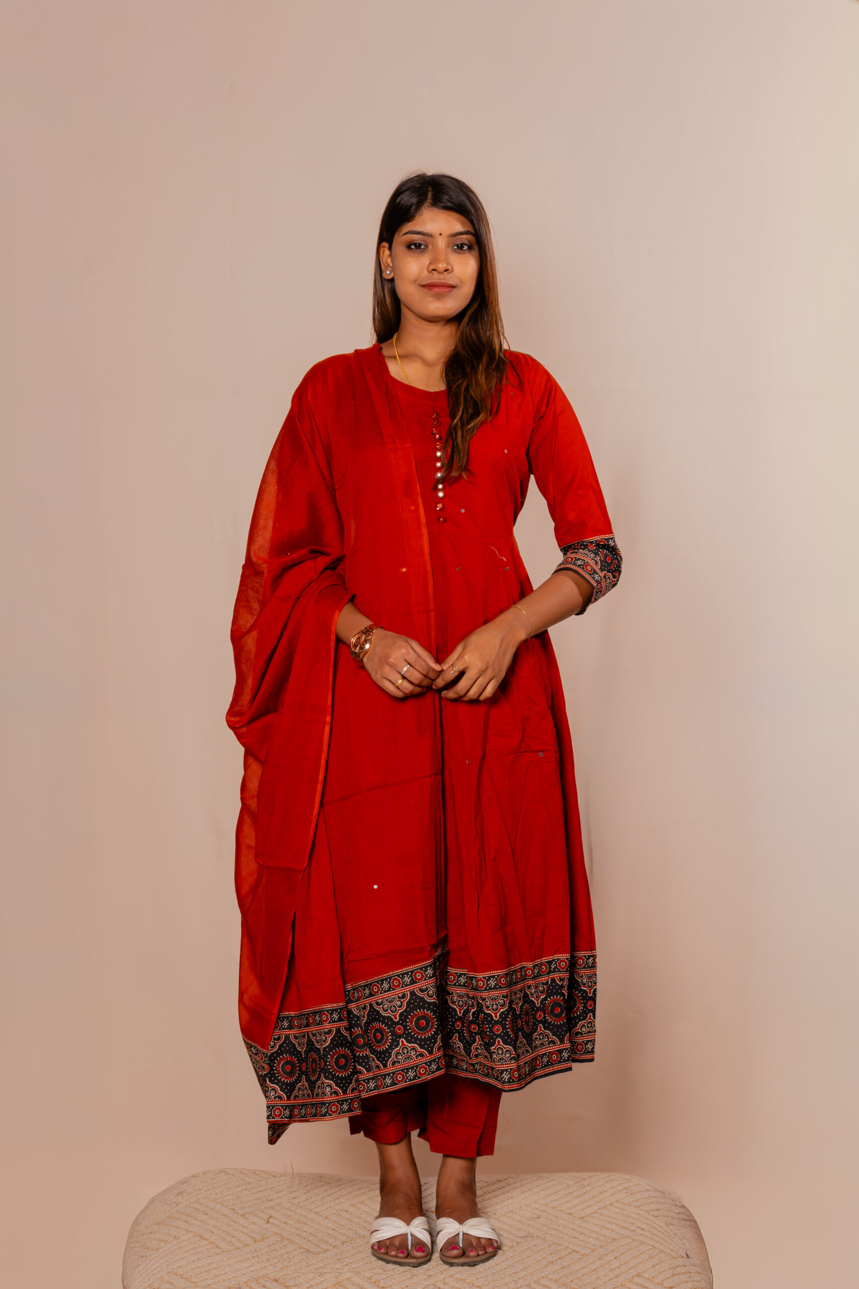 Add a touch of elegance to your everyday style with this graceful crimson red kurti set. Designed with a simple yet sophisticated look, the kurti features a straight silhouette with button detailing on the yoke for a refined finish. The highlight of the outfit is the beautifully printed border on the hem and sleeves, adding a subtle ethnic charm. Crafted from soft and breathable fabric, it ensures all-day comfort. Paired with a matching bottom and dupatta, this set offers a complete and polished look for any occasion.