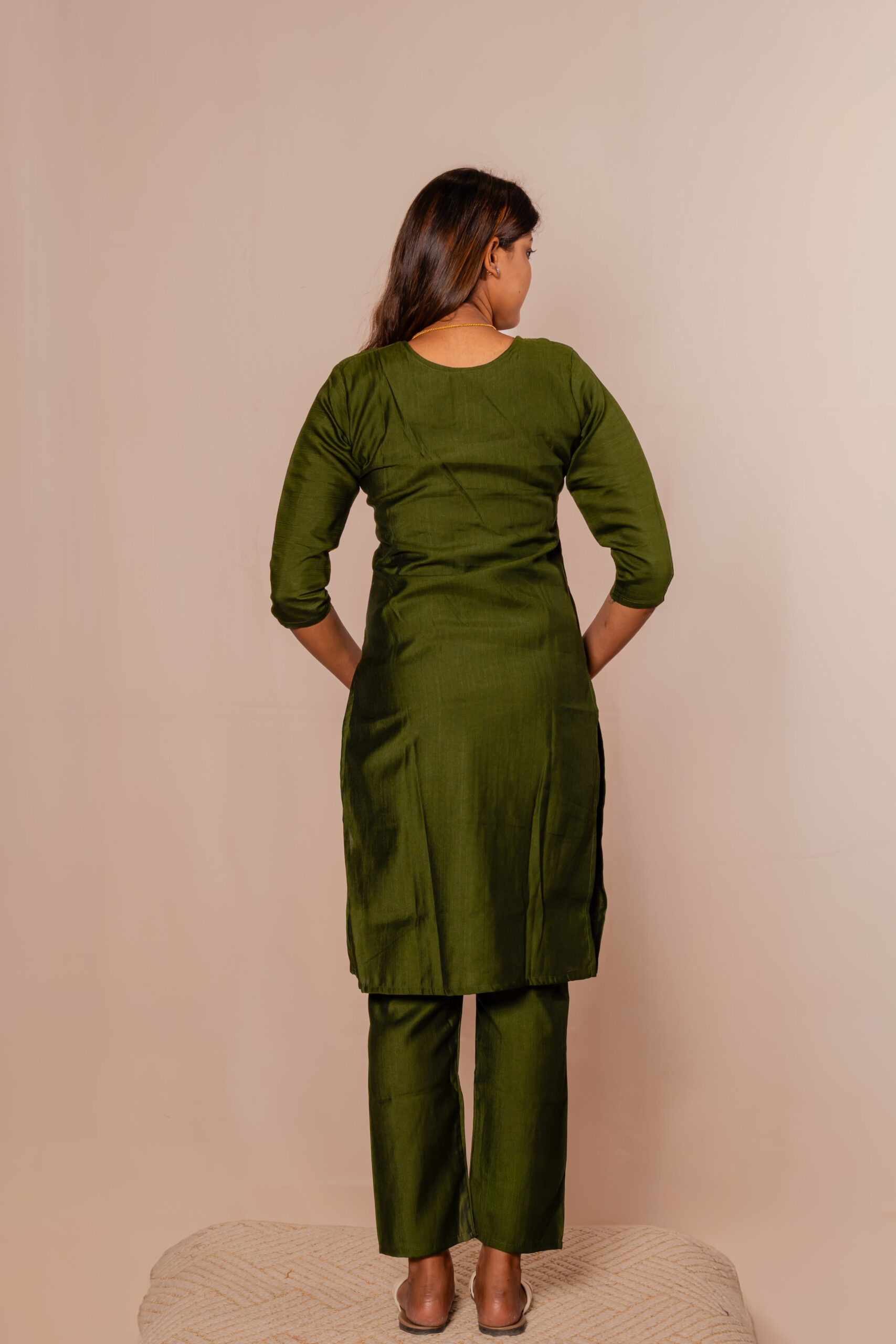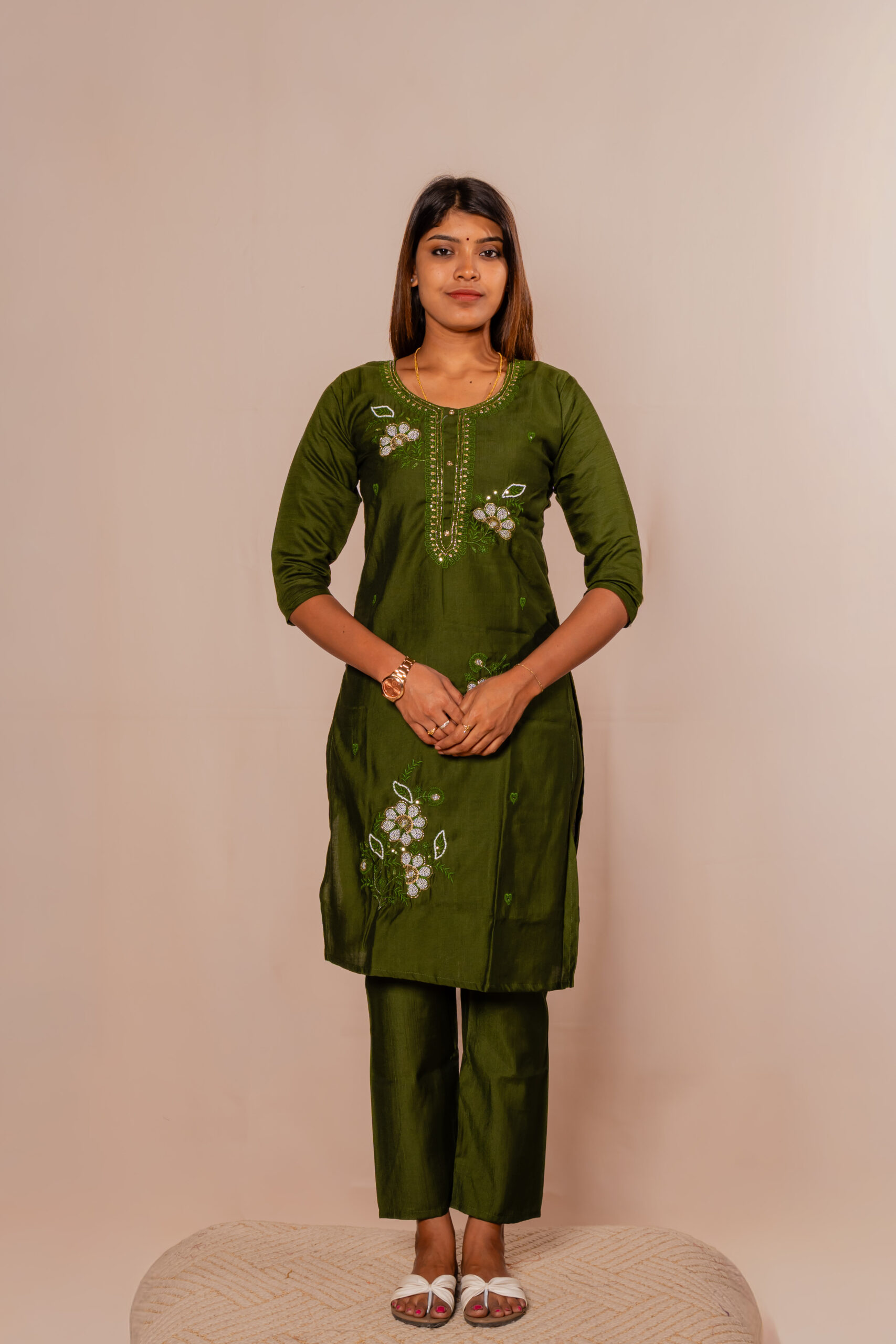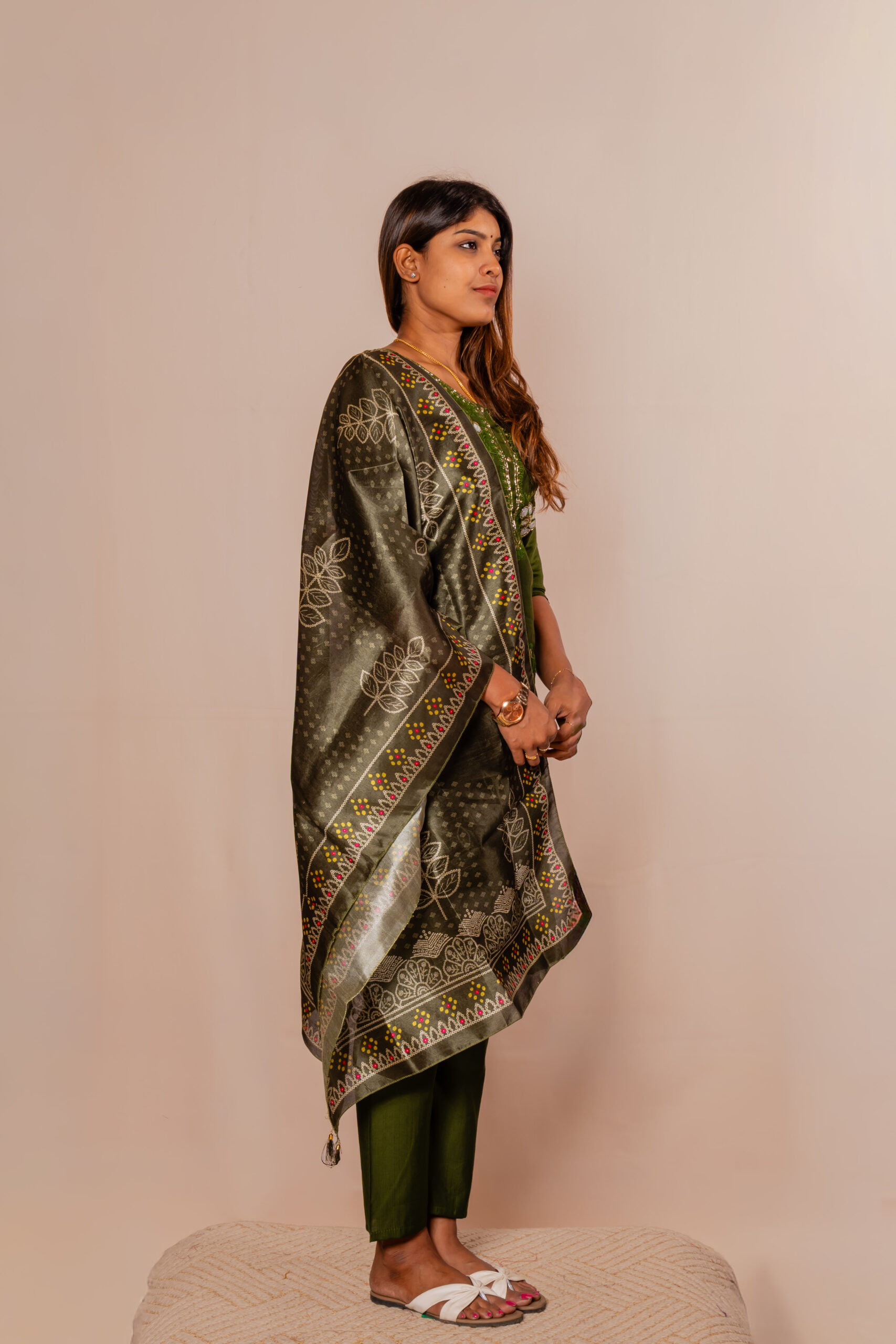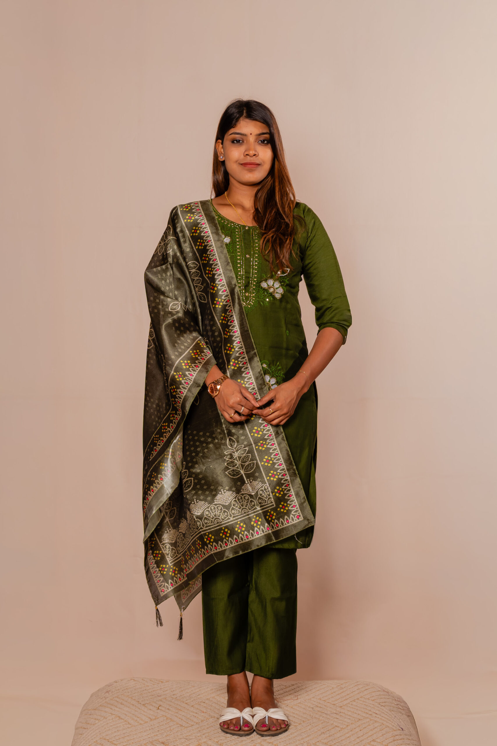 Step into effortless elegance with this graceful chudidhar set, designed with subtle floral embroidery for a refined look. The straight-cut chudidhar features delicate detailing on the neckline, adding a touch of sophistication. Paired with matching straight-fit pants, it offers a clean and flattering silhouette. The soft, printed dupatta with intricate borders enhances the overall charm. Crafted from lightweight, breathable fabric, it ensures comfort throughout the day. A perfect blend of minimal style and timeless appeal.