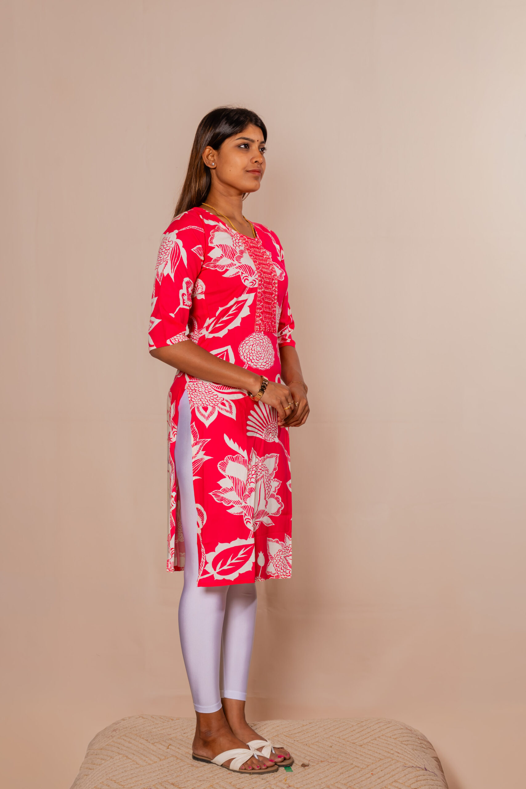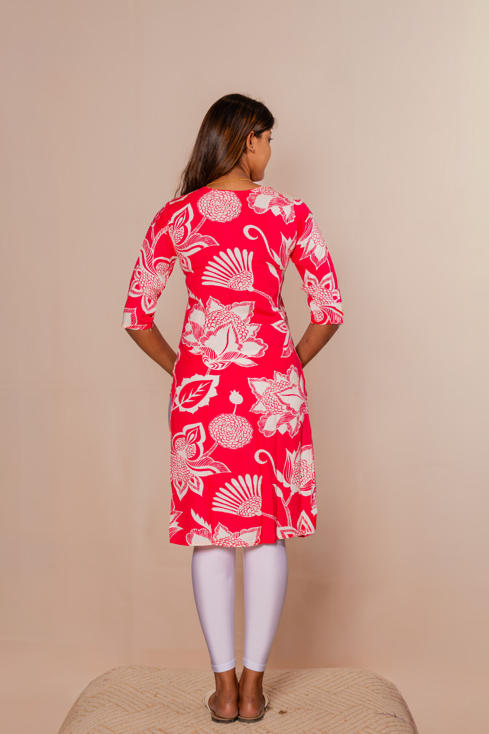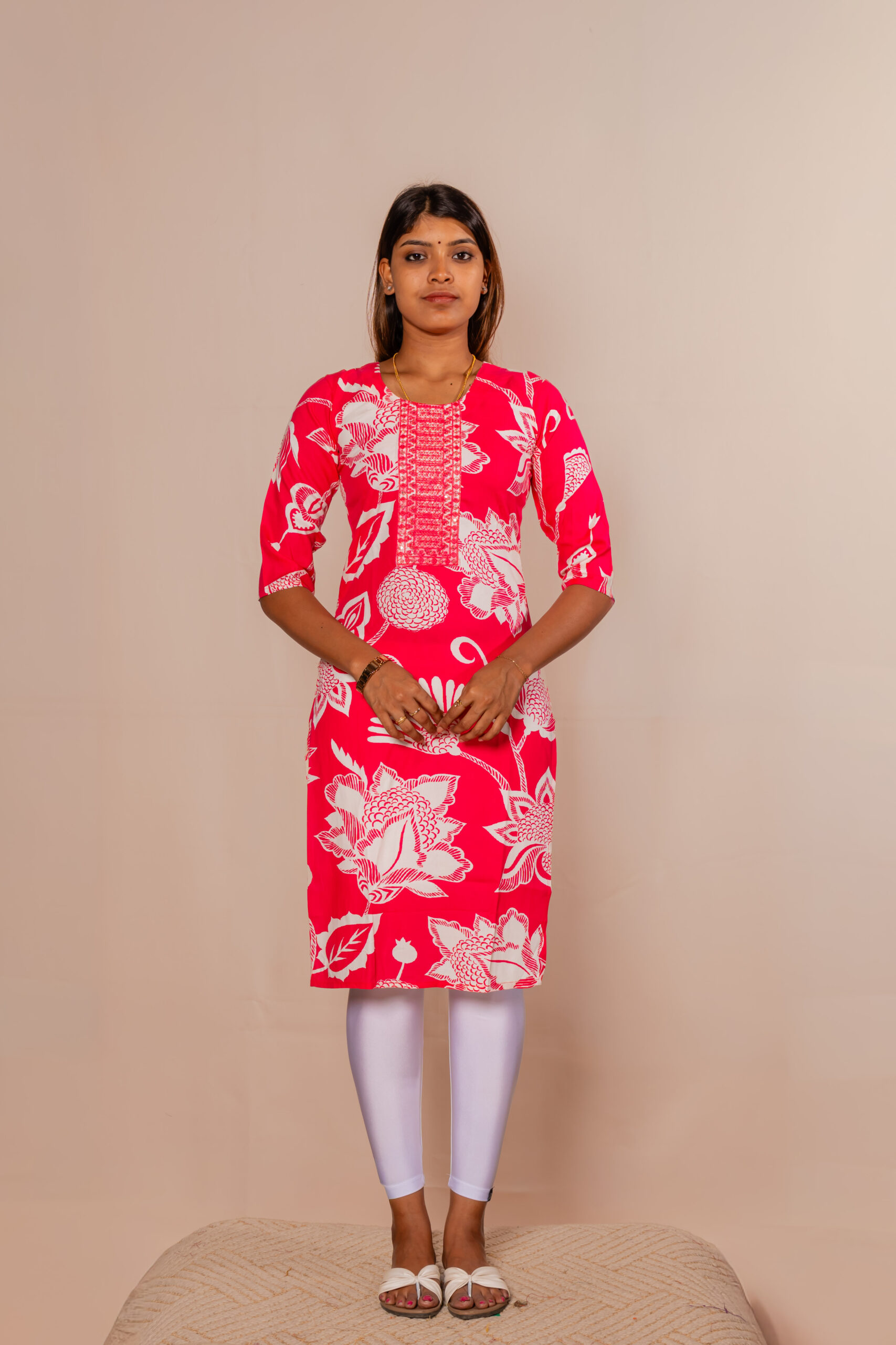 Elevate your everyday style with this vibrant pink printed kurti top, designed to make a bold yet elegant statement. Crafted from soft, breathable fabric, it ensures all-day comfort while keeping you effortlessly chic. The eye-catching white floral patterns add a touch of freshness and charm, perfect for a lively look. Featuring a neatly designed round neckline with a stylish front panel, it enhances your overall appeal. The three-quarter sleeves provide a balanced blend of comfort and sophistication. Pair it with leggings or pants for a complete, graceful outfit.