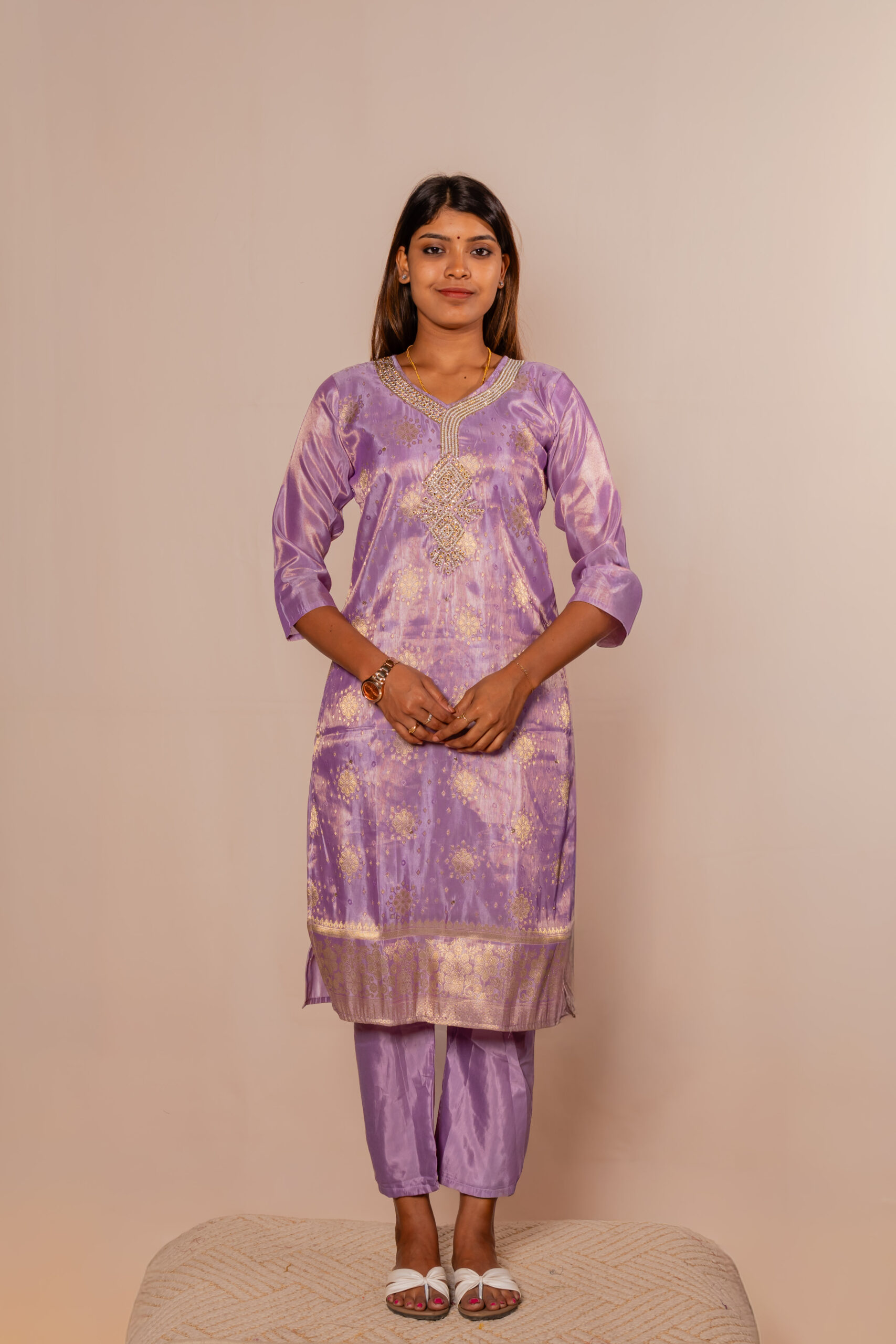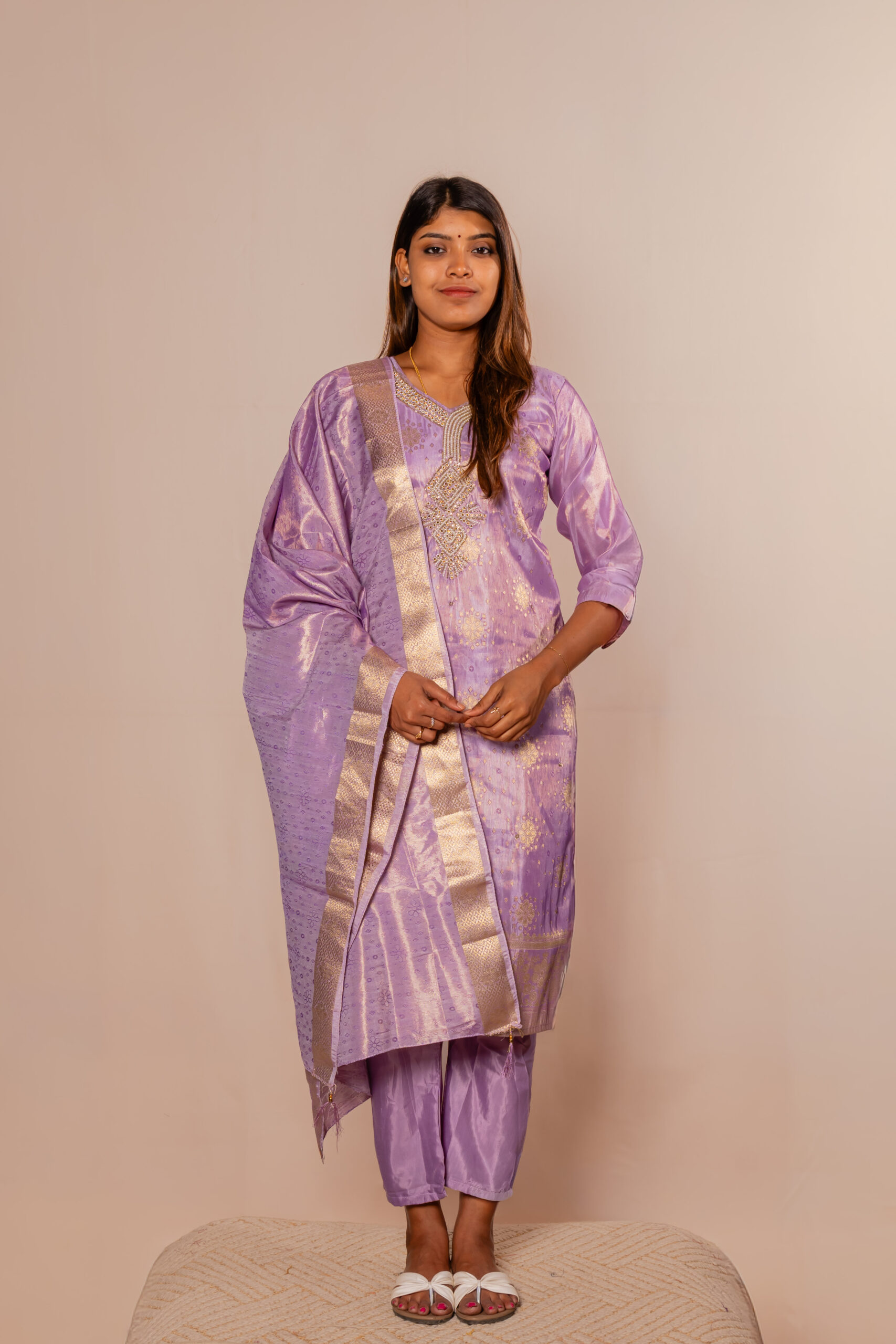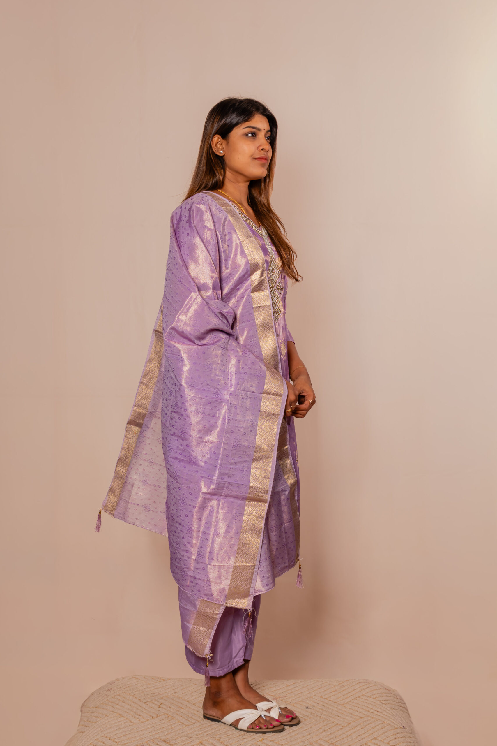 This stunning lavender kurta set showcases a graceful blend of traditional elegance and modern charm. The kurta features delicate embroidery with subtle gold accents that enhance its rich, festive appeal. Paired with matching pants, it offers a comfortable yet flattering silhouette. The coordinated dupatta with a shimmering border adds a luxurious touch to the overall look. Crafted from lustrous fabric, it brings a soft sheen that elevates its sophistication. A perfect choice for those who love refined and eye-catching ethnic wear.