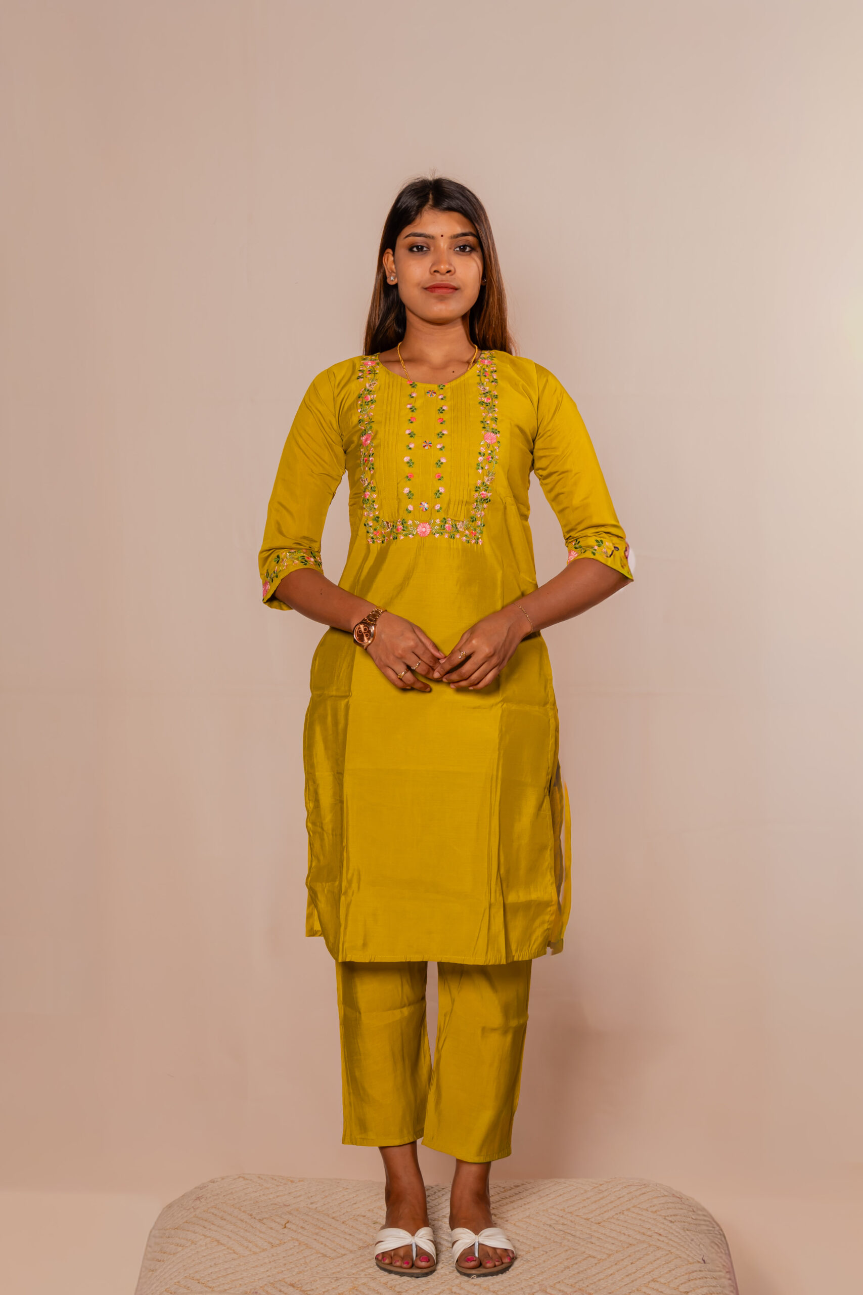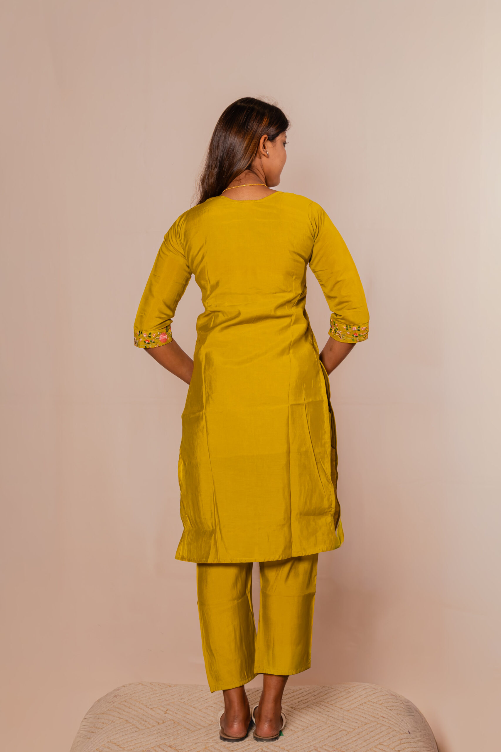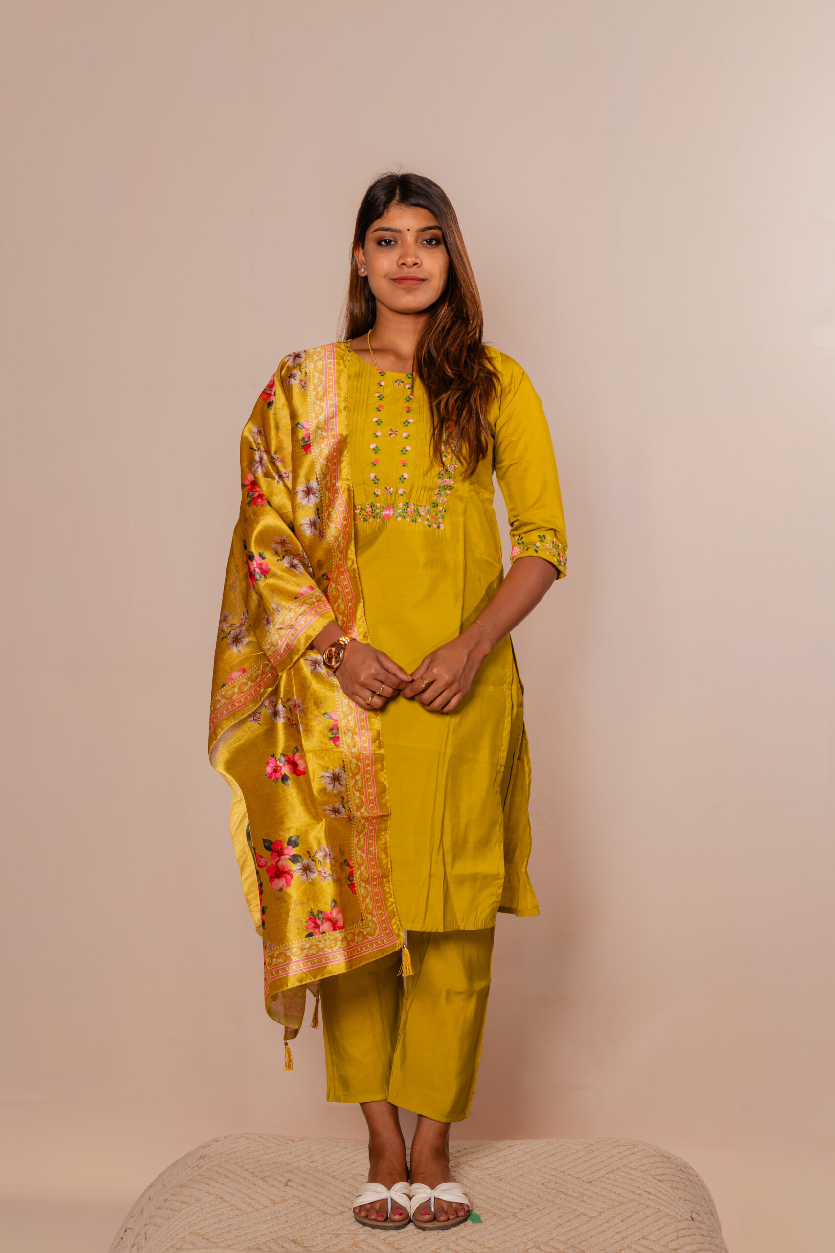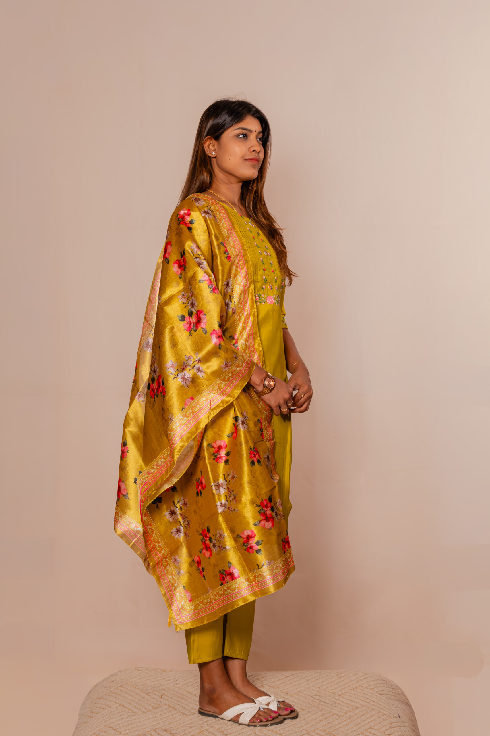 Brighten your wardrobe with this vibrant mustard yellow kurta set, perfect for cheerful and festive days. The kurta features delicate floral embroidery on the yoke and sleeves, adding a graceful handcrafted touch. Made from soft, breathable fabric, it ensures comfort throughout the day. It is paired with matching bottoms and a stunning floral printed dupatta with elegant borders for a rich look.