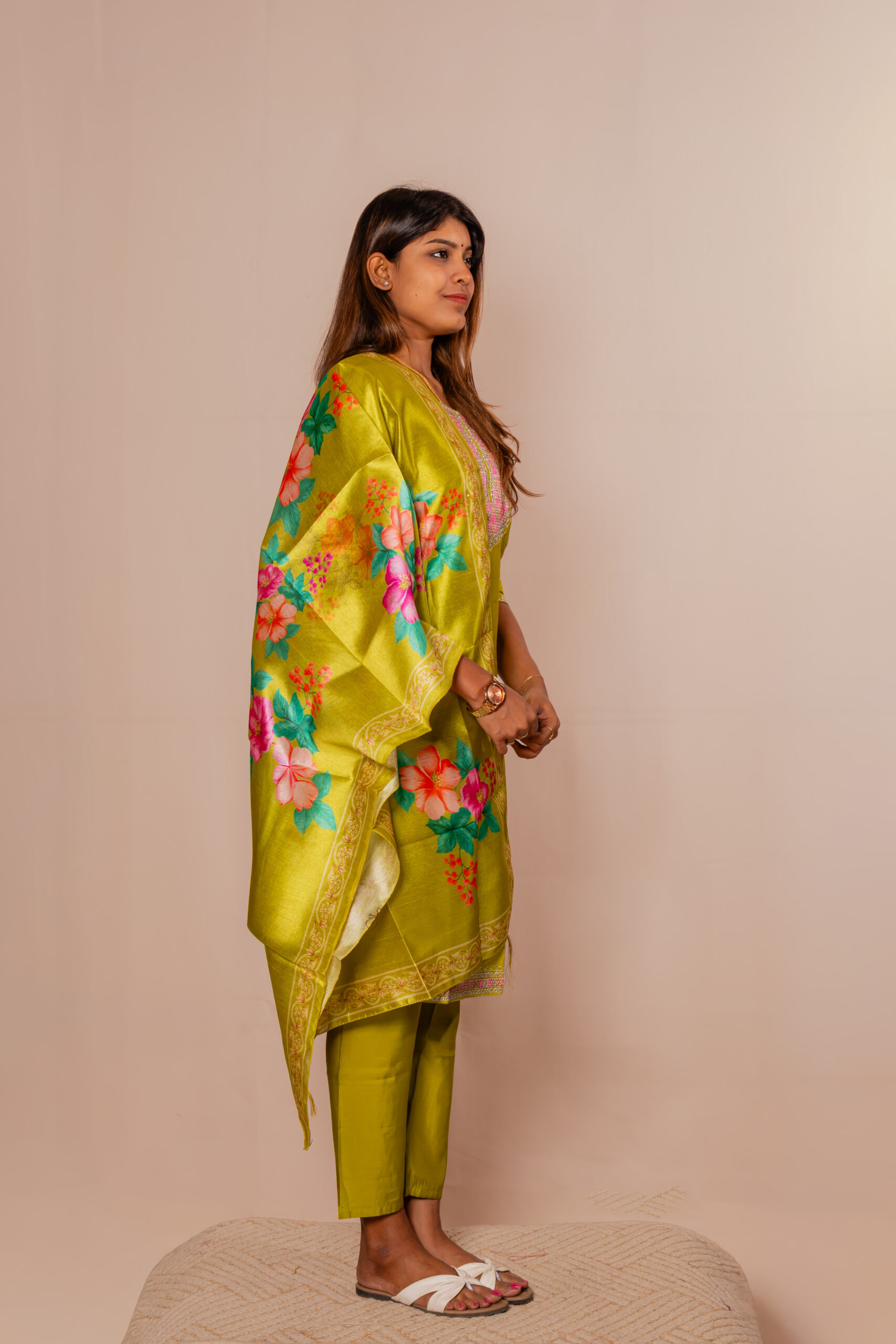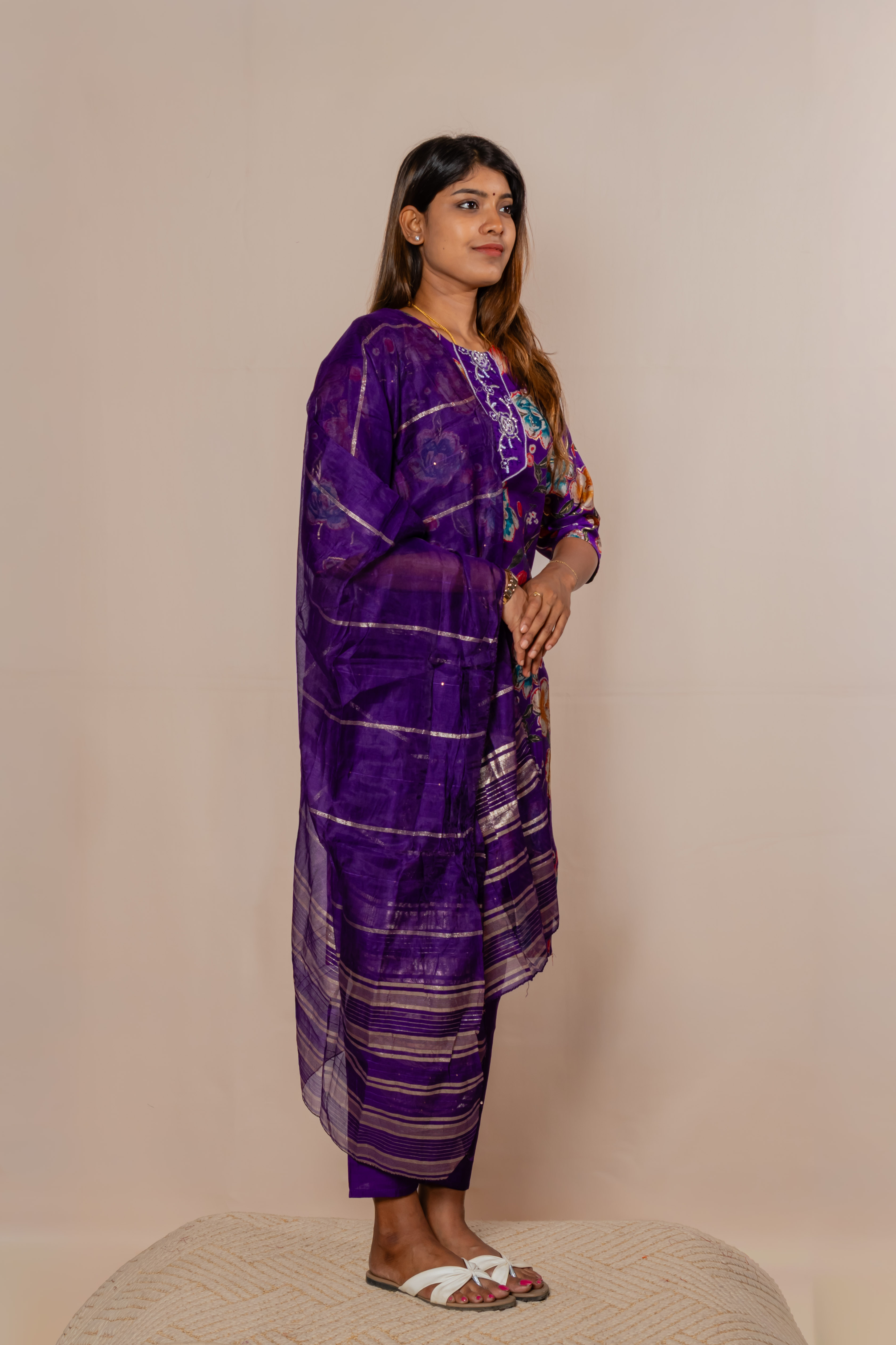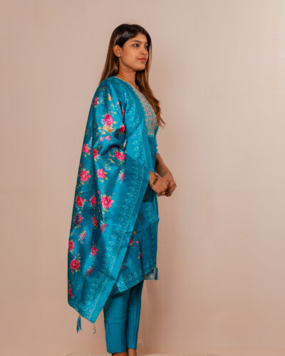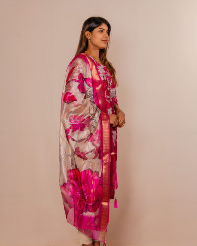 Make a striking statement with this elegant kurta set, designed for refined ethnic charm. The kurta features intricate embroidery on the neckline and sleeve hems, adding a touch of sophistication. Crafted from smooth, comfortable fabric, it offers a graceful fit for all-day wear. Paired with matching bottoms, the ensemble is enhanced by a beautifully woven floral dupatta with delicate patterns and tassel detailing.