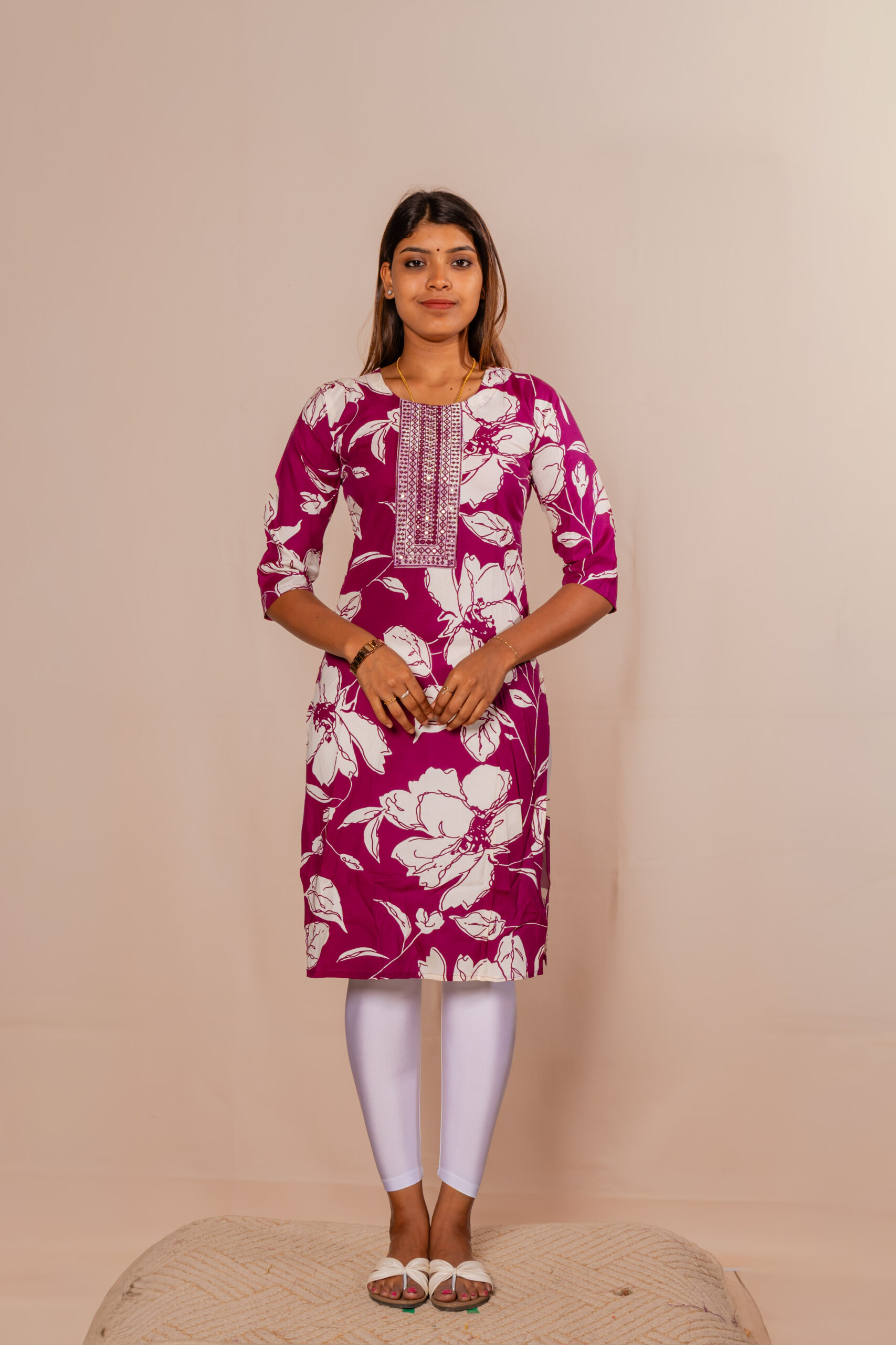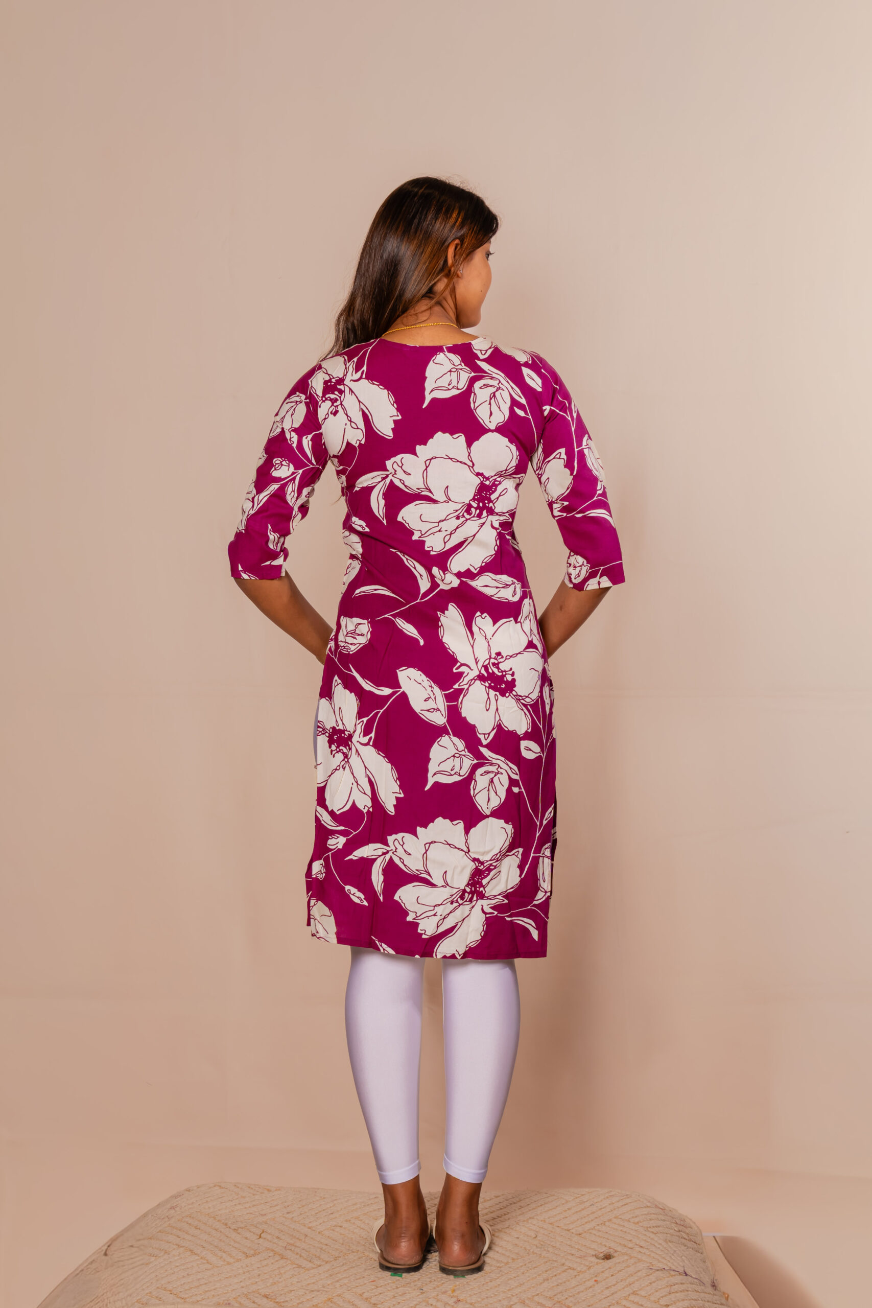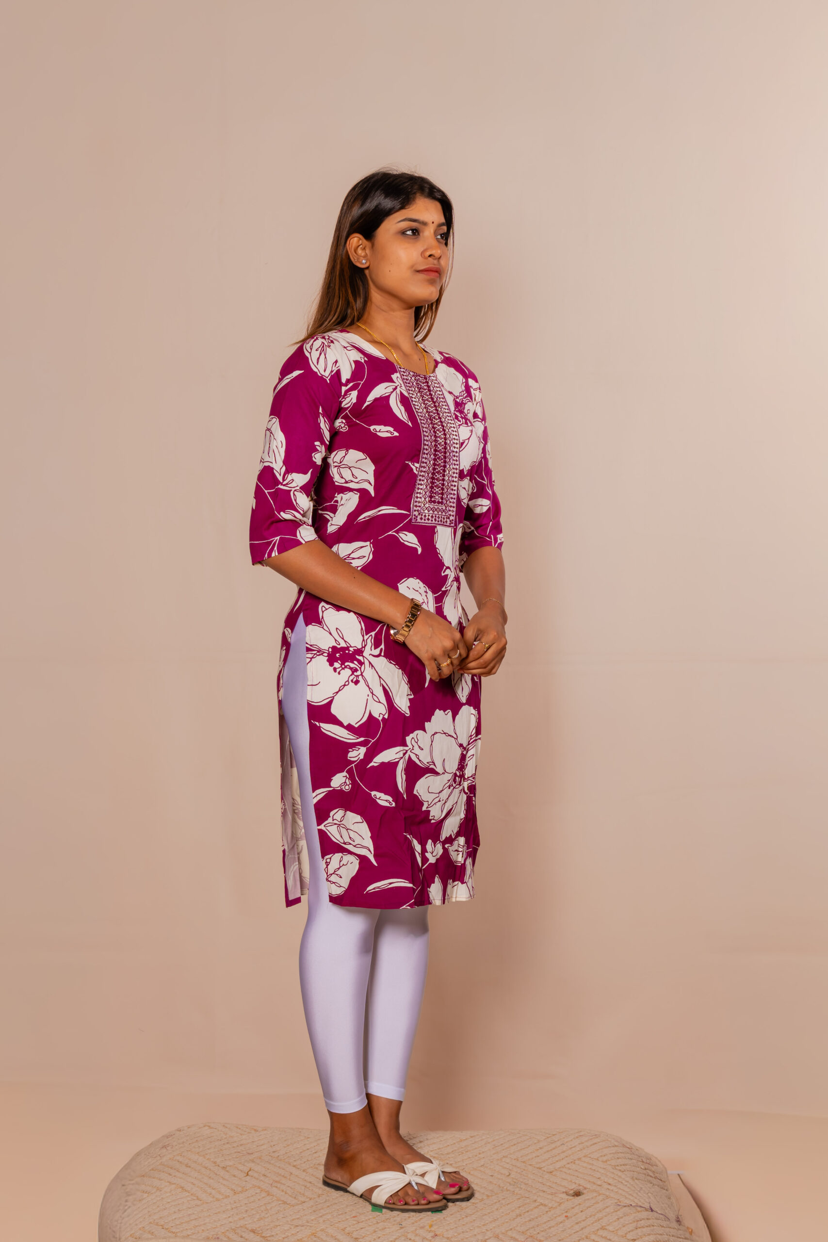 Elevate your everyday style with this vibrant maroon printed kurti top, designed to make a bold yet elegant statement. Crafted from soft, breathable fabric, it ensures all-day comfort while keeping you effortlessly chic. The eye-catching white floral patterns add a touch of freshness and charm, perfect for a lively look. Featuring a neatly designed round neckline with a stylish front panel, it enhances your overall appeal. The three-quarter sleeves provide a balanced blend of comfort and sophistication. Pair it with leggings or pants for a complete, graceful outfit.