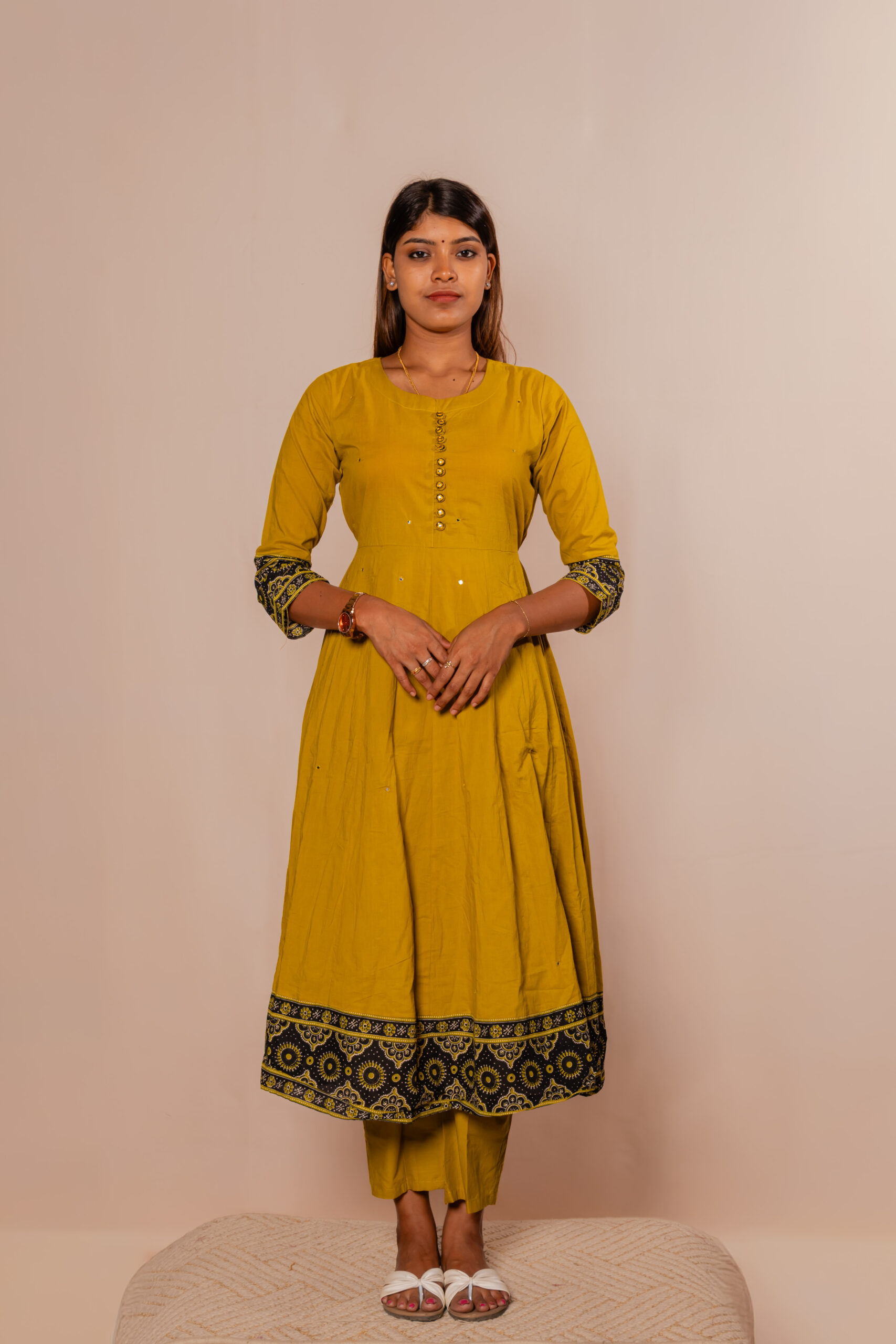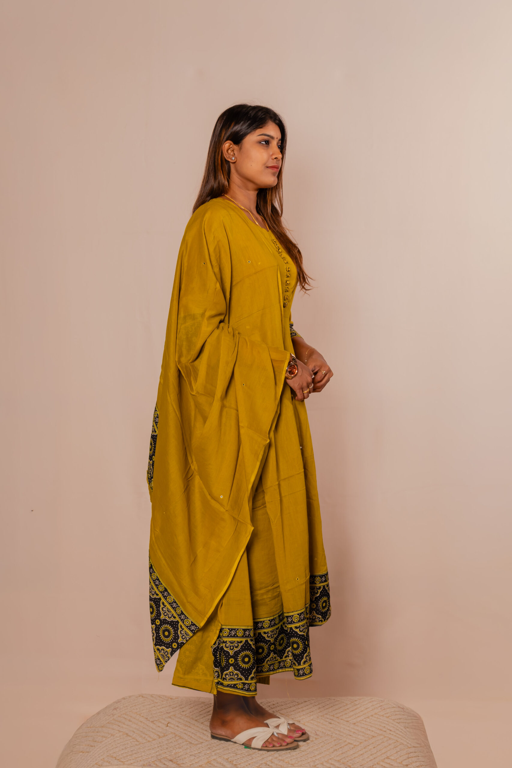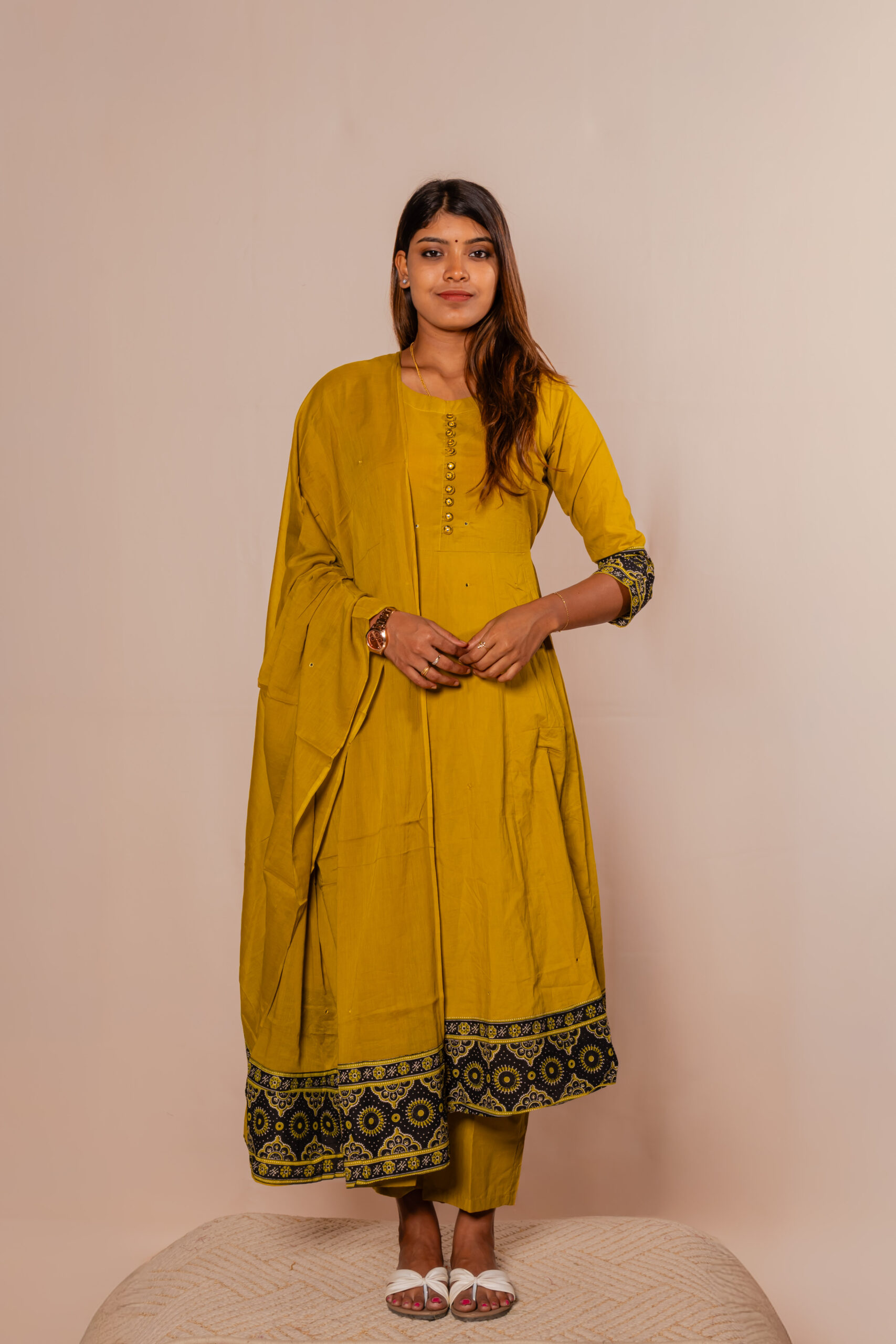 Add a touch of elegance to your everyday style with this graceful mustard kurti set. Designed with a simple yet sophisticated look, the kurti features a straight silhouette with button detailing on the yoke for a refined finish. The highlight of the outfit is the beautifully printed border on the hem and sleeves, adding a subtle ethnic charm. Crafted from soft and breathable fabric, it ensures all-day comfort. Paired with a matching bottom and dupatta, this set offers a complete and polished look for any occasion.
