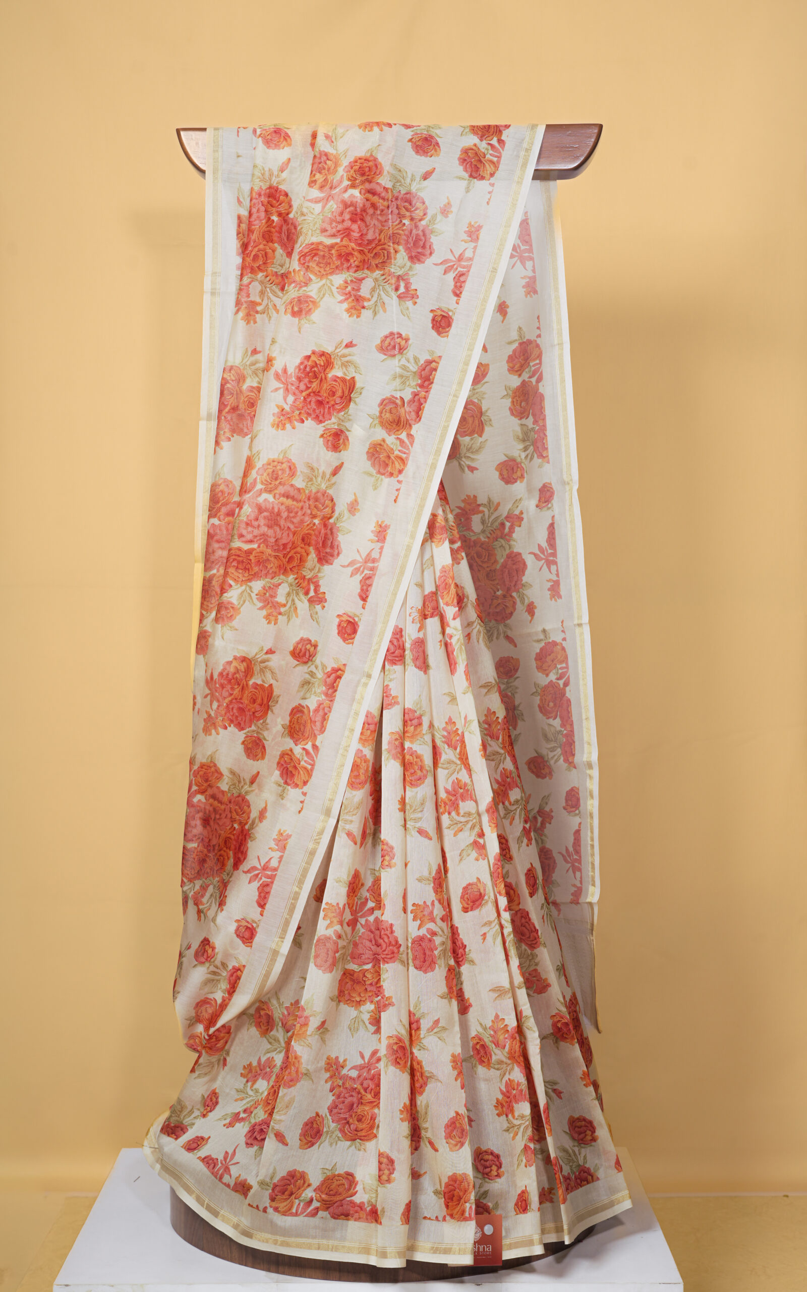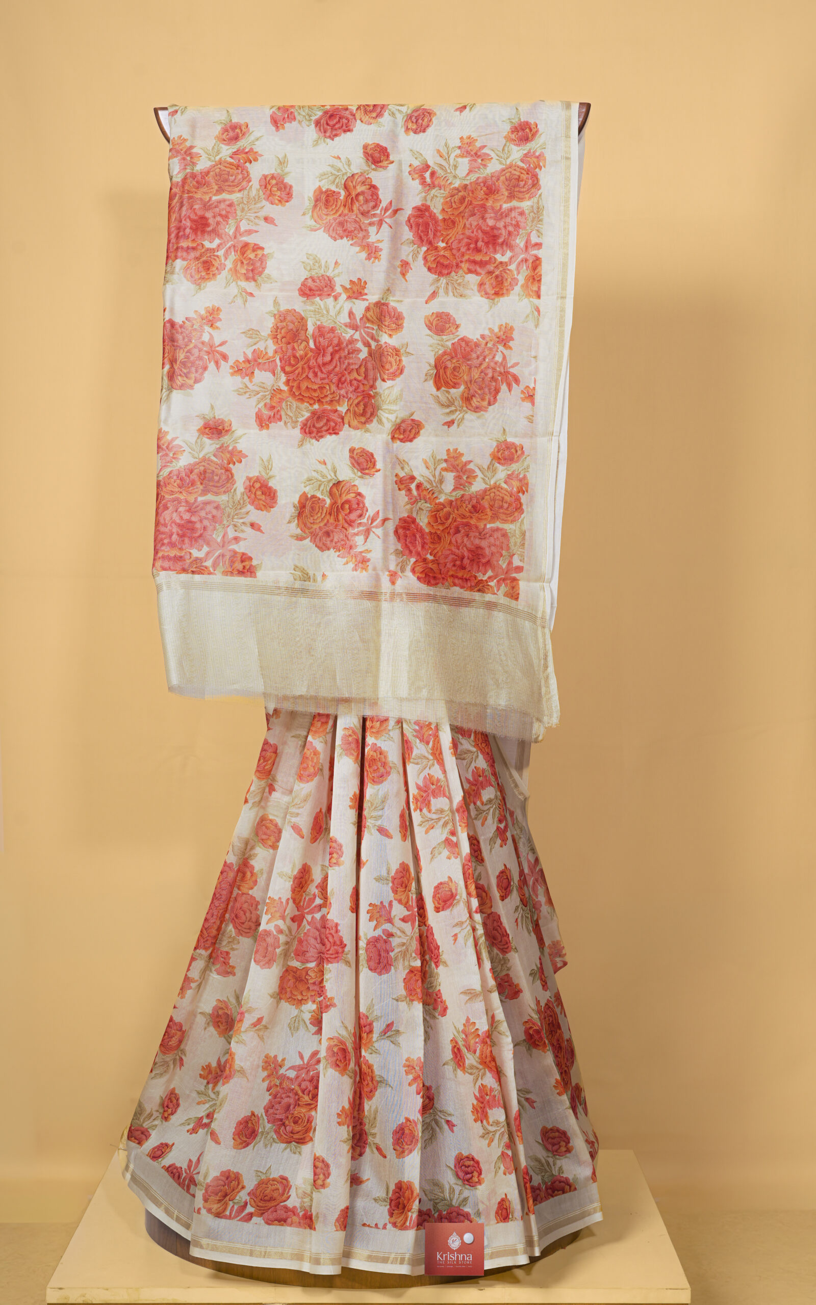 Elevate your ethnic wardrobe with this elegant Chanderi saree featuring a soft off-white base adorned with vibrant floral prints in warm coral and peach tones. Crafted from lightweight and breathable Chanderi fabric, it offers a perfect blend of comfort and sophistication. The subtle sheen and delicate texture add a graceful charm, while the minimal zari border enhances its traditional appeal. Ideal for all-day wear, this material drapes beautifully, giving you a refined and airy look. A perfect choice for those who love timeless floral elegance with a modern touch.