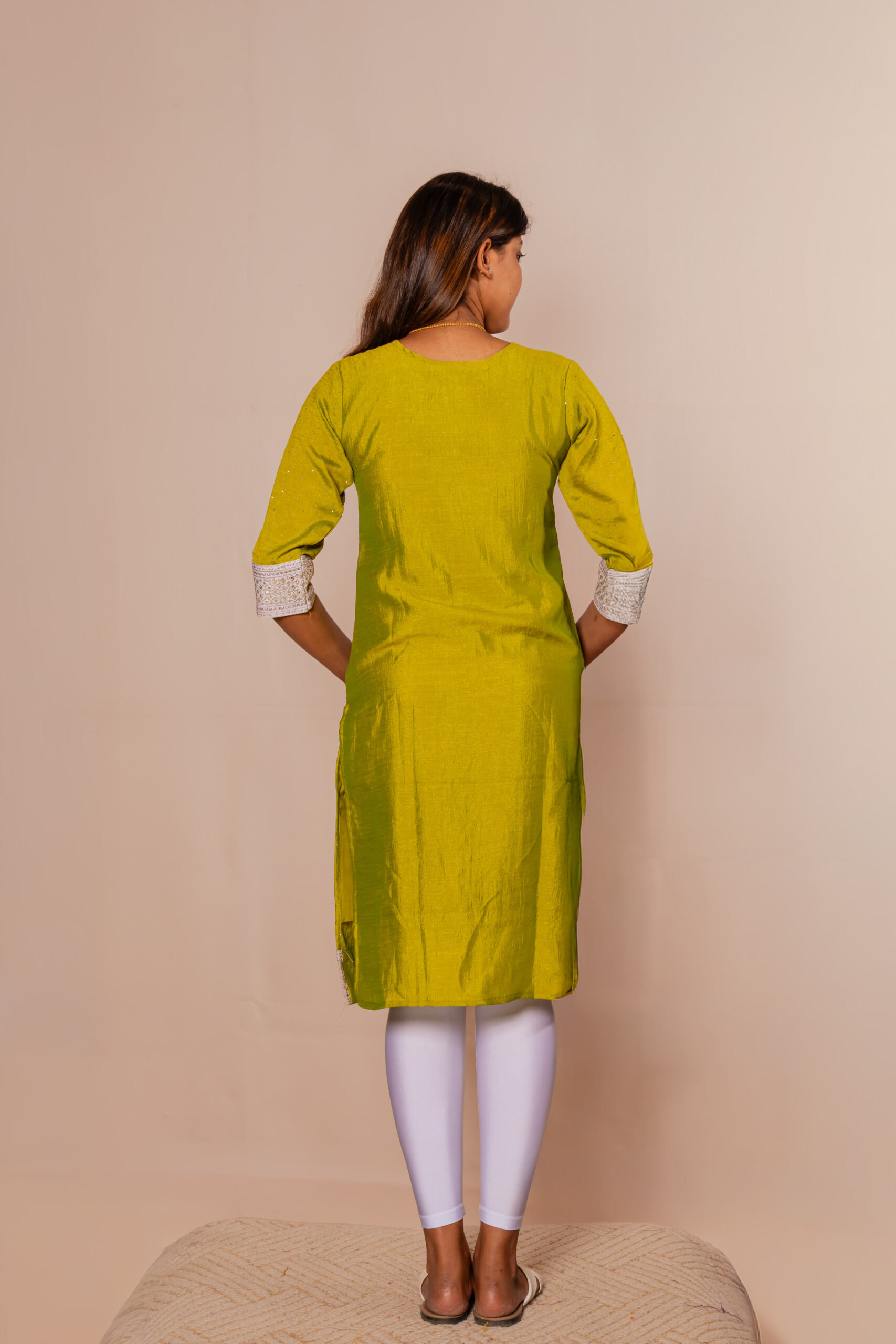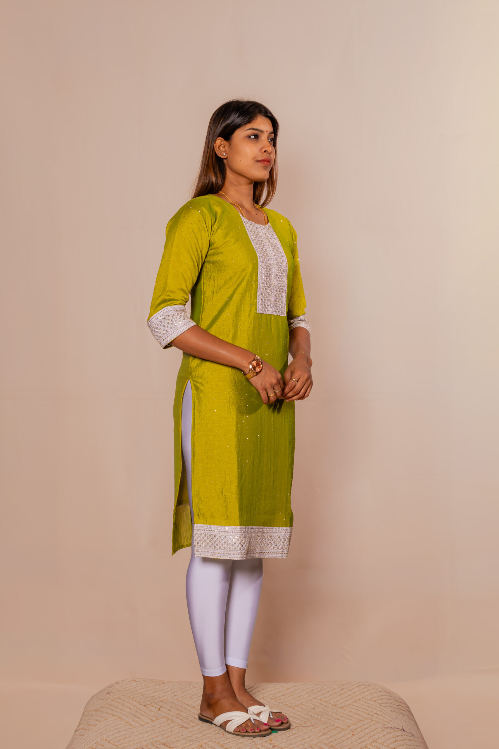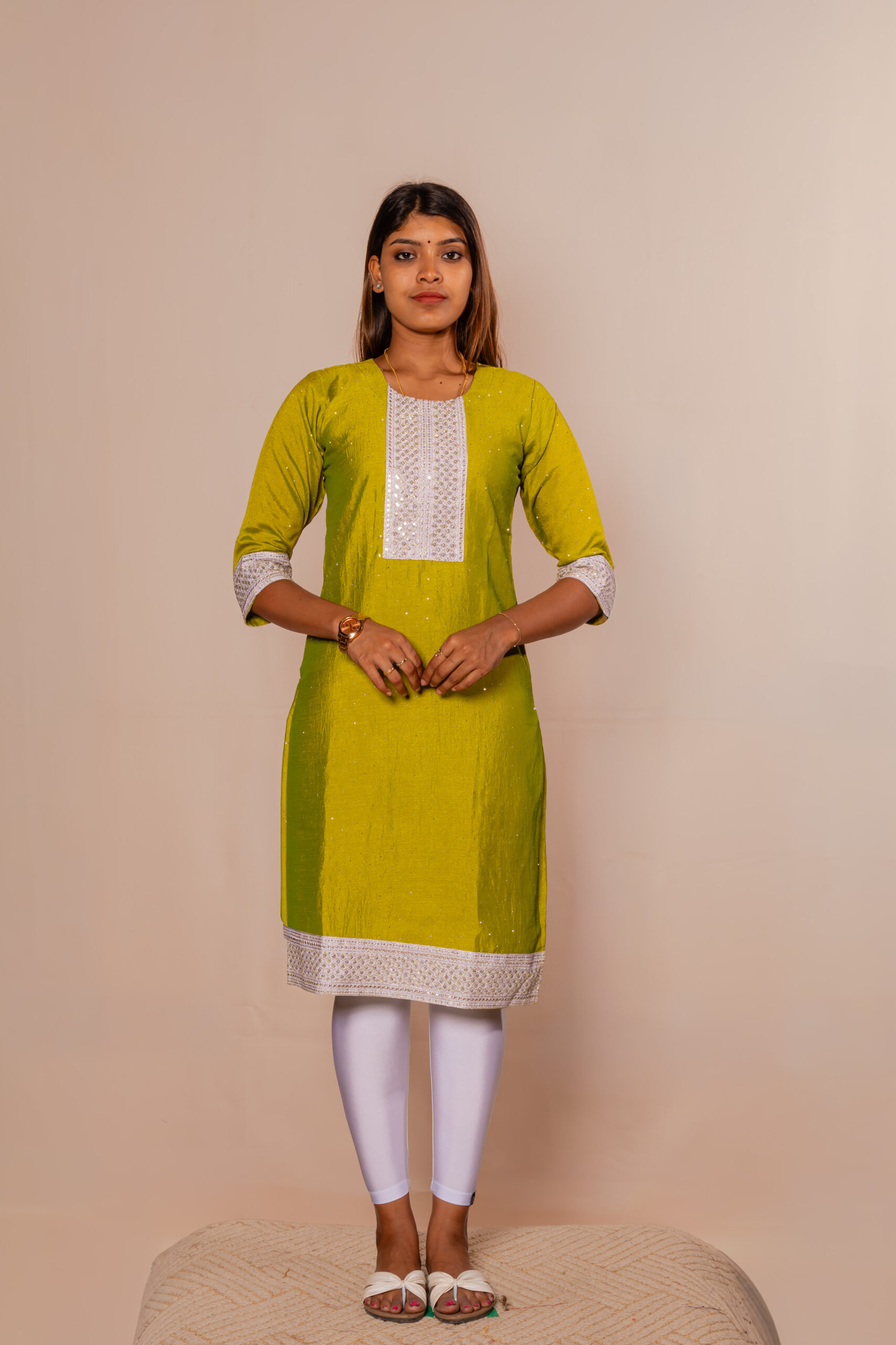 Enhance your ethnic wardrobe with this elegant green kurti top adorned with subtle shimmer detailing. The beautifully embroidered front panel and sleeve borders add a touch of festive charm. Crafted from soft, breathable fabric, it ensures comfort while maintaining a refined look. Designed with a straight fit and three-quarter sleeves, it offers both style and ease. Perfectly pairs with leggings or pants for a graceful and polished appearance.