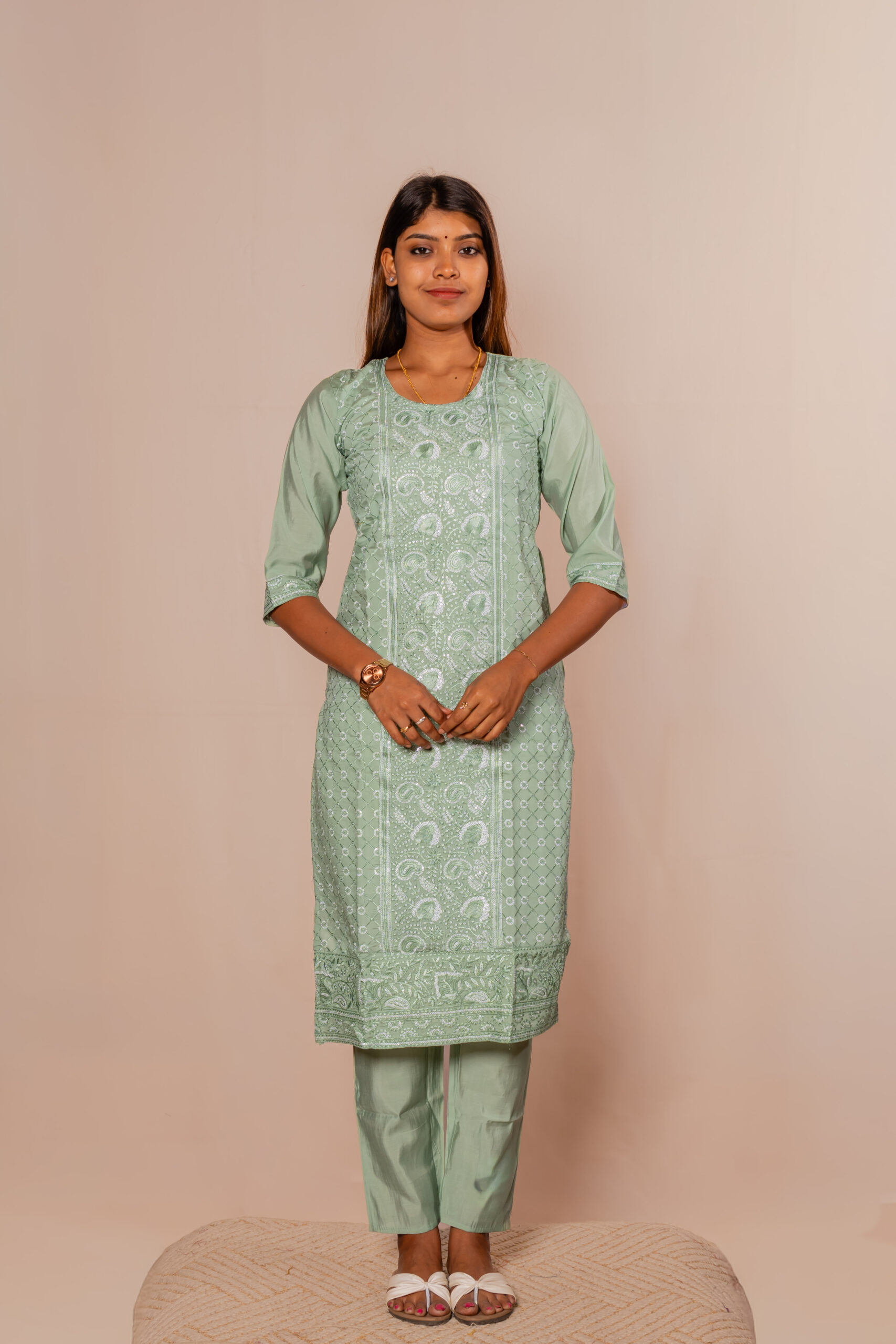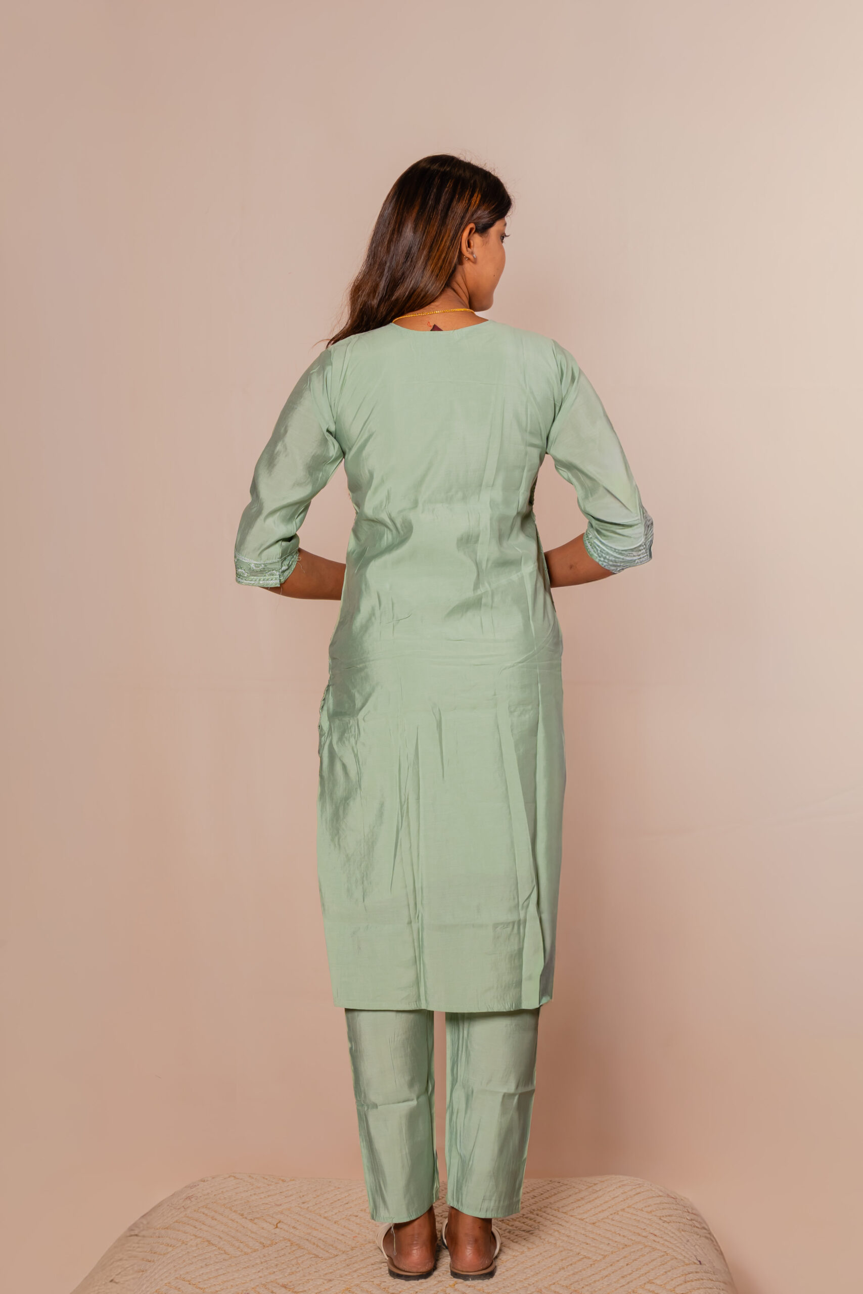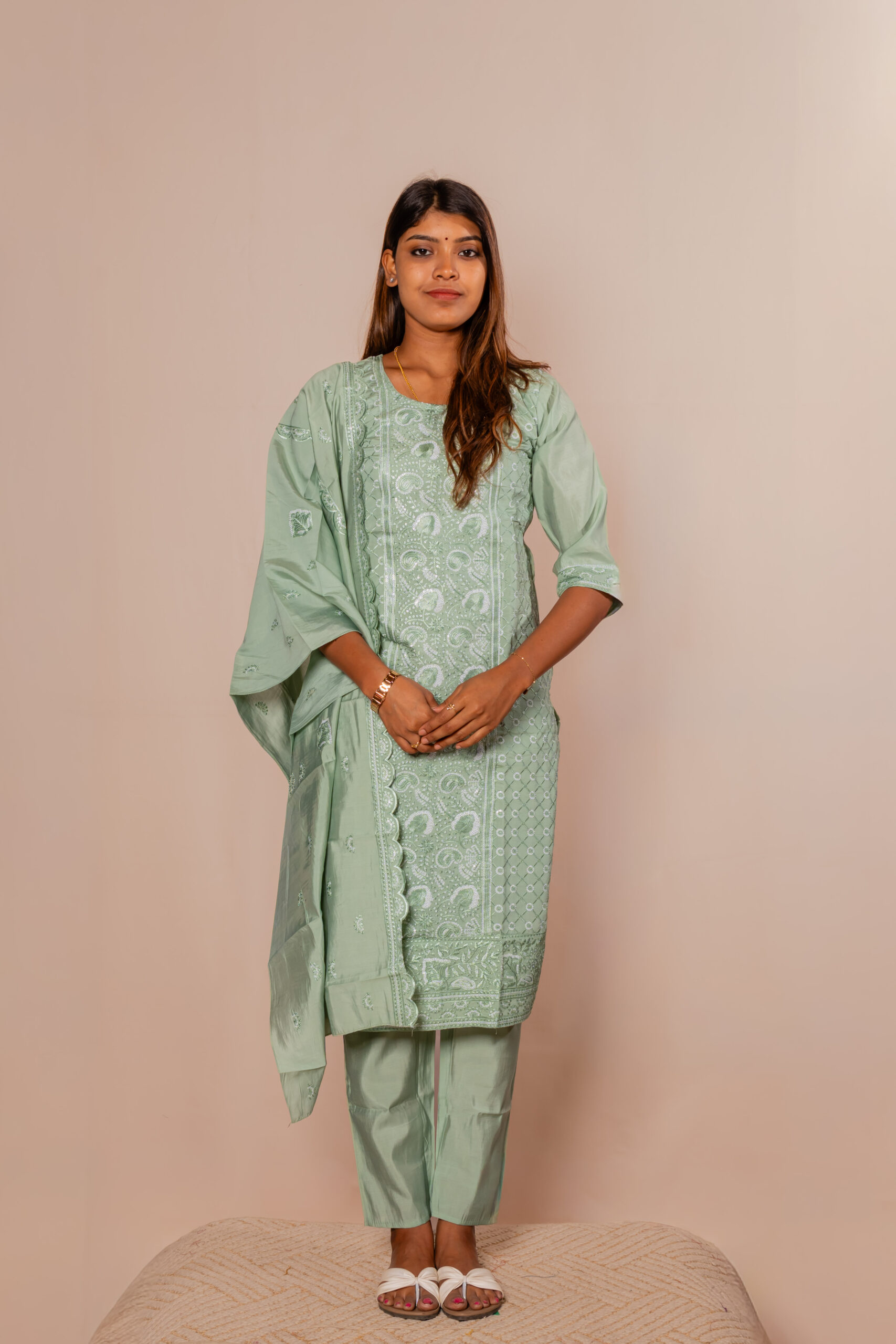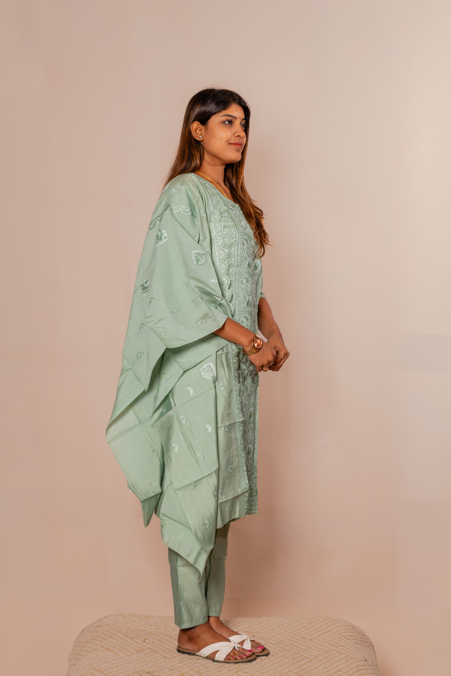 This elegant pastel green kurta set exudes understated charm with its intricate embroidery and soft, breathable fabric. The straight-cut kurta is paired with matching pants, offering a graceful and comfortable silhouette. A coordinated dupatta adds a touch of sophistication, making the outfit feel complete and refined. The subtle detailing enhances its timeless appeal without being overpowering. Perfectly balanced between style and comfort, it’s ideal for all-day wear.