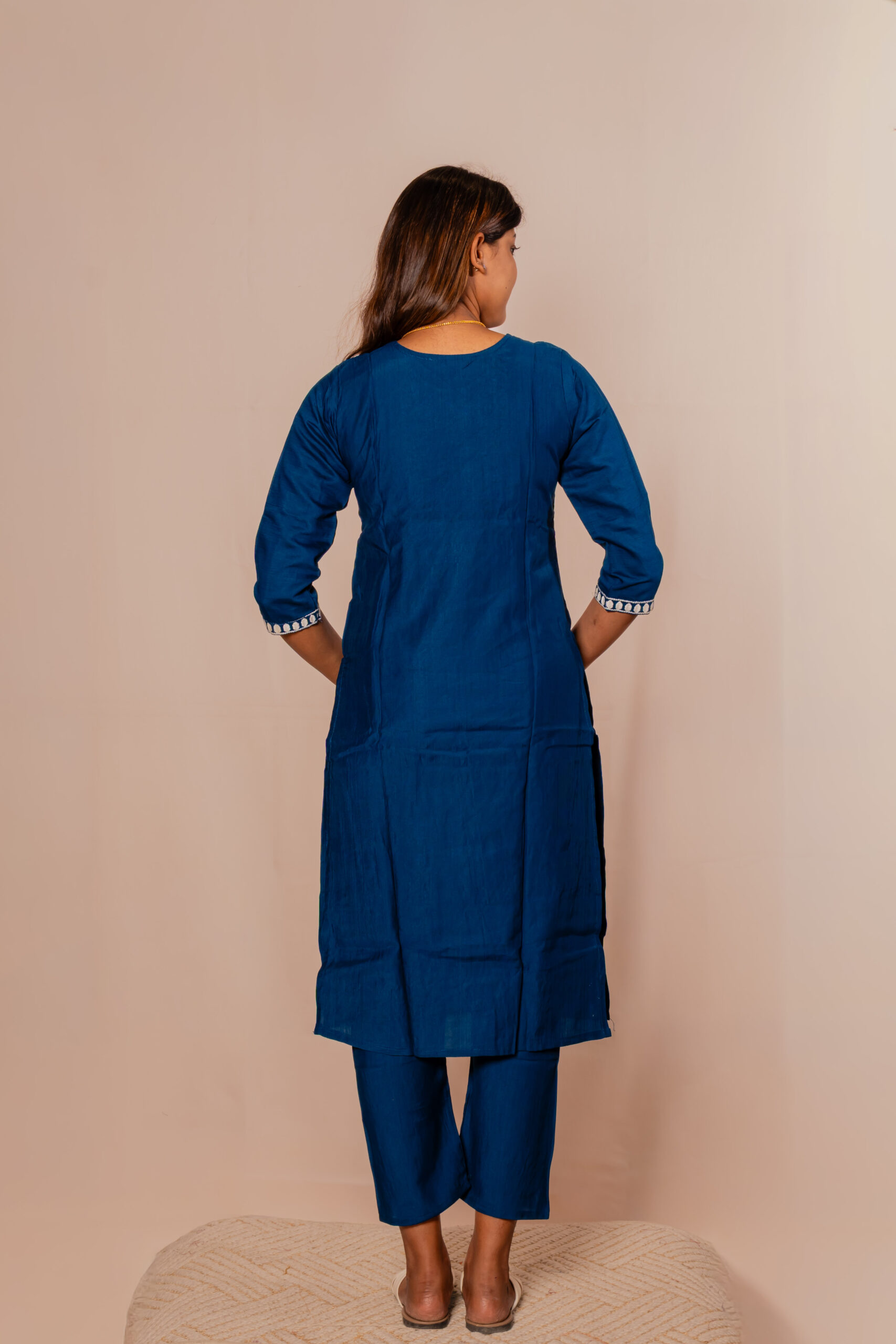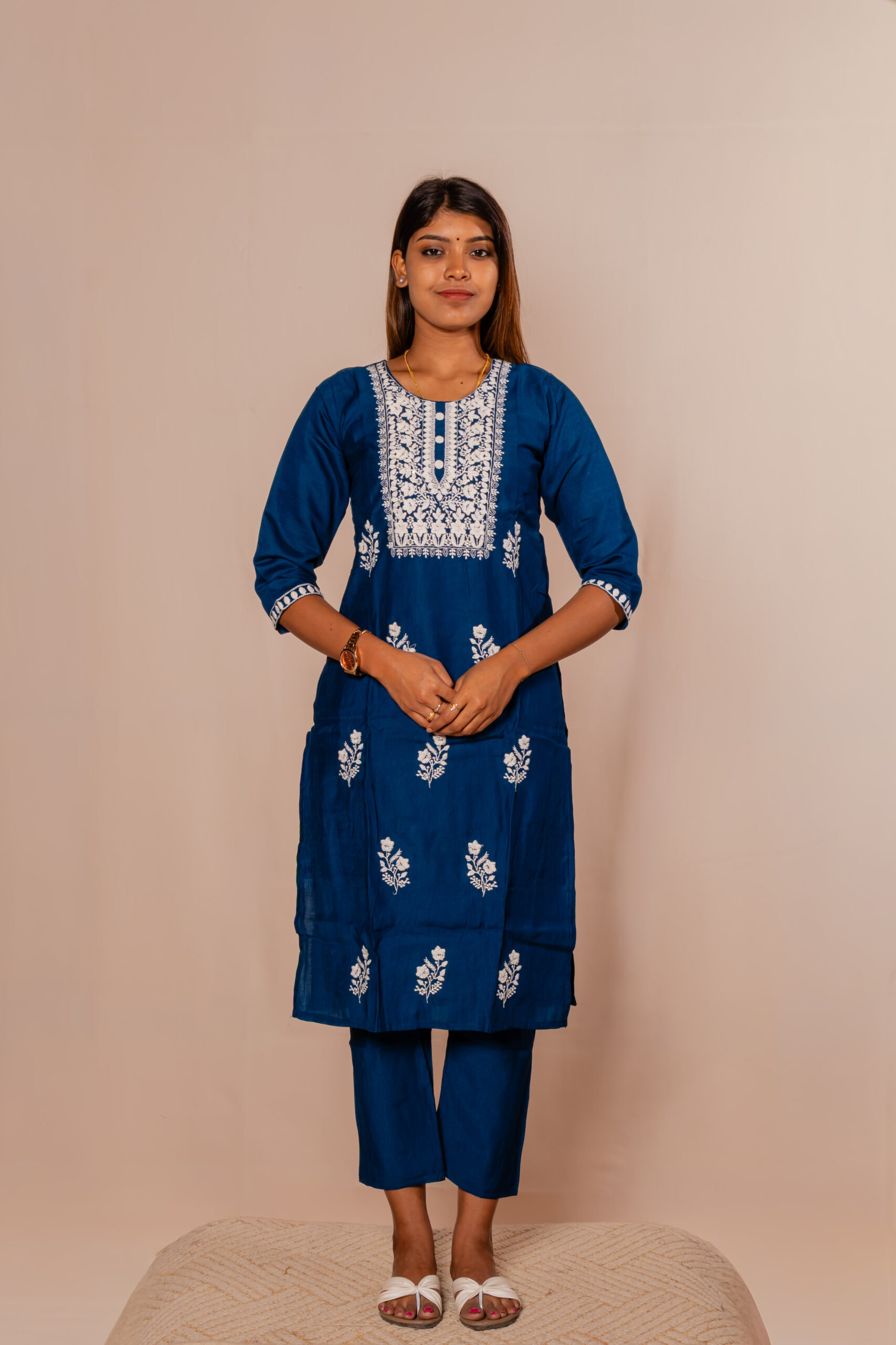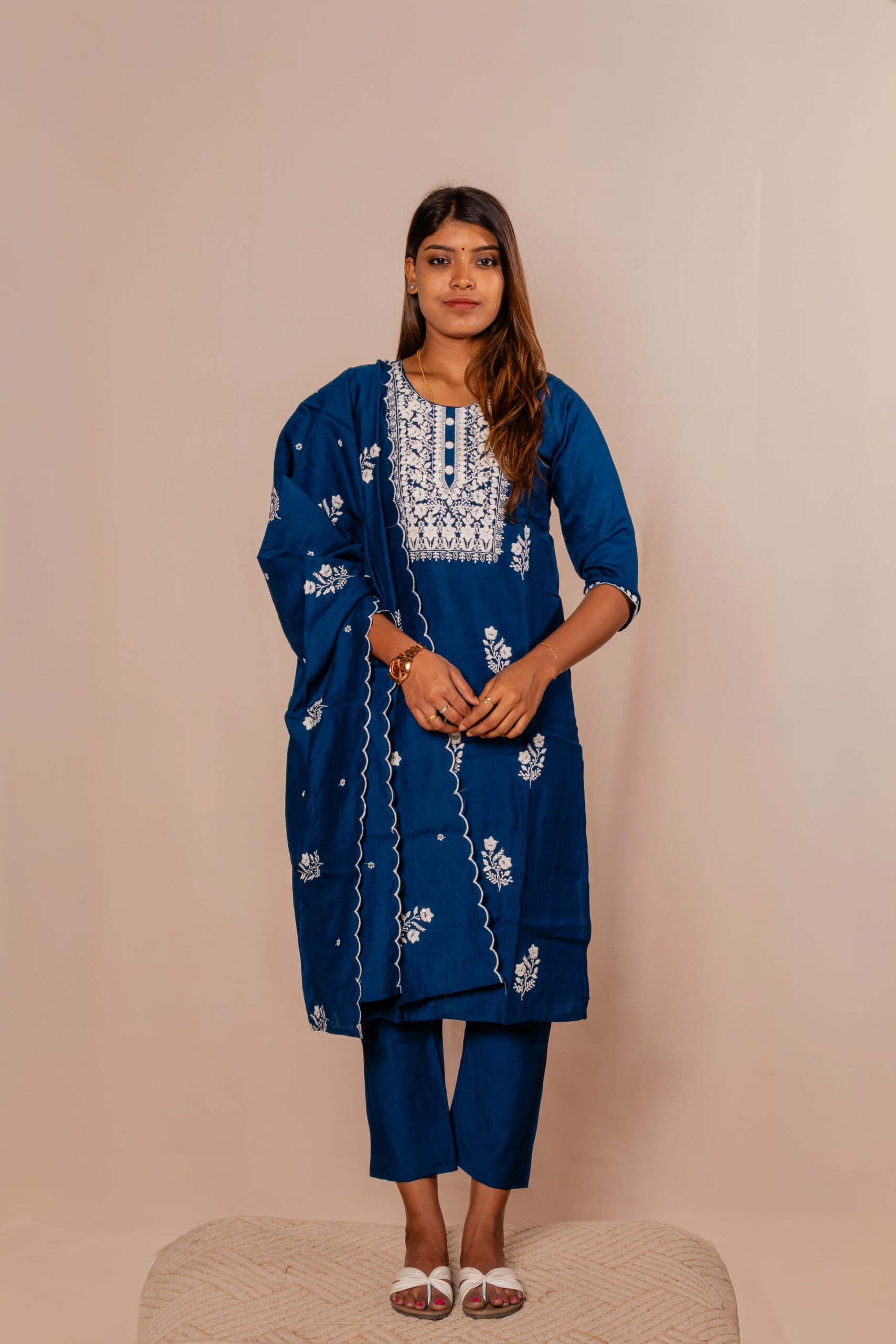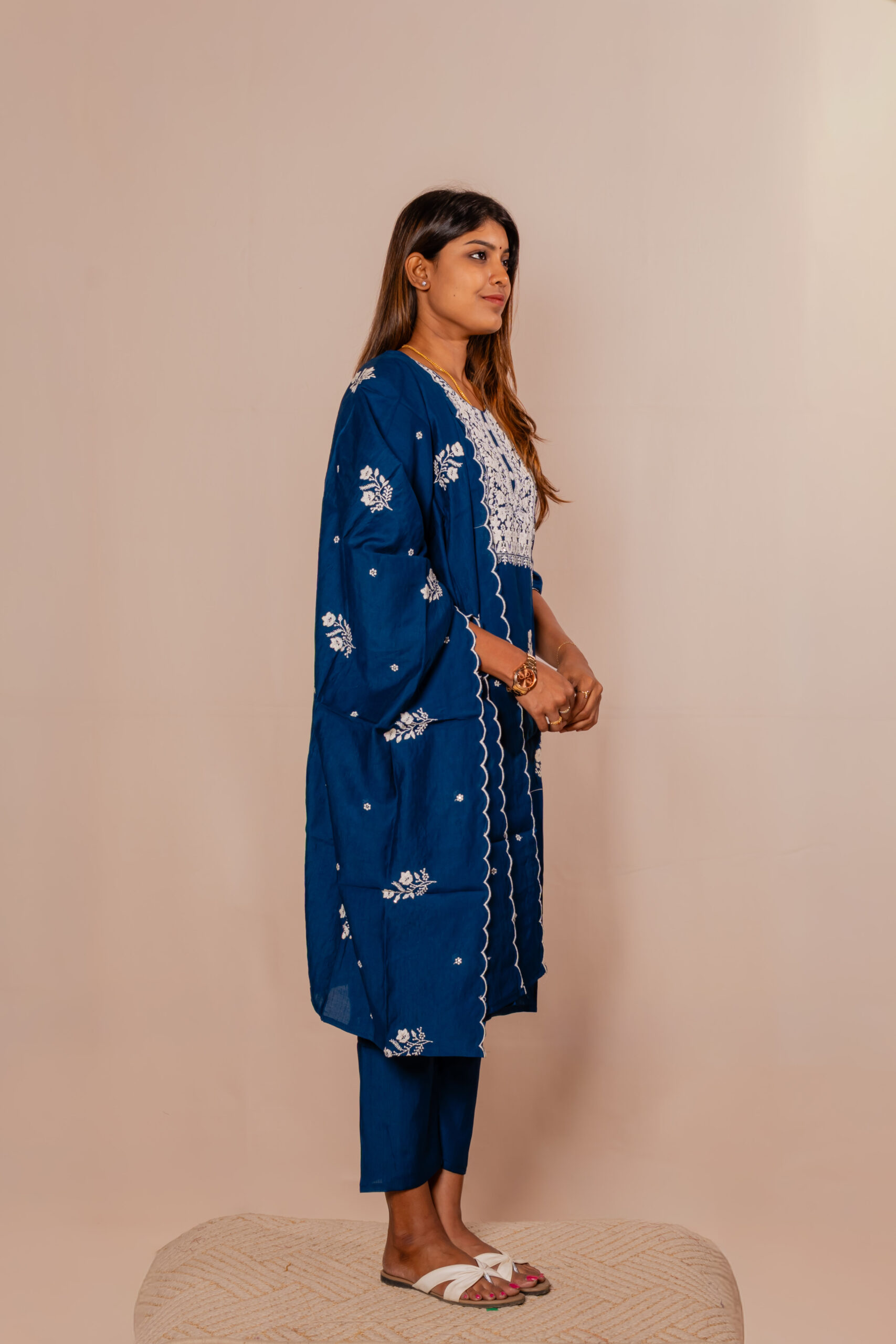 This stylish peacock green ethnic set showcases a graceful kurta with delicate white floral embroidery, creating a perfect blend of simplicity and elegance. Designed with a comfortable straight fit, it offers ease of movement while maintaining a chic look. The soft, breathable fabric makes it ideal for all-day wear in any season. Paired with matching bottoms and a complementing dupatta, it completes a refined traditional outfit.