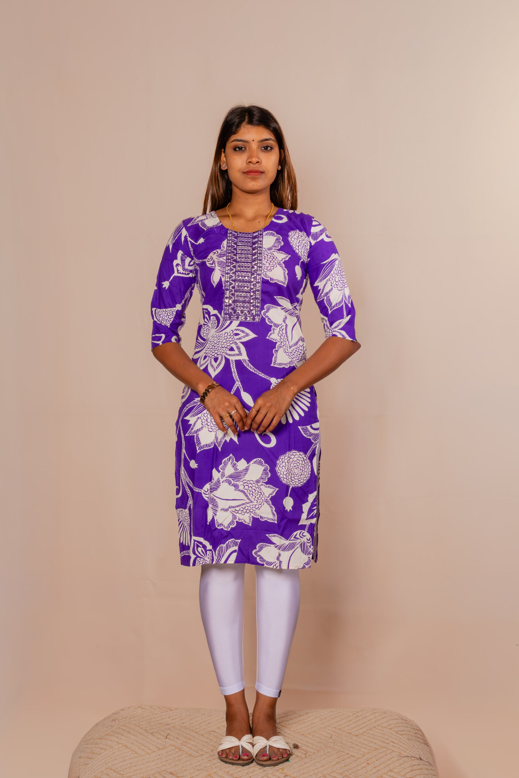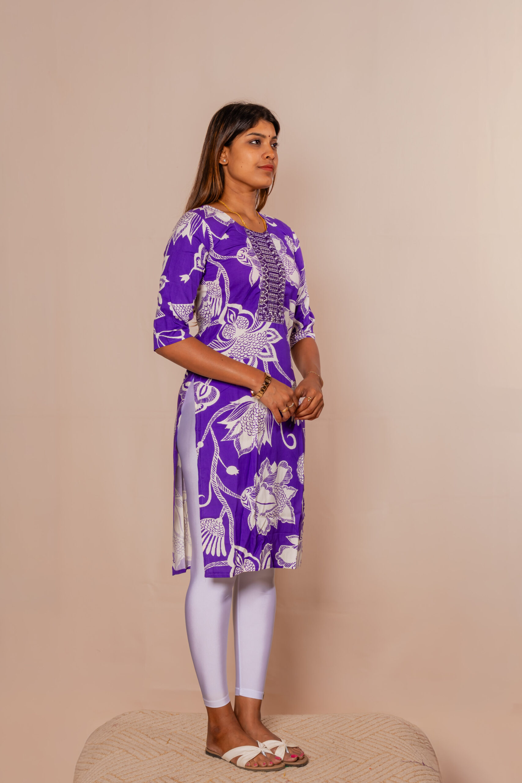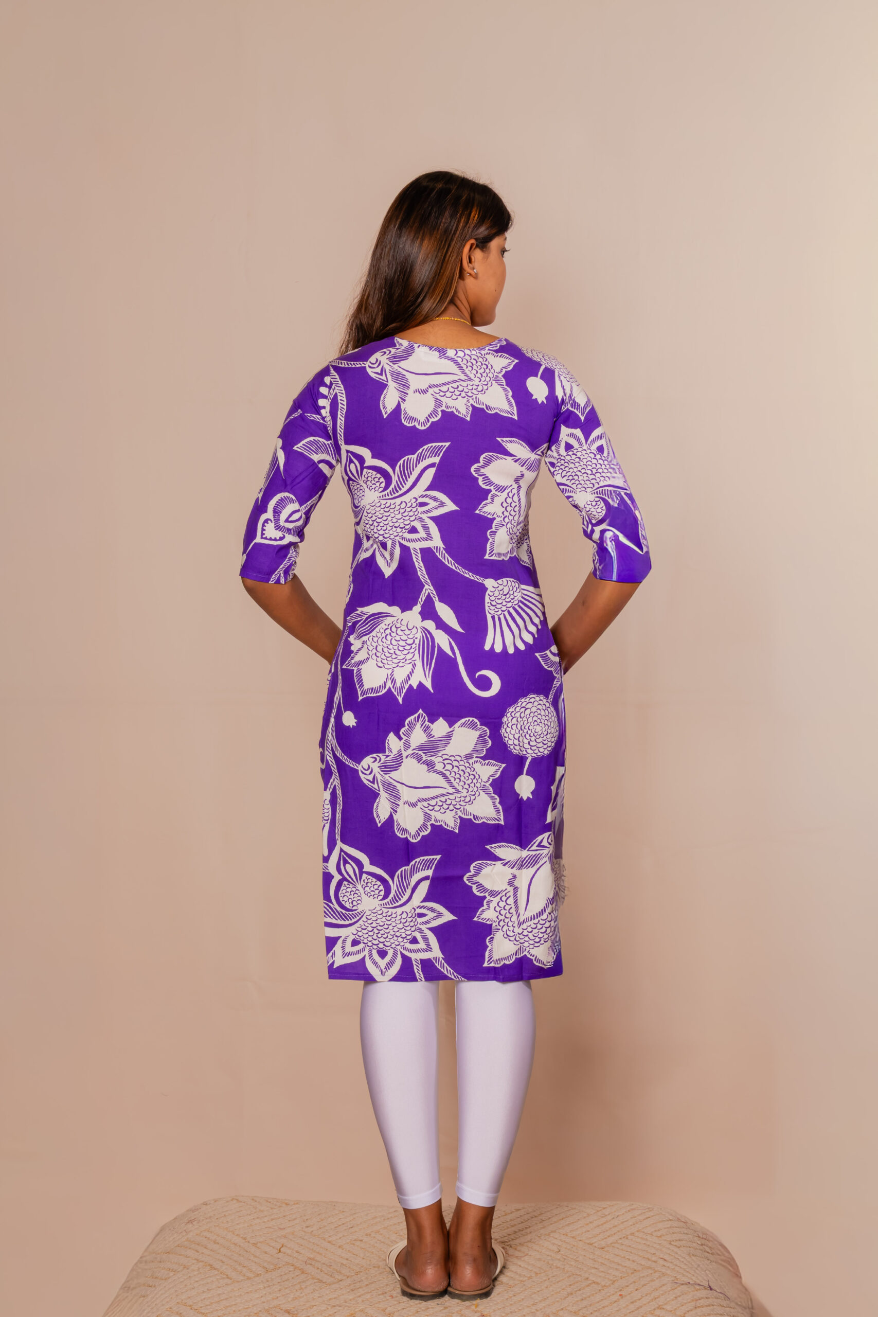 Elevate your everyday style with this vibrant purple printed kurti top, designed to make a bold yet elegant statement. Crafted from soft, breathable fabric, it ensures all-day comfort while keeping you effortlessly chic. The eye-catching white floral patterns add a touch of freshness and charm, perfect for a lively look. Featuring a neatly designed round neckline with a stylish front panel, it enhances your overall appeal. The three-quarter sleeves provide a balanced blend of comfort and sophistication. Pair it with leggings or pants for a complete, graceful outfit.