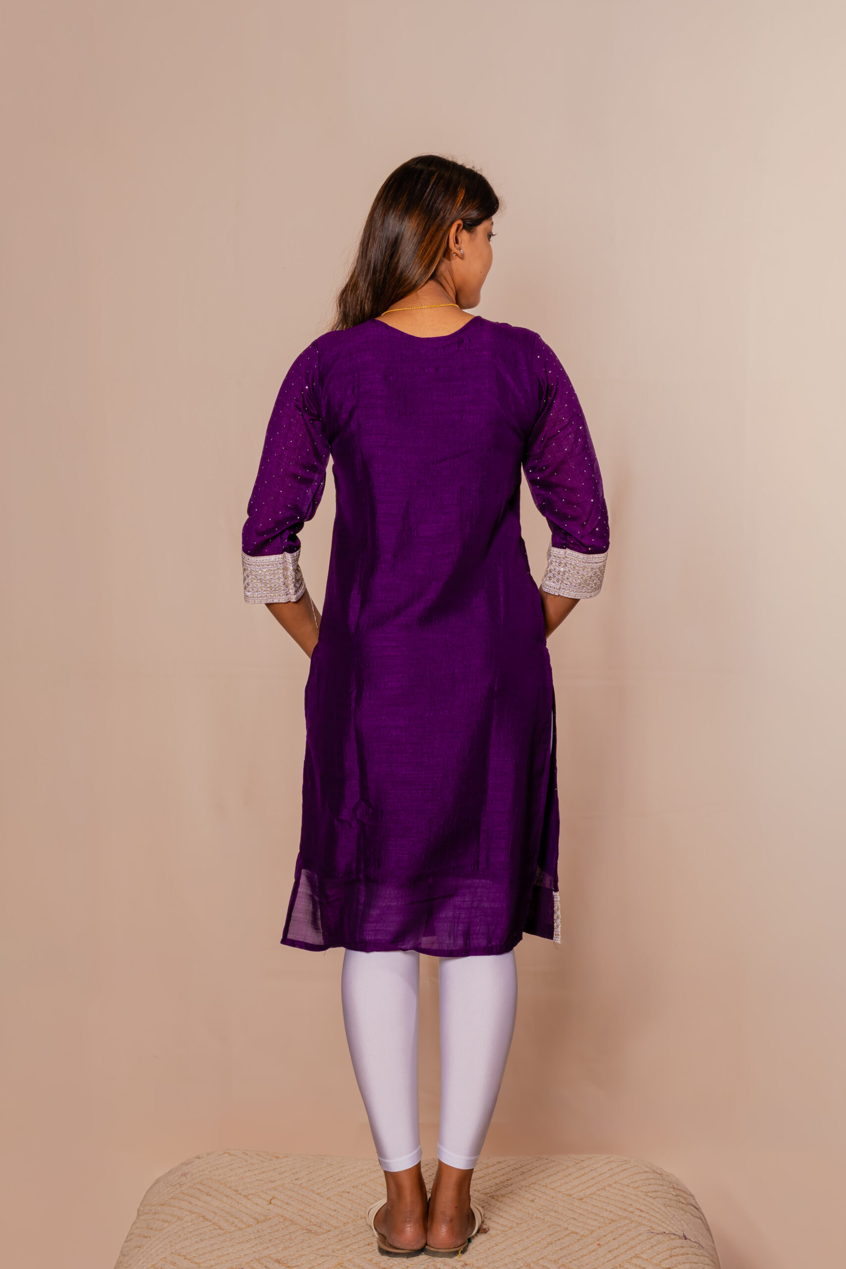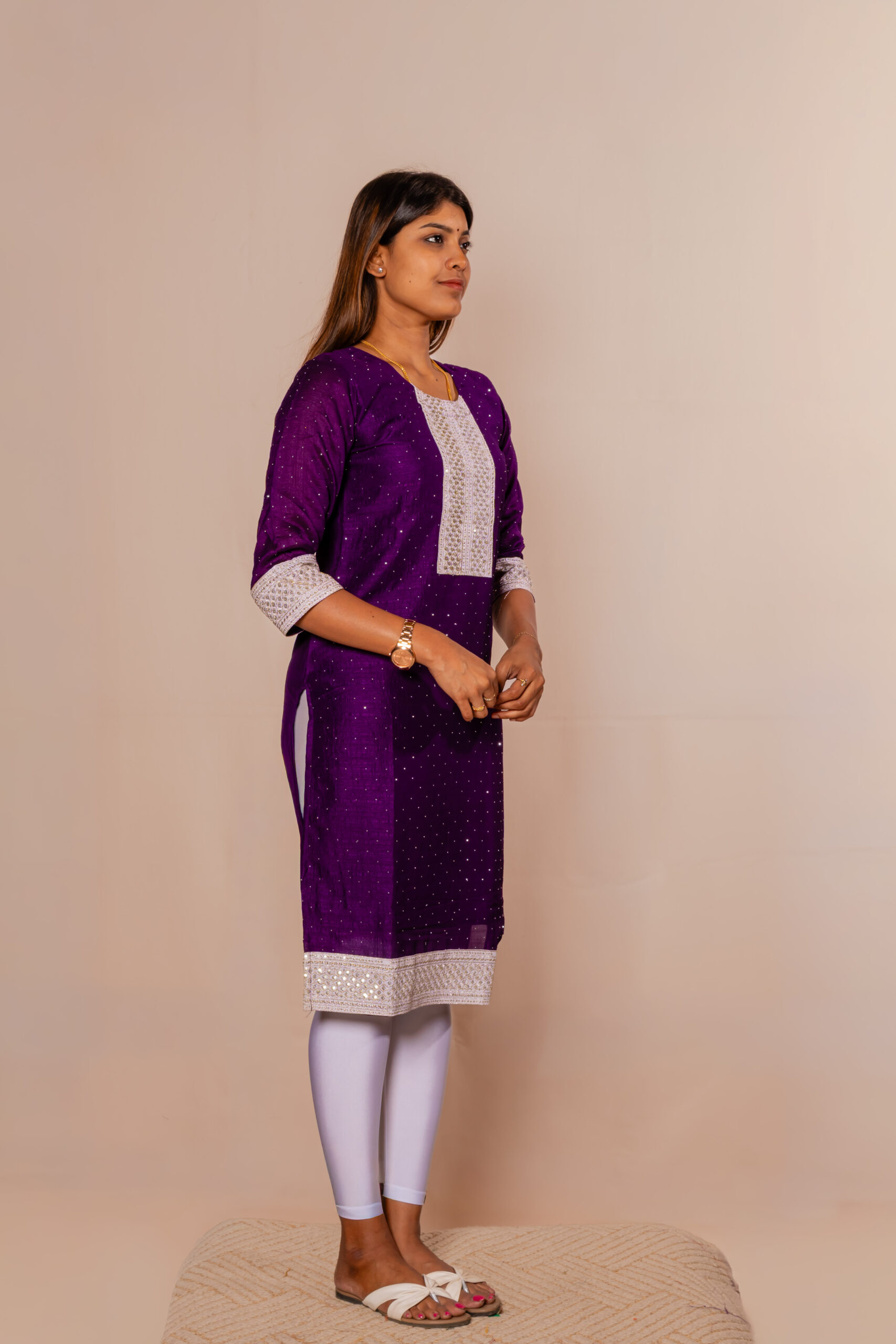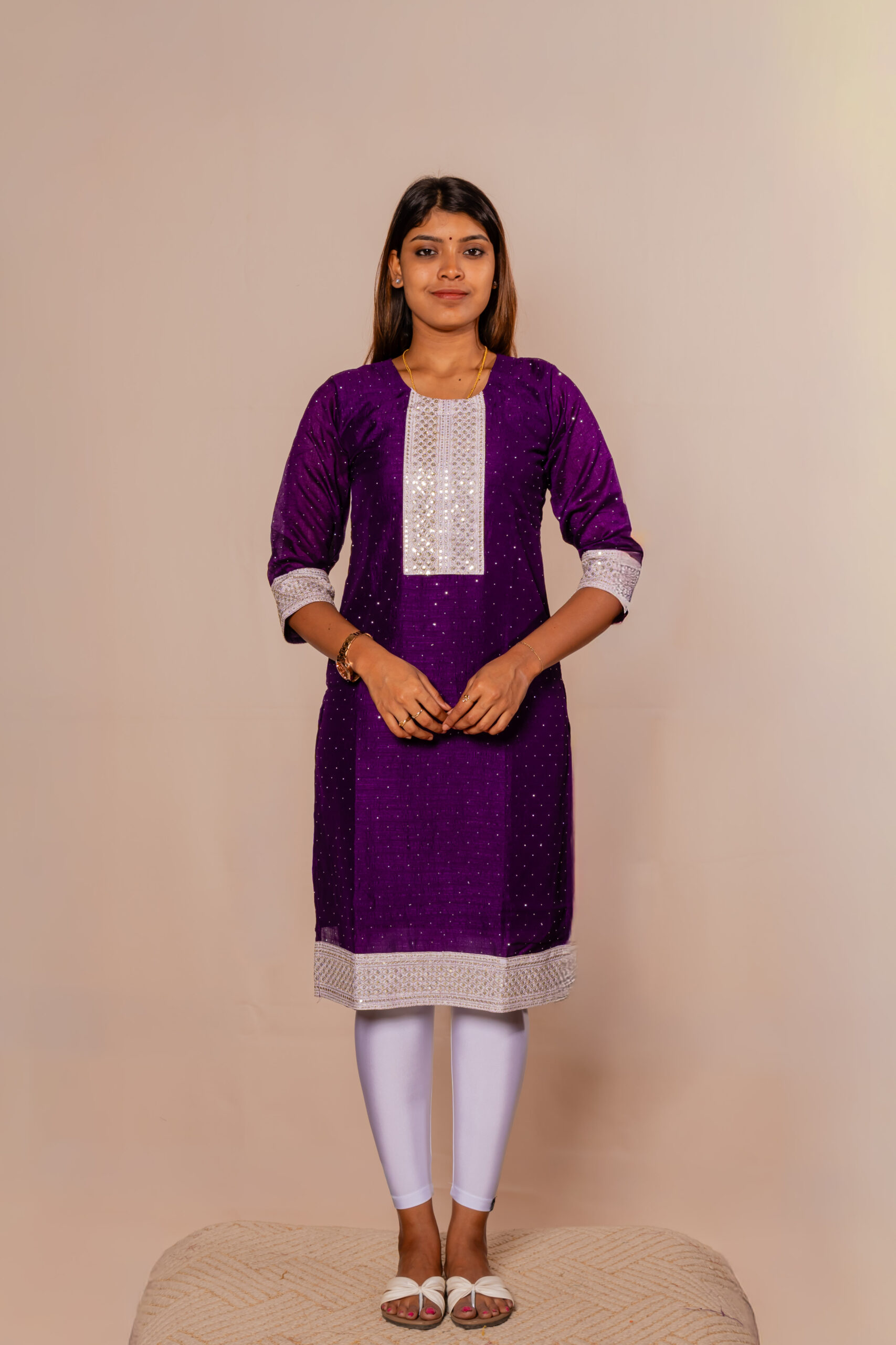 Enhance your ethnic wardrobe with this elegant purple kurti top adorned with subtle shimmer detailing. The beautifully embroidered front panel and sleeve borders add a touch of festive charm. Crafted from soft, breathable fabric, it ensures comfort while maintaining a refined look. Designed with a straight fit and three-quarter sleeves, it offers both style and ease. Perfectly pairs with leggings or pants for a graceful and polished appearance.