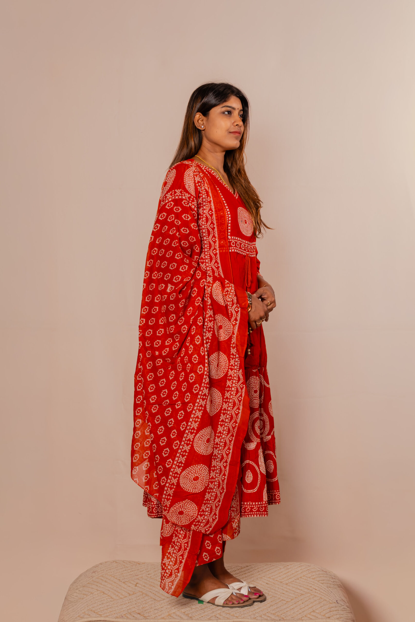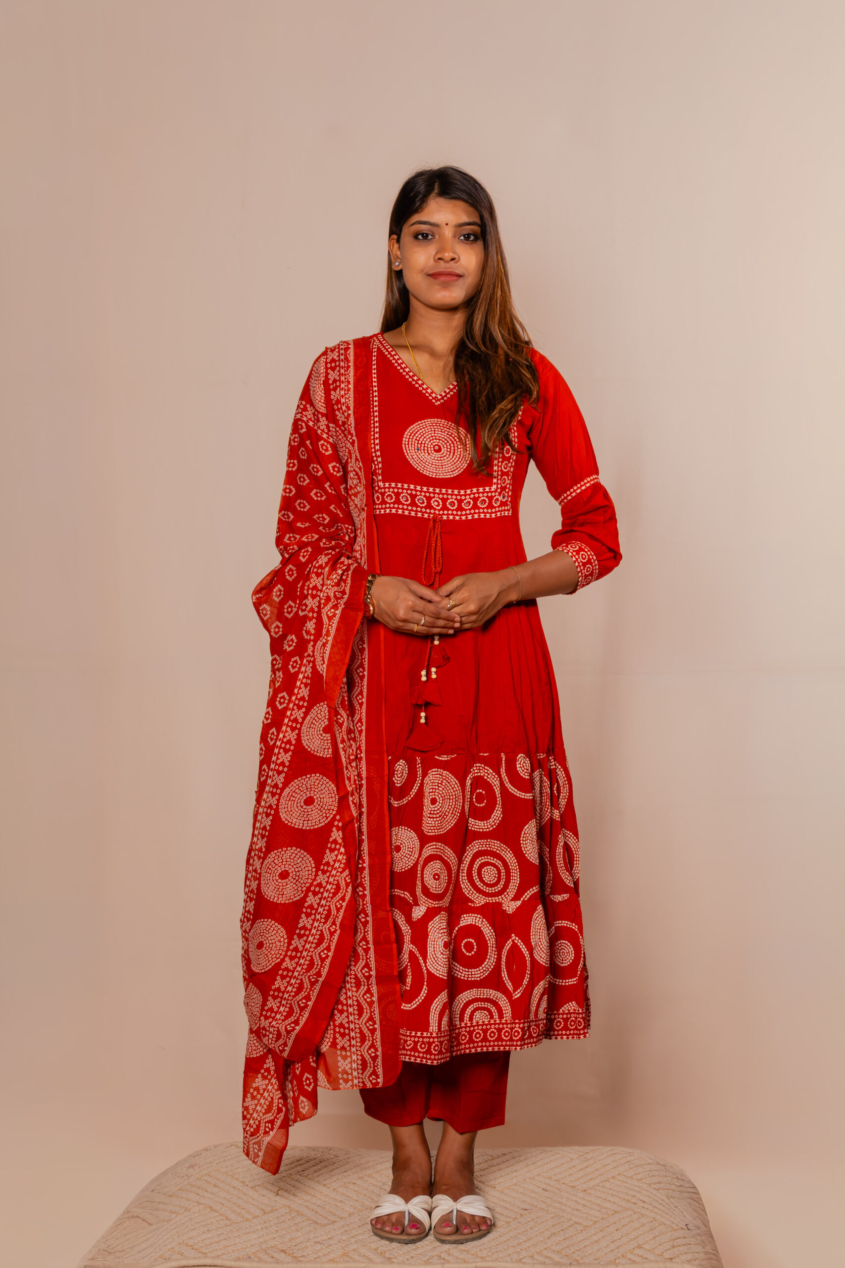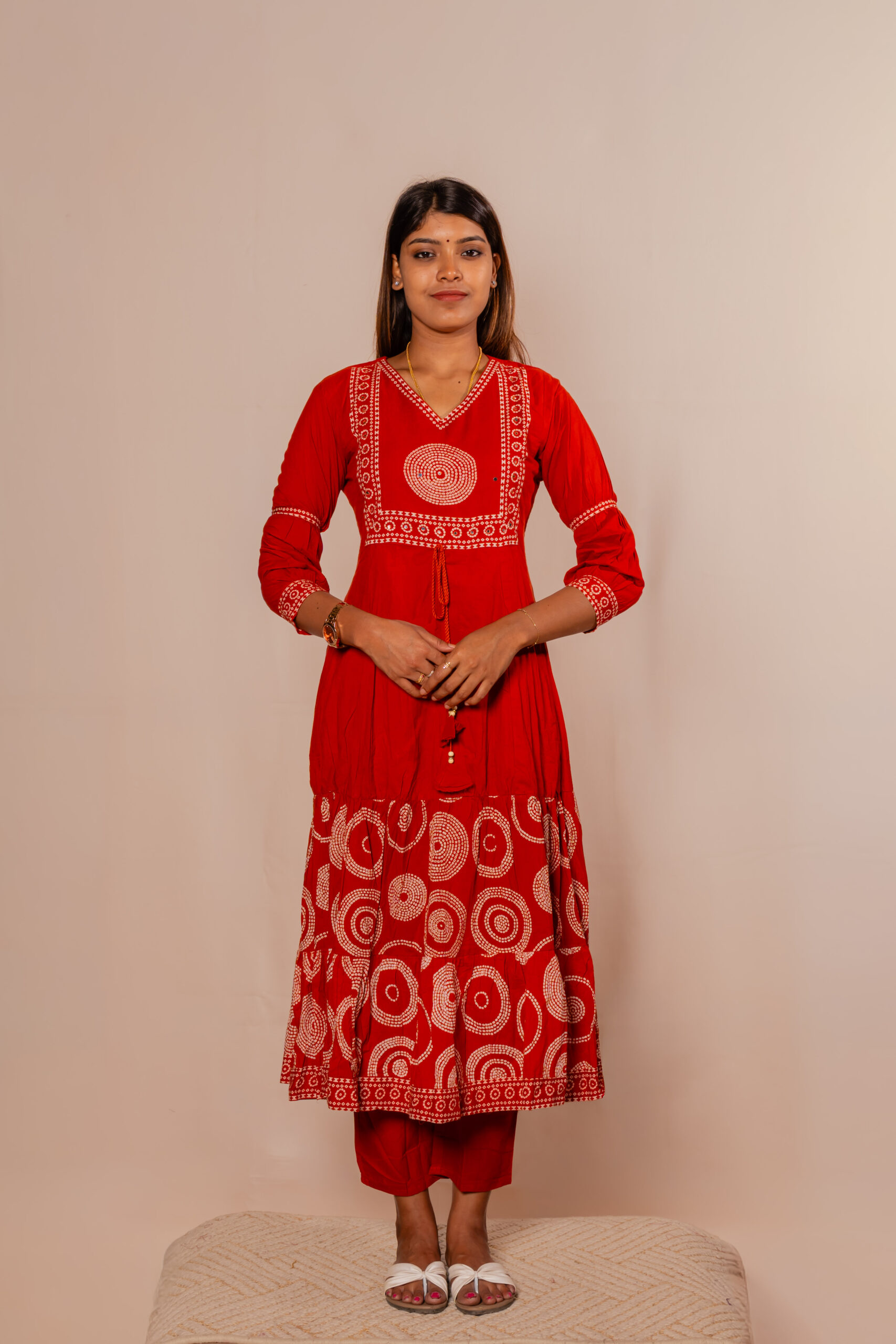 Make a bold style statement with this stunning red brown kurti set, designed with elegant ethnic motifs for a timeless look. The kurti features a flattering flared silhouette with intricate printed detailing on the yoke and hem, adding charm and grace. Crafted from soft, breathable fabric, it ensures all-day comfort without compromising on style. The matching bottom complements the outfit perfectly, while the beautifully printed dupatta enhances the overall appeal. Perfectly balanced between traditional and contemporary design, this set is a must-have in your wardrobe.