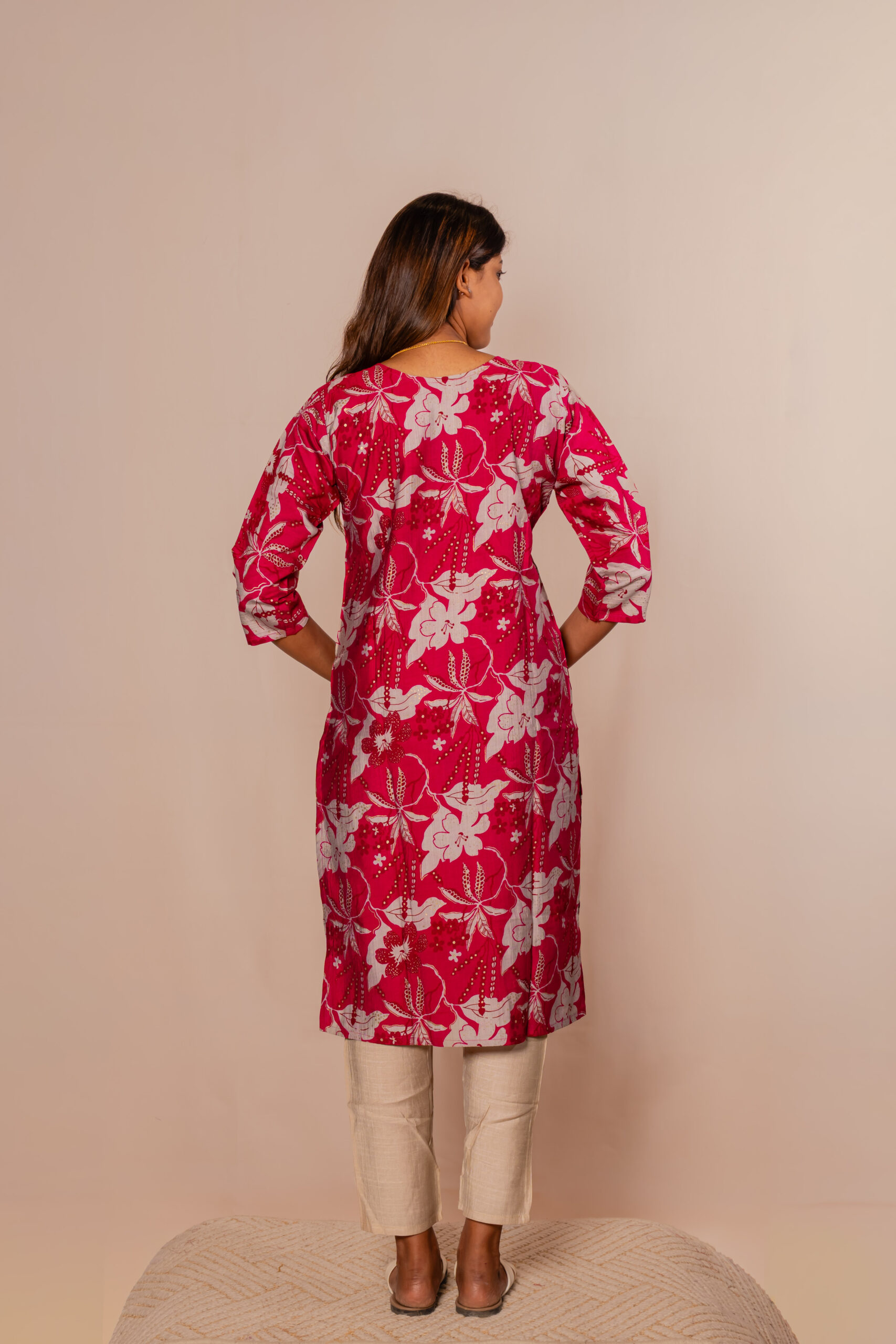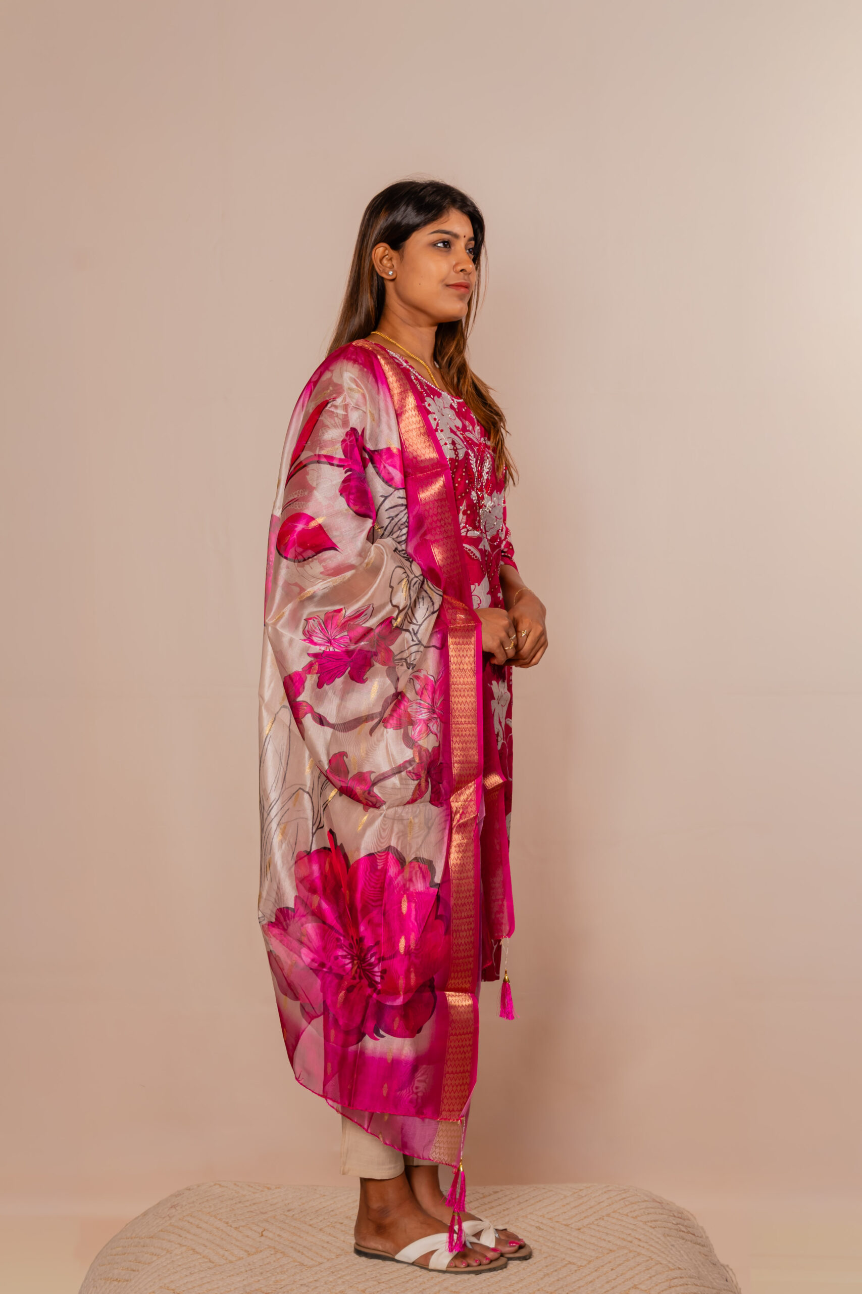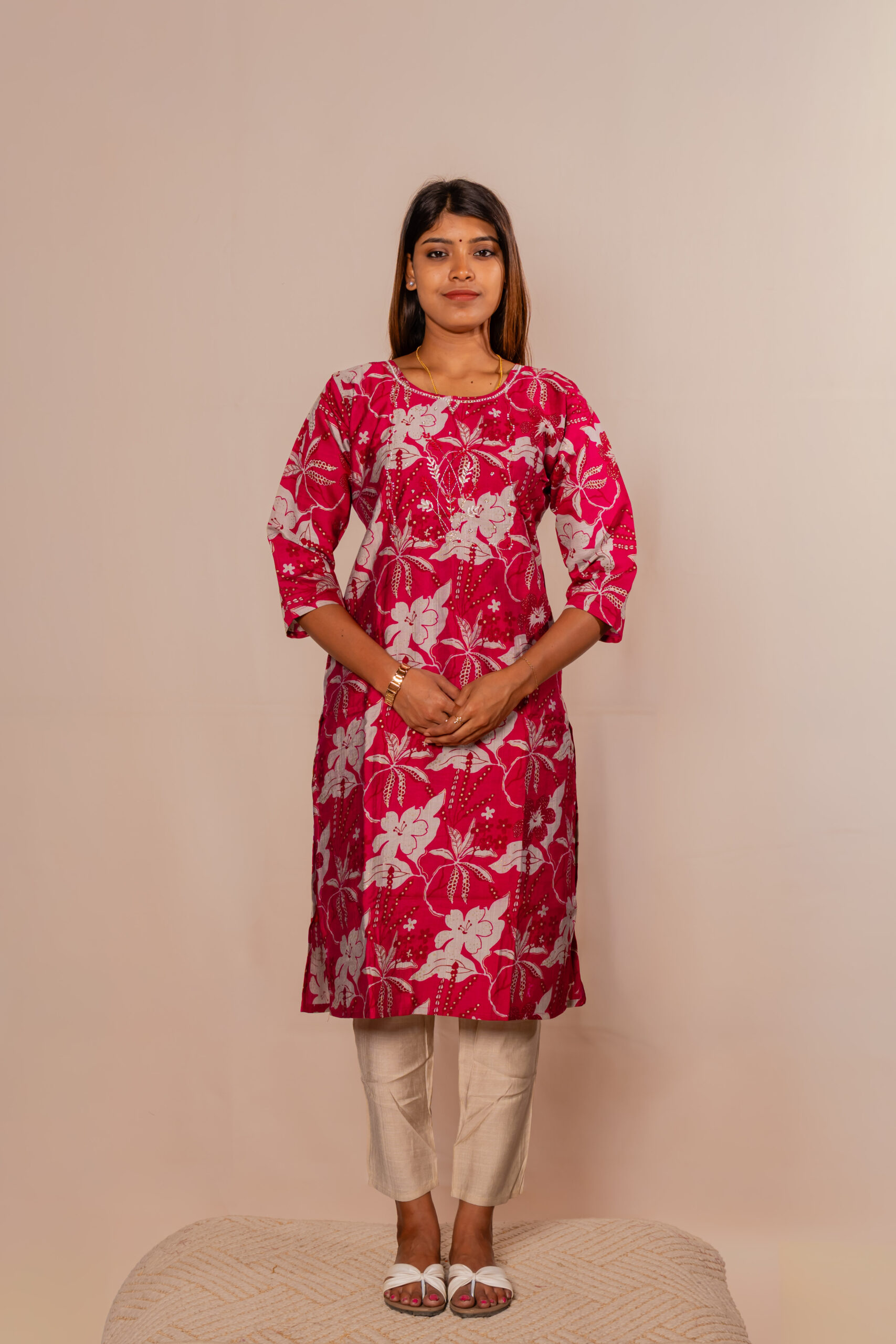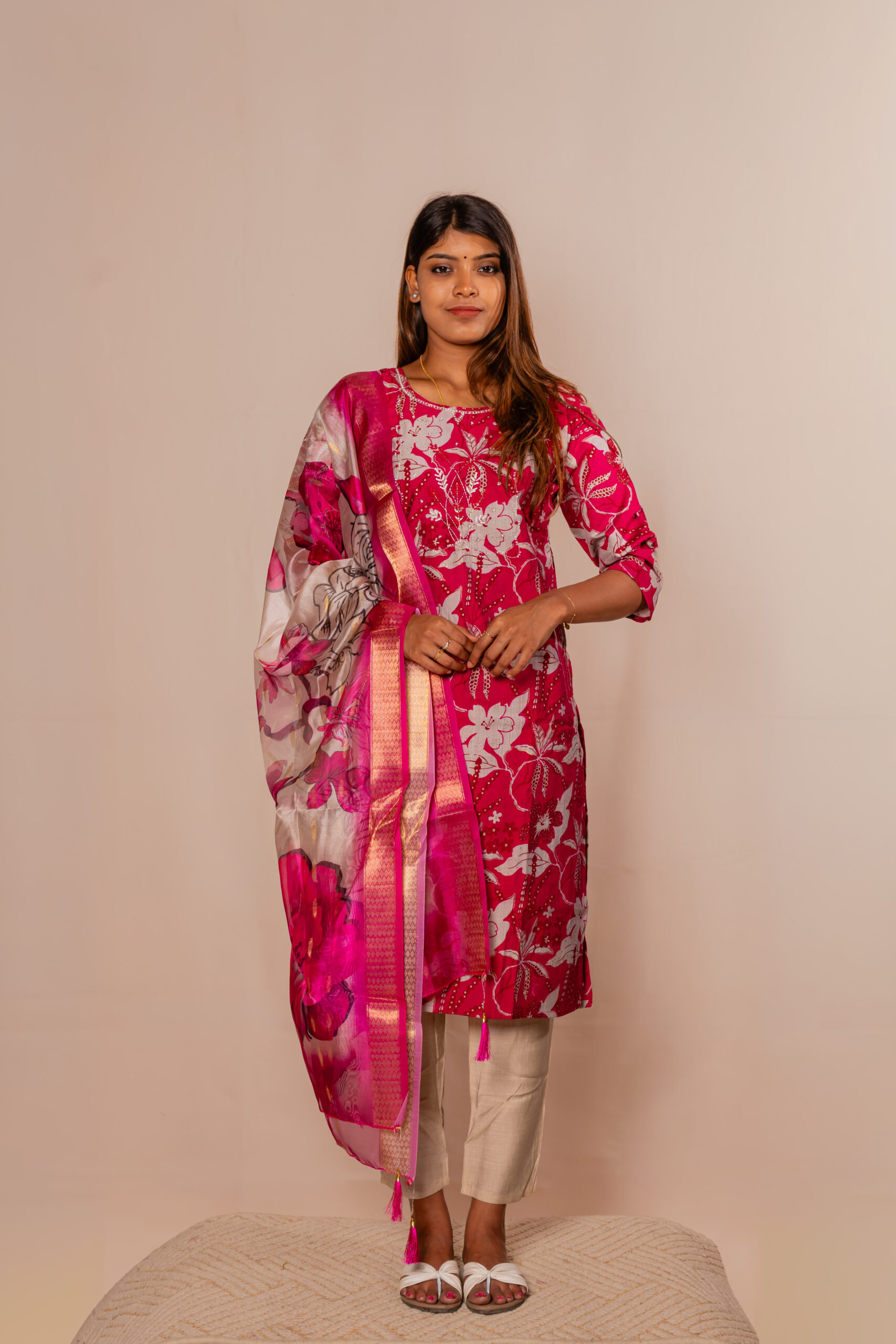 Add a vibrant touch to your ethnic wardrobe with this elegant chudidhar set. Crafted in a rich pink hue, the kurti features a beautiful floral print that blends tradition with a modern aesthetic. The straight-cut design with three-quarter sleeves ensures a comfortable yet stylish fit for everyday wear or festive occasions.