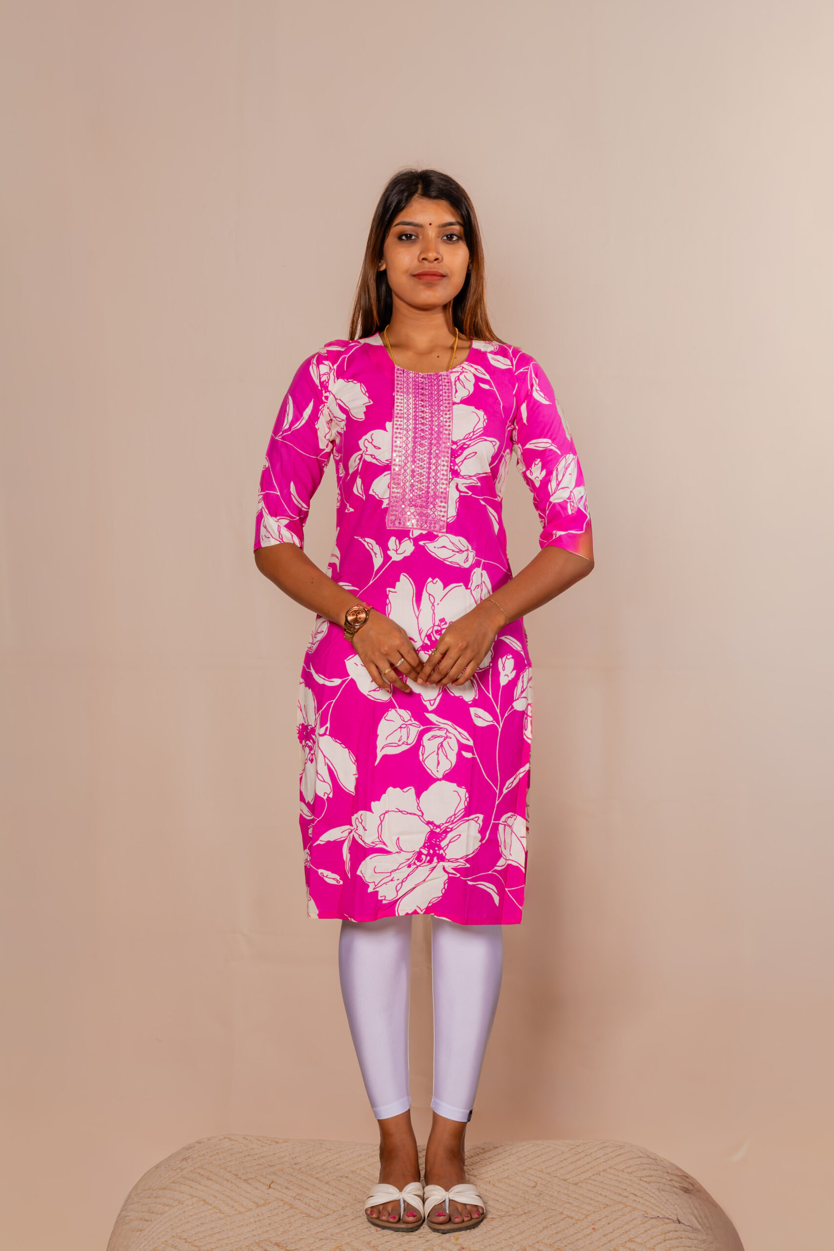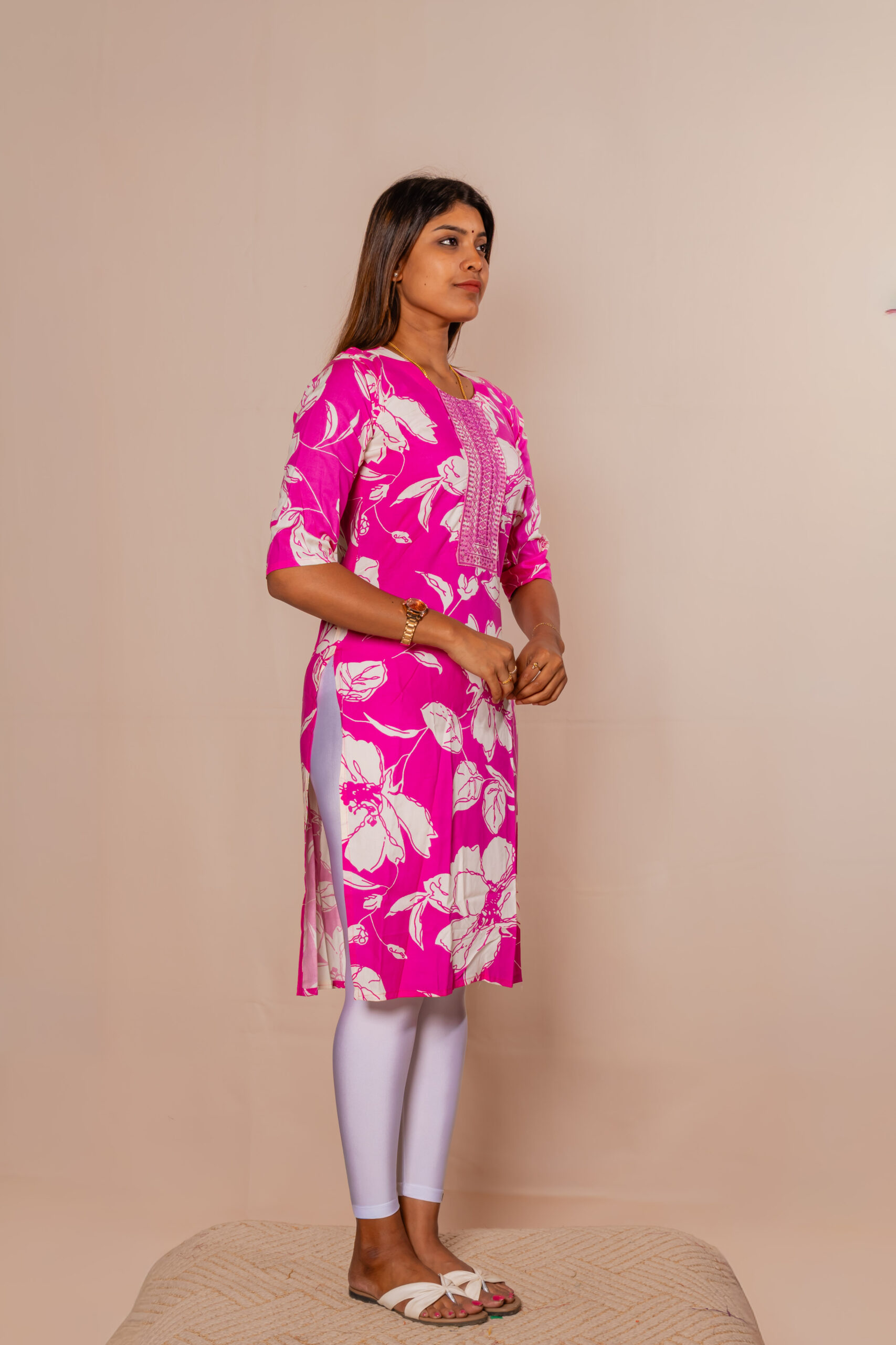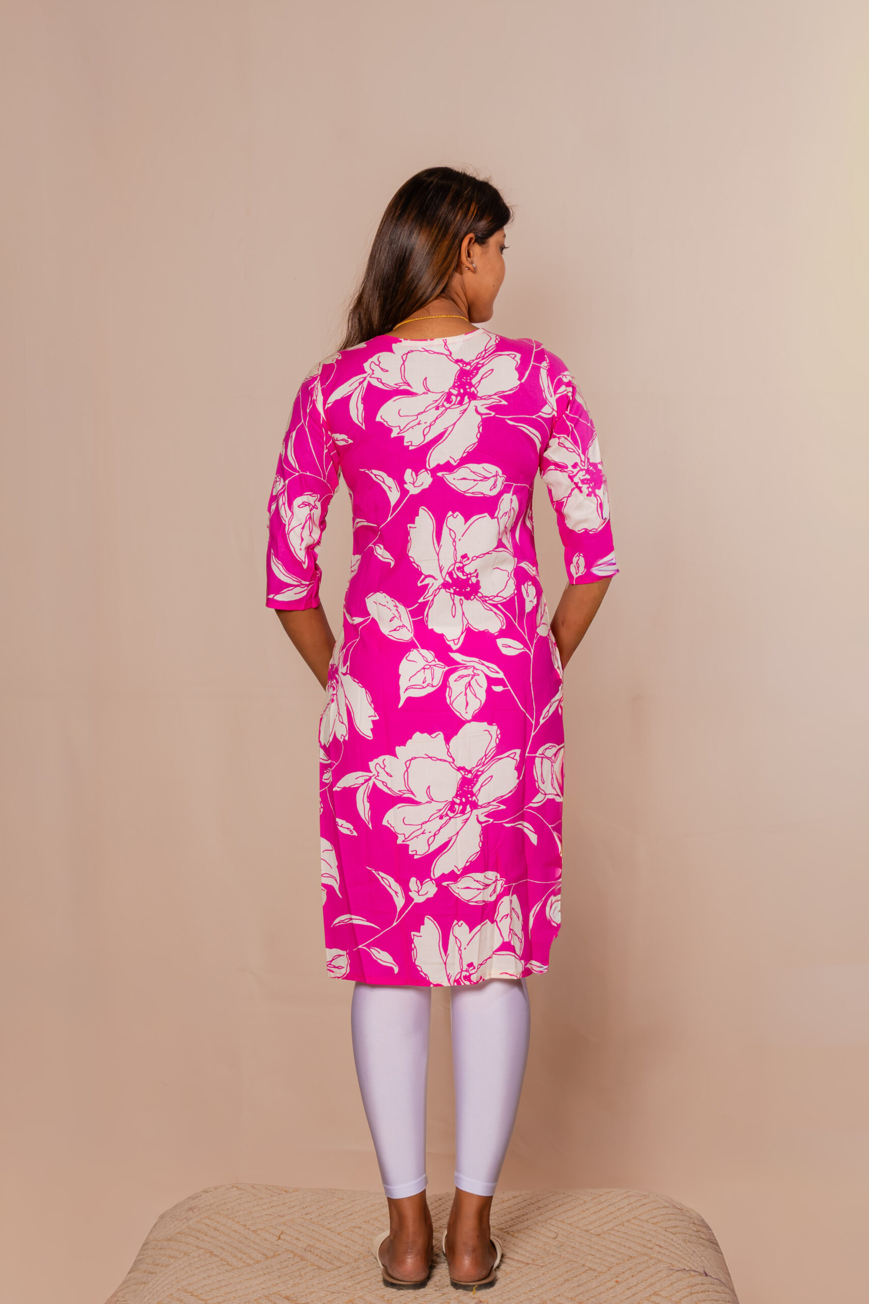 Elevate your everyday style with this vibrant rose printed kurti top, designed to make a bold yet elegant statement. Crafted from soft, breathable fabric, it ensures all-day comfort while keeping you effortlessly chic. The eye-catching white floral patterns add a touch of freshness and charm, perfect for a lively look. Featuring a neatly designed round neckline with a stylish front panel, it enhances your overall appeal. The three-quarter sleeves provide a balanced blend of comfort and sophistication. Pair it with leggings or pants for a complete, graceful outfit.