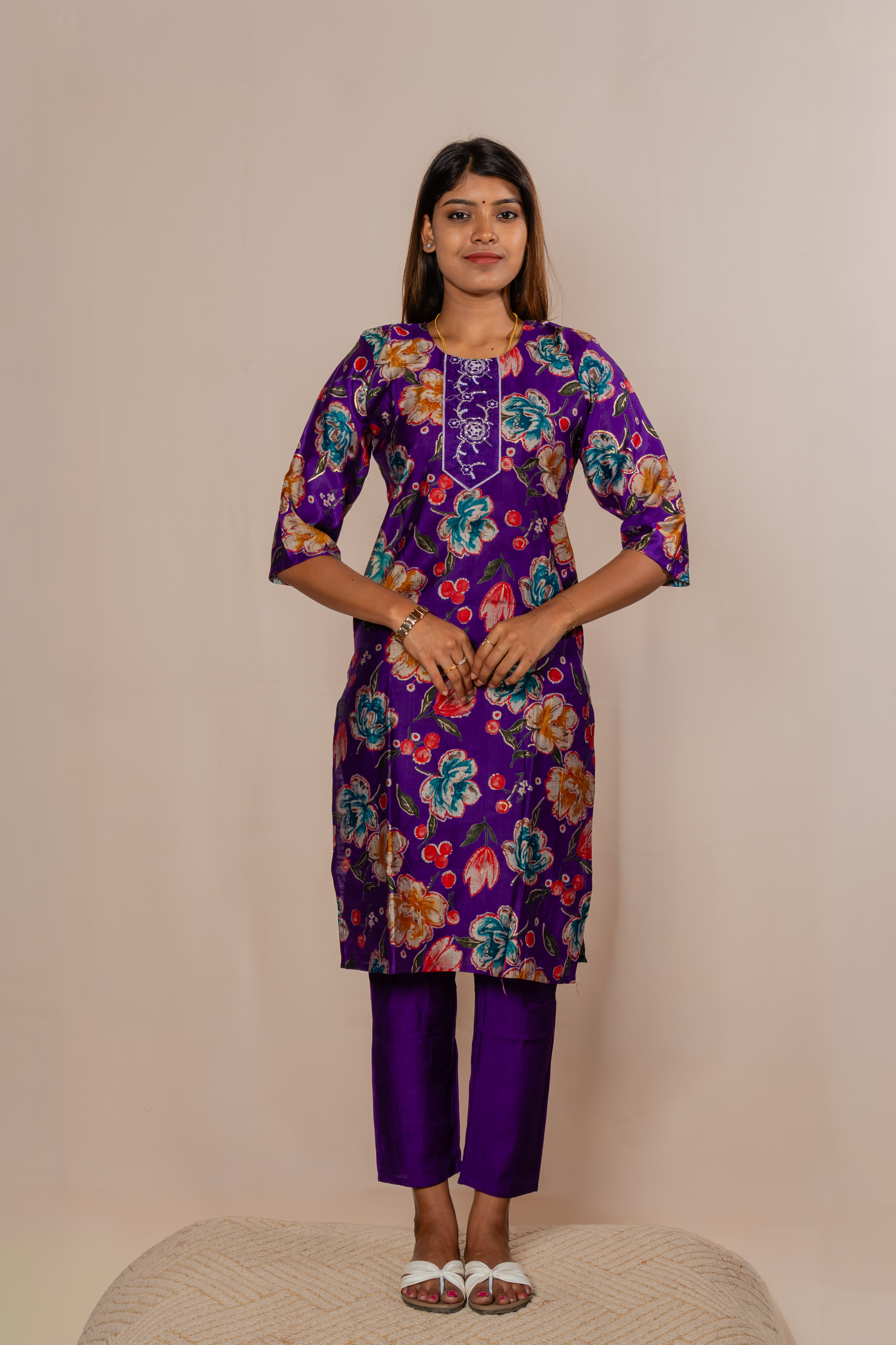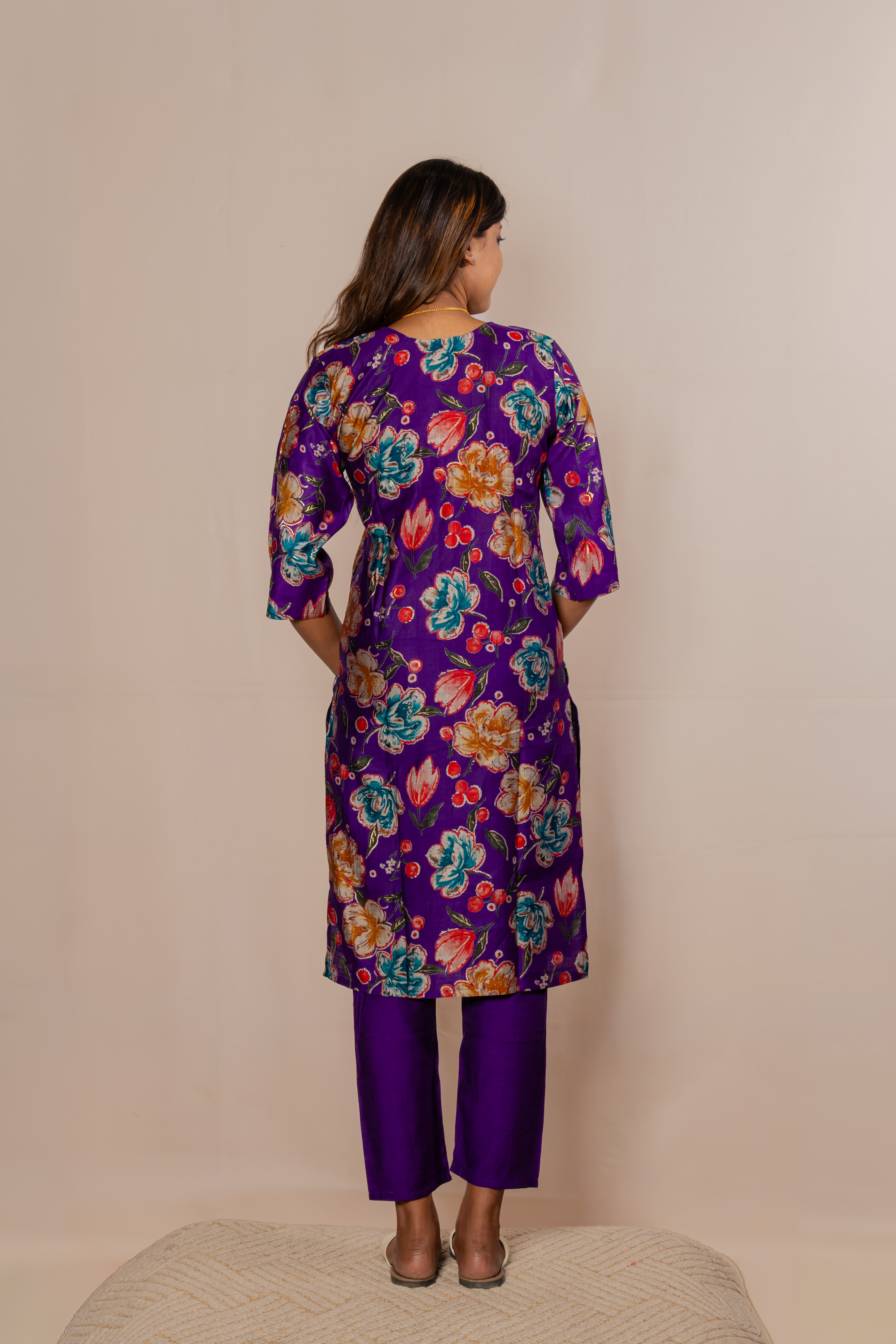 Make a bold statement with this elegant purple co-ord set, crafted to bring together richness and comfort. The floral printed kurta paired with matching bottoms and a beautifully textured dupatta adds a touch of sophistication to your look. Perfect for festive occasions, evening outings, or special gatherings, this ensemble blends vibrant charm with graceful style.