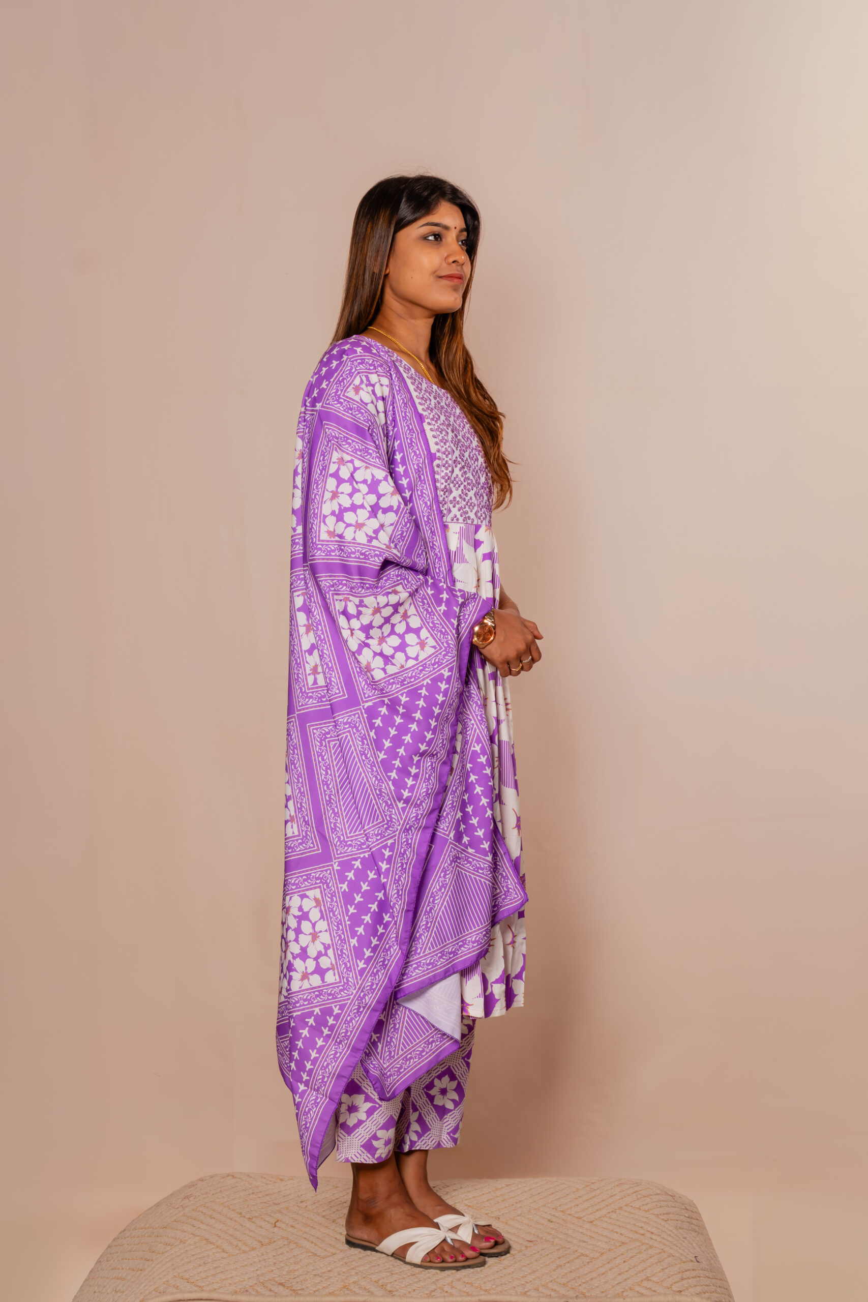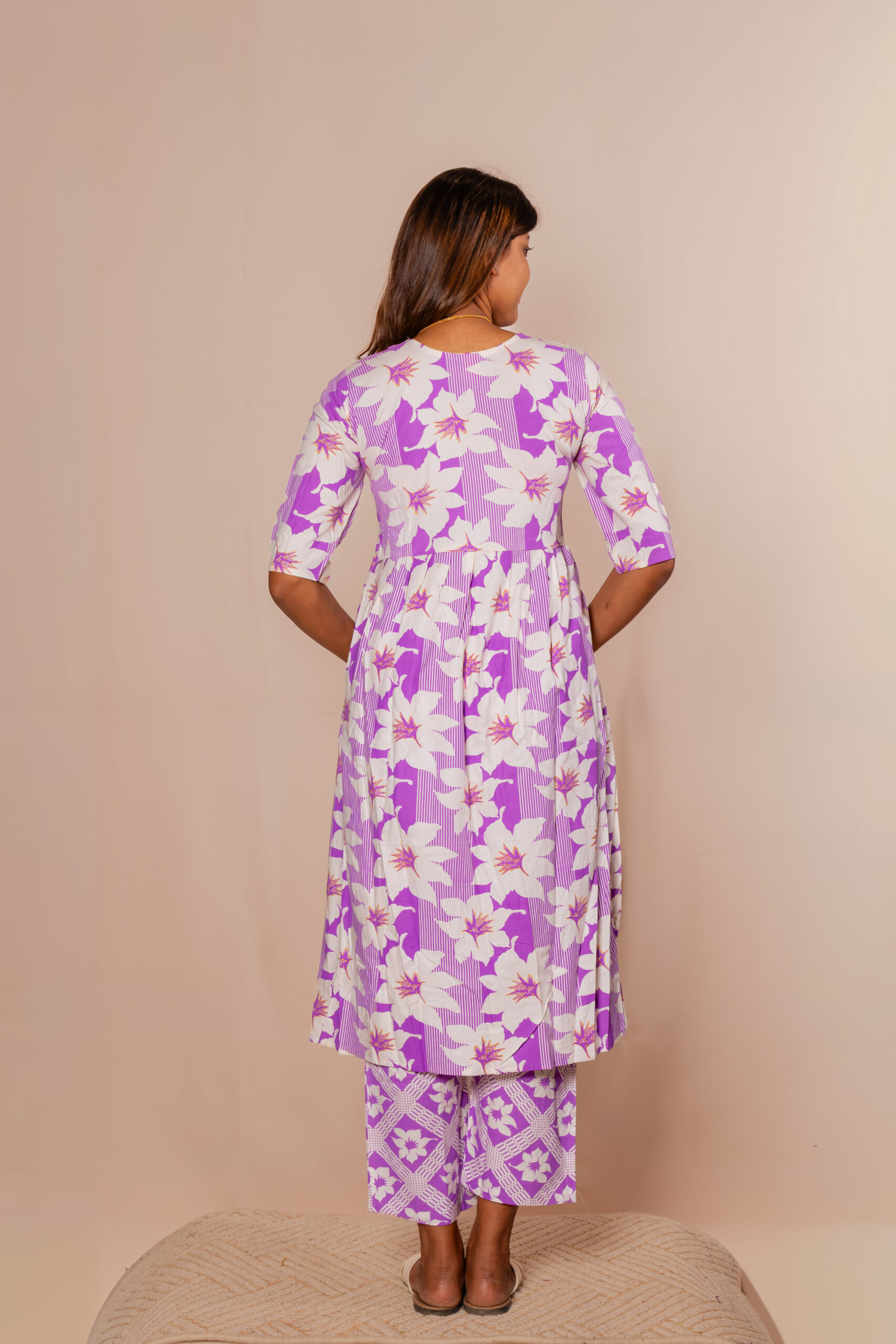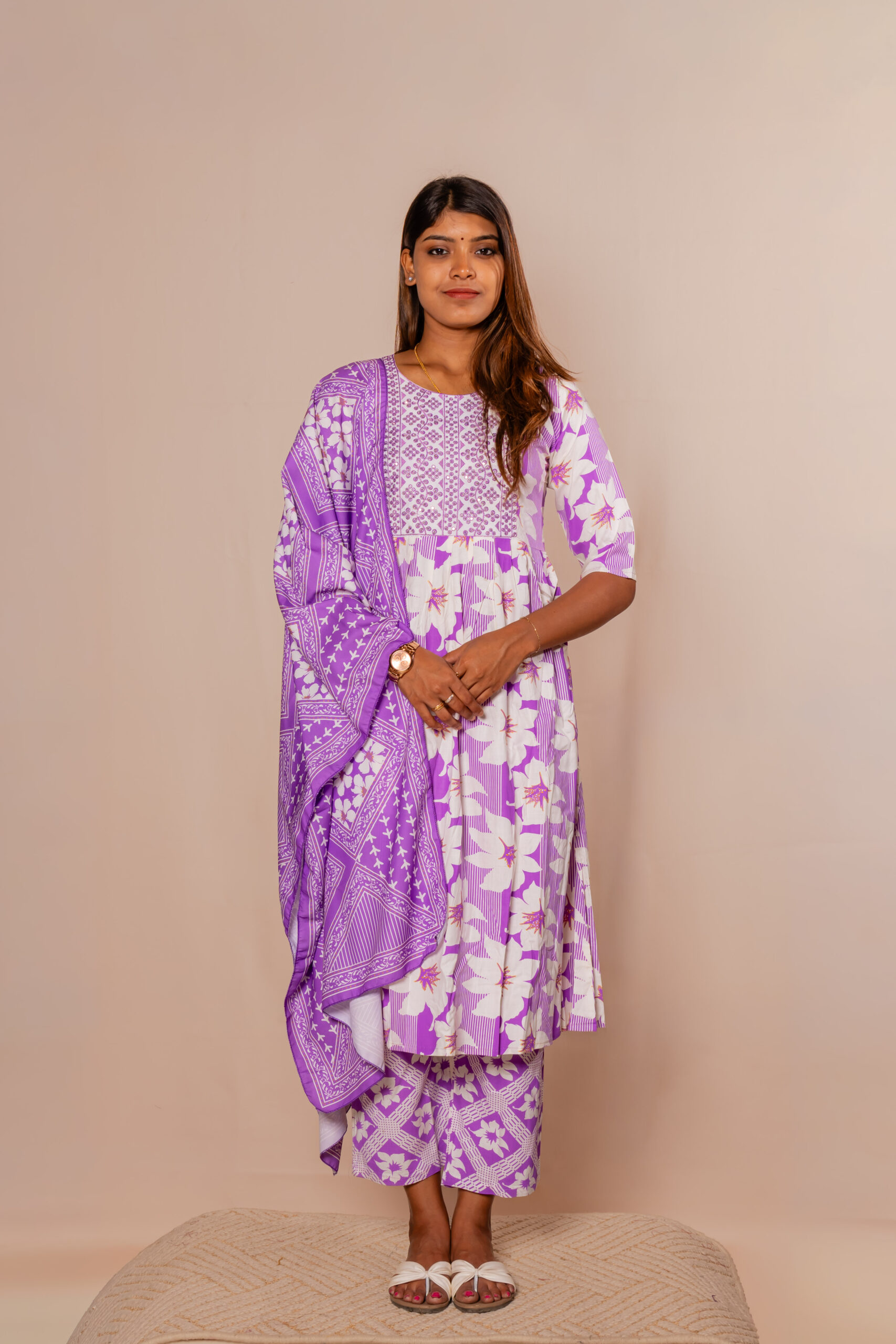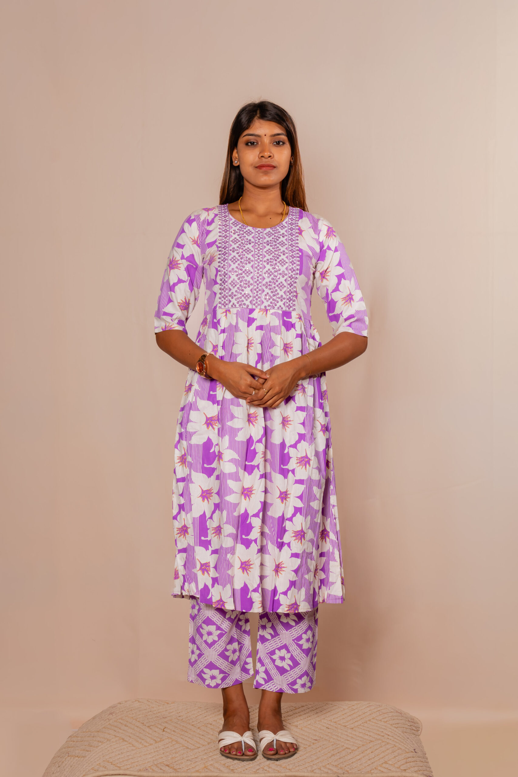 Step into effortless elegance with this graceful Soft lavender kurti set, designed to bring out a soft and refreshing ethnic charm. The kurti features a soothing floral print combined with delicate detailing on the yoke, creating a perfect blend of simplicity and style. Its flared silhouette offers a comfortable and flowy fit, ideal for all-day wear.
