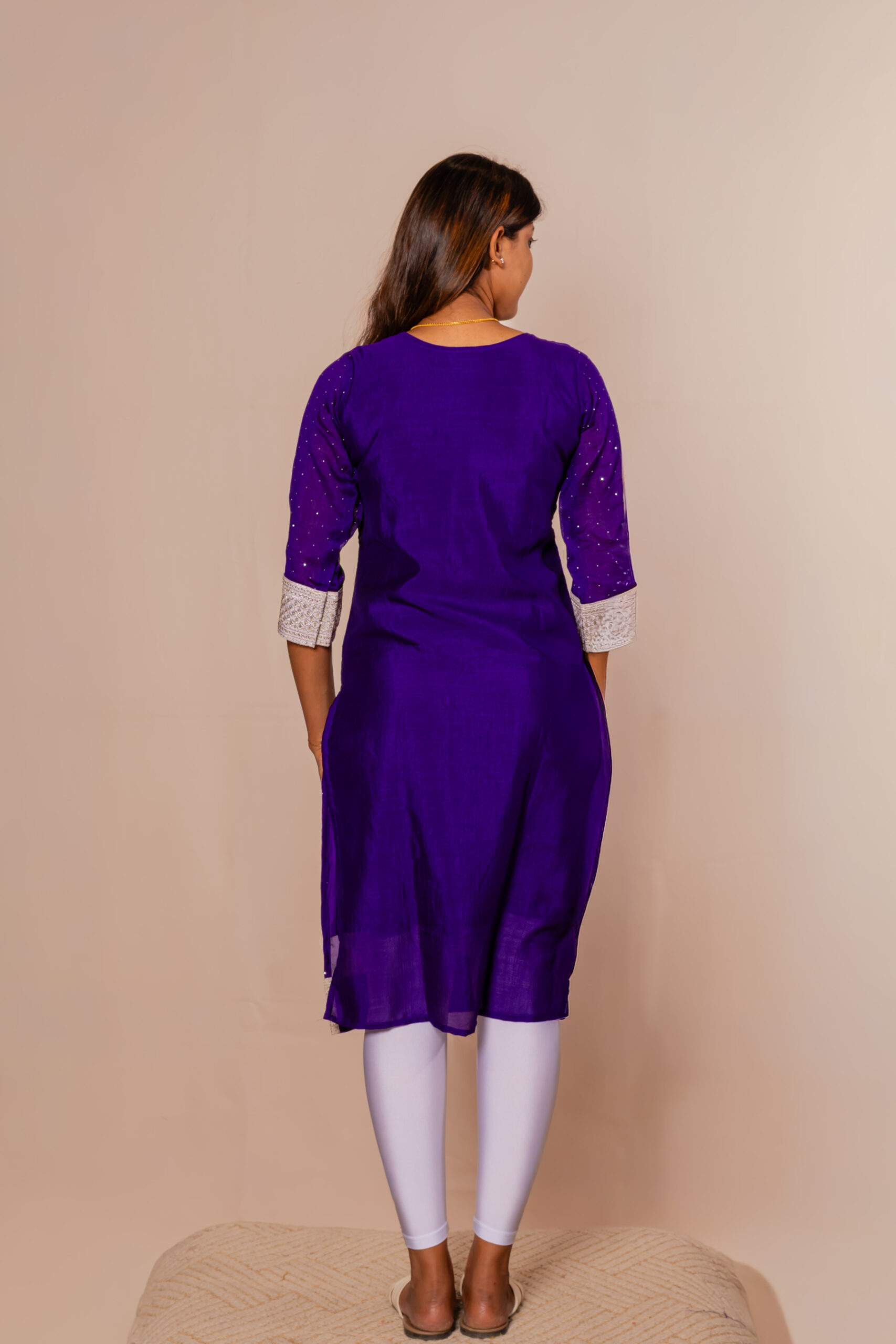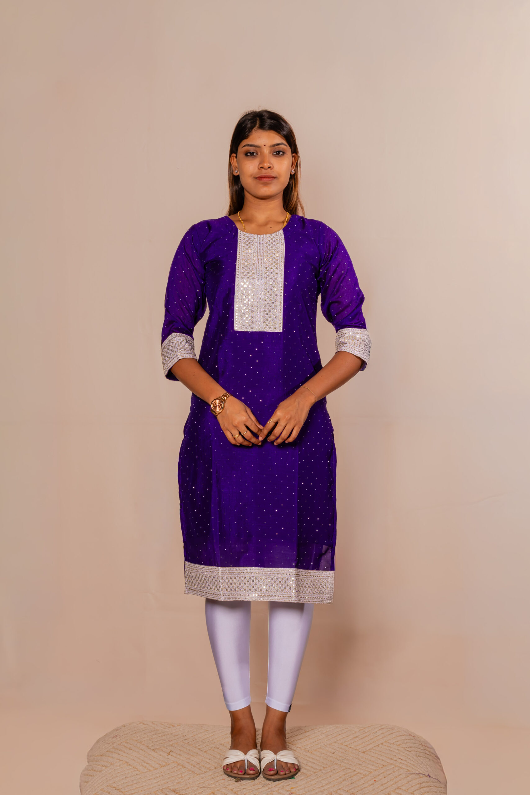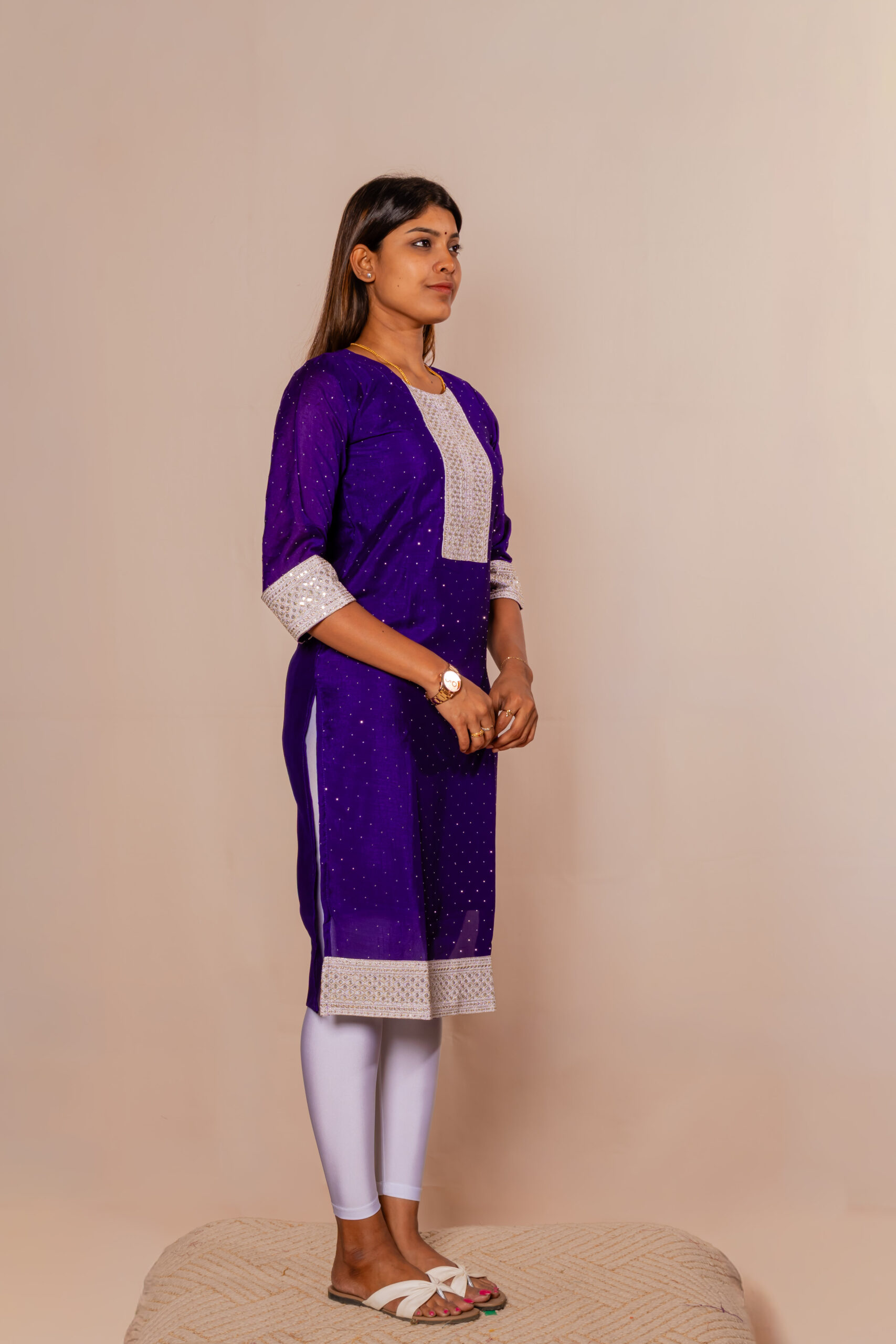 Enhance your ethnic wardrobe with this elegant violet kurti top adorned with subtle shimmer detailing. The beautifully embroidered front panel and sleeve borders add a touch of festive charm. Crafted from soft, breathable fabric, it ensures comfort while maintaining a refined look. Designed with a straight fit and three-quarter sleeves, it offers both style and ease. Perfectly pairs with leggings or pants for a graceful and polished appearance.