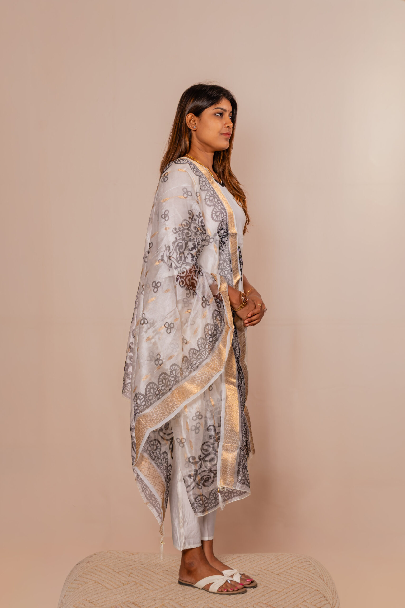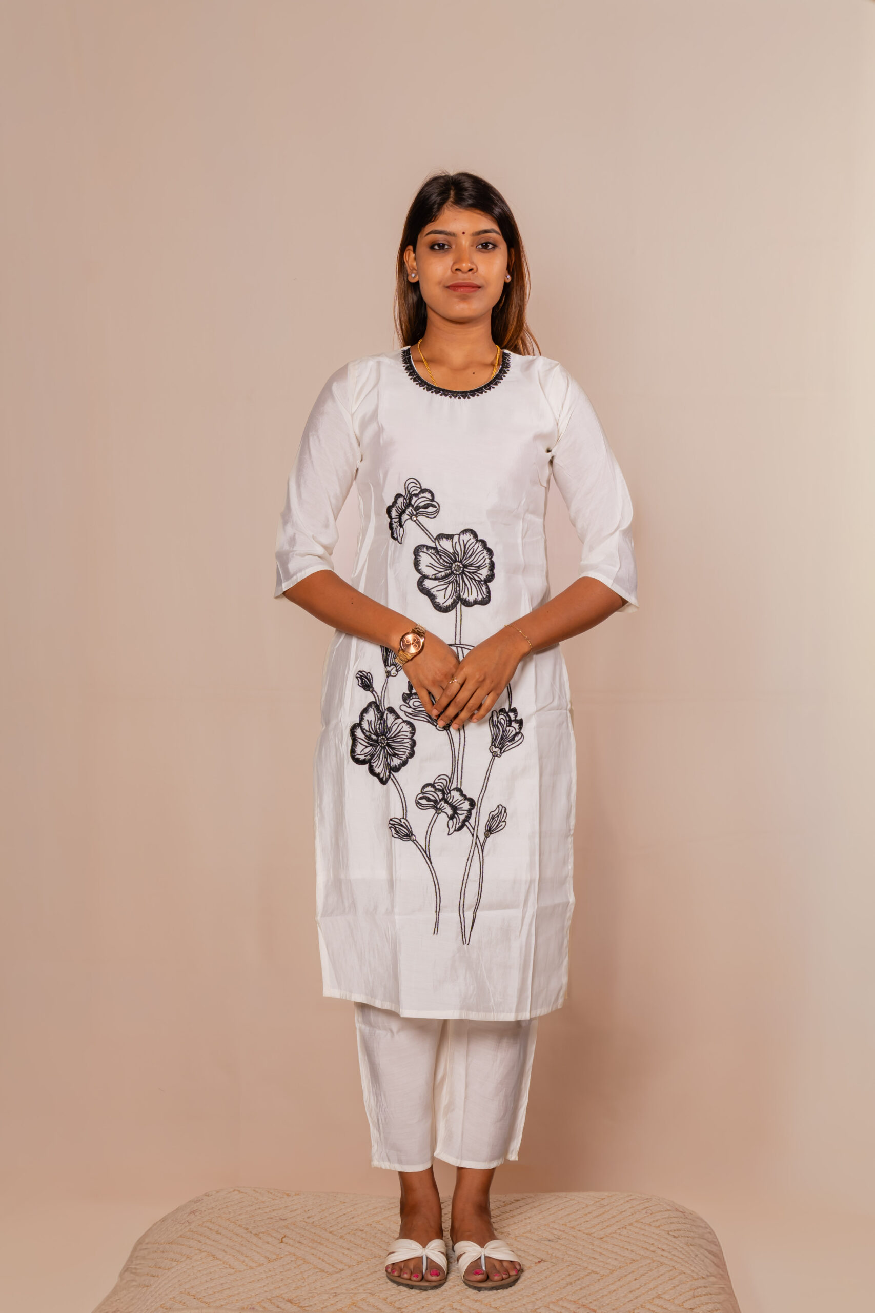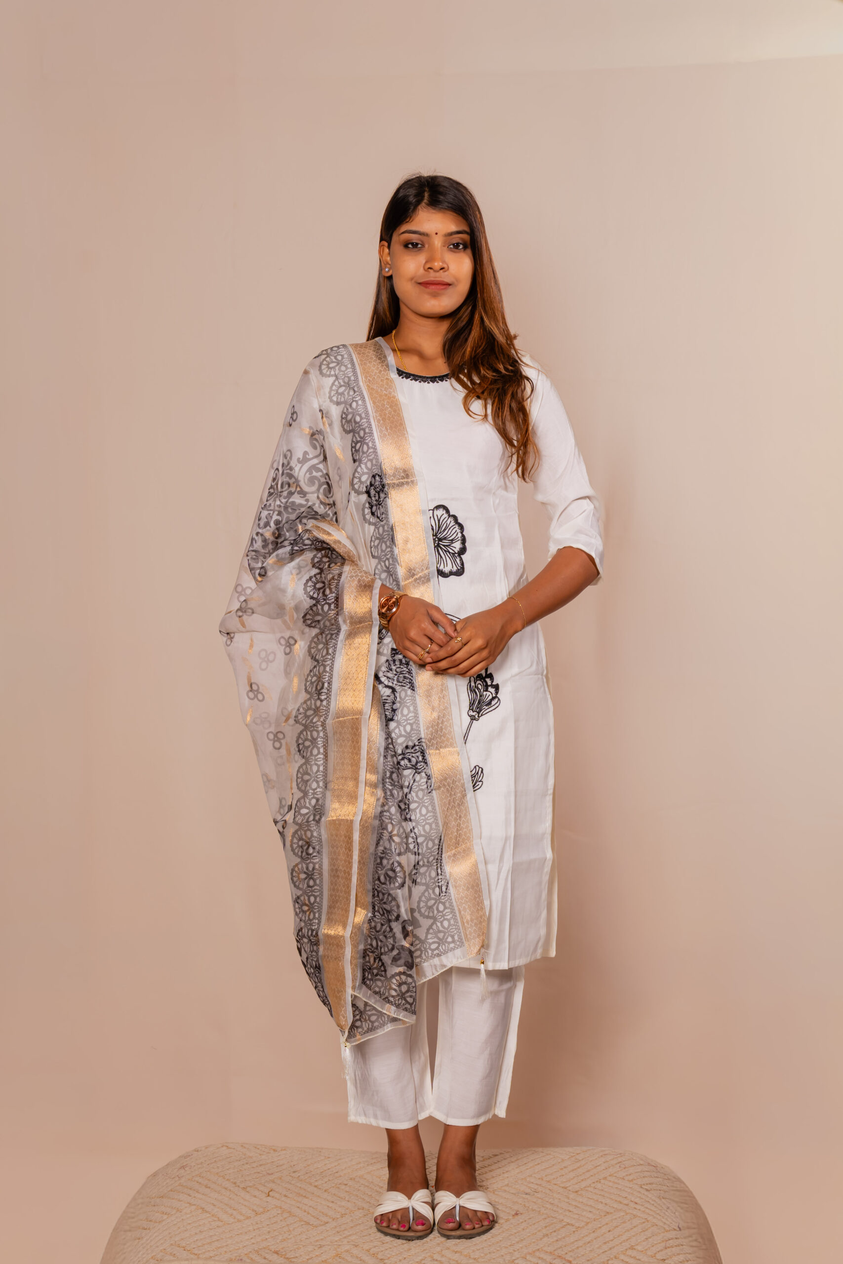 This elegant white ethnic set features a beautifully tailored kurta paired with matching straight pants, offering a clean and graceful look. The outfit is highlighted with subtle black floral embroidery that add a touch of sophistication. It comes with a sheer dupatta adorned with intricate patterns and a rich golden border for a festive charm. Crafted from lightweight, breathable fabric, it ensures all-day comfort and style. Perfect for casual gatherings, festive occasions, or office wear, this ensemble blends tradition with modern elegance.